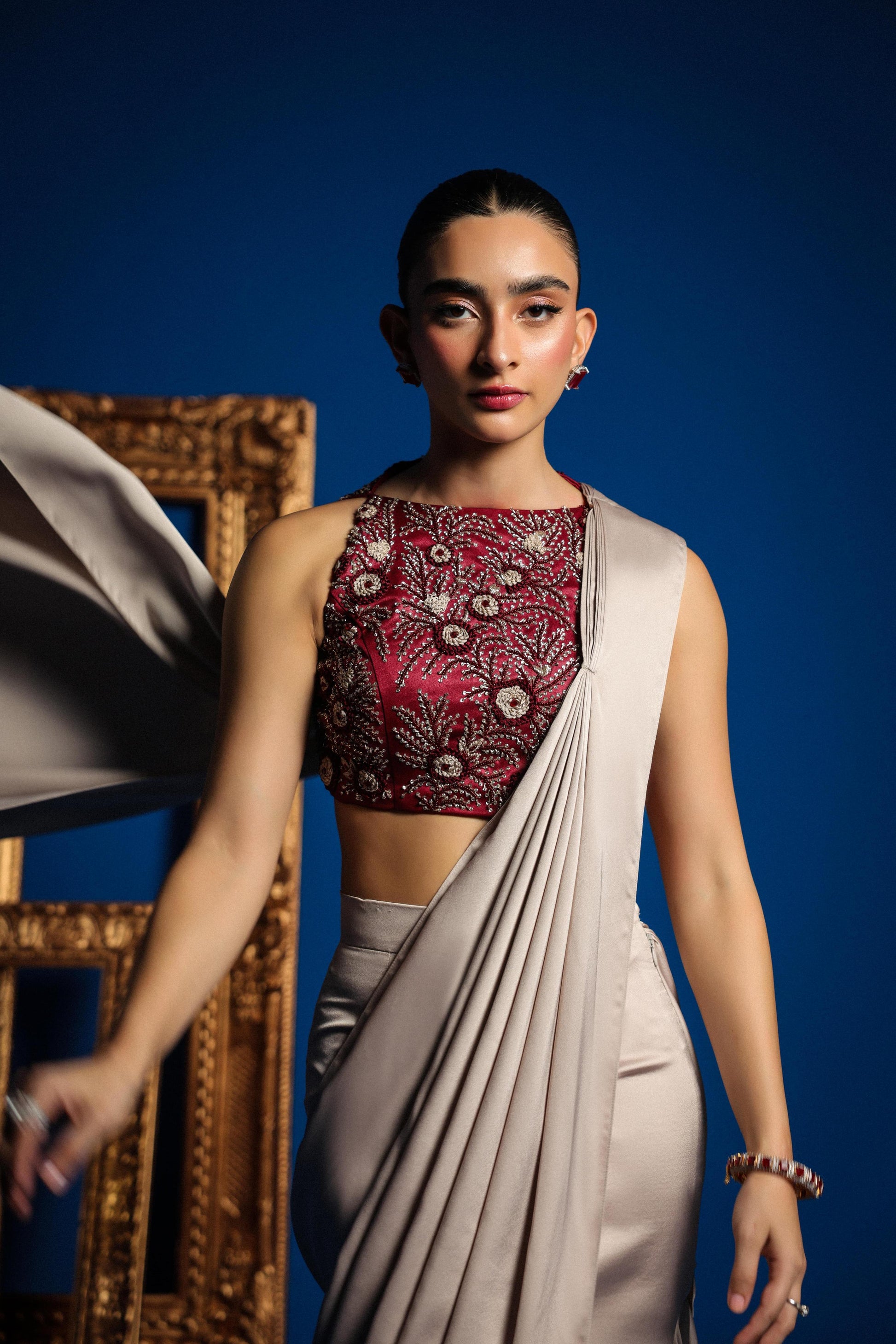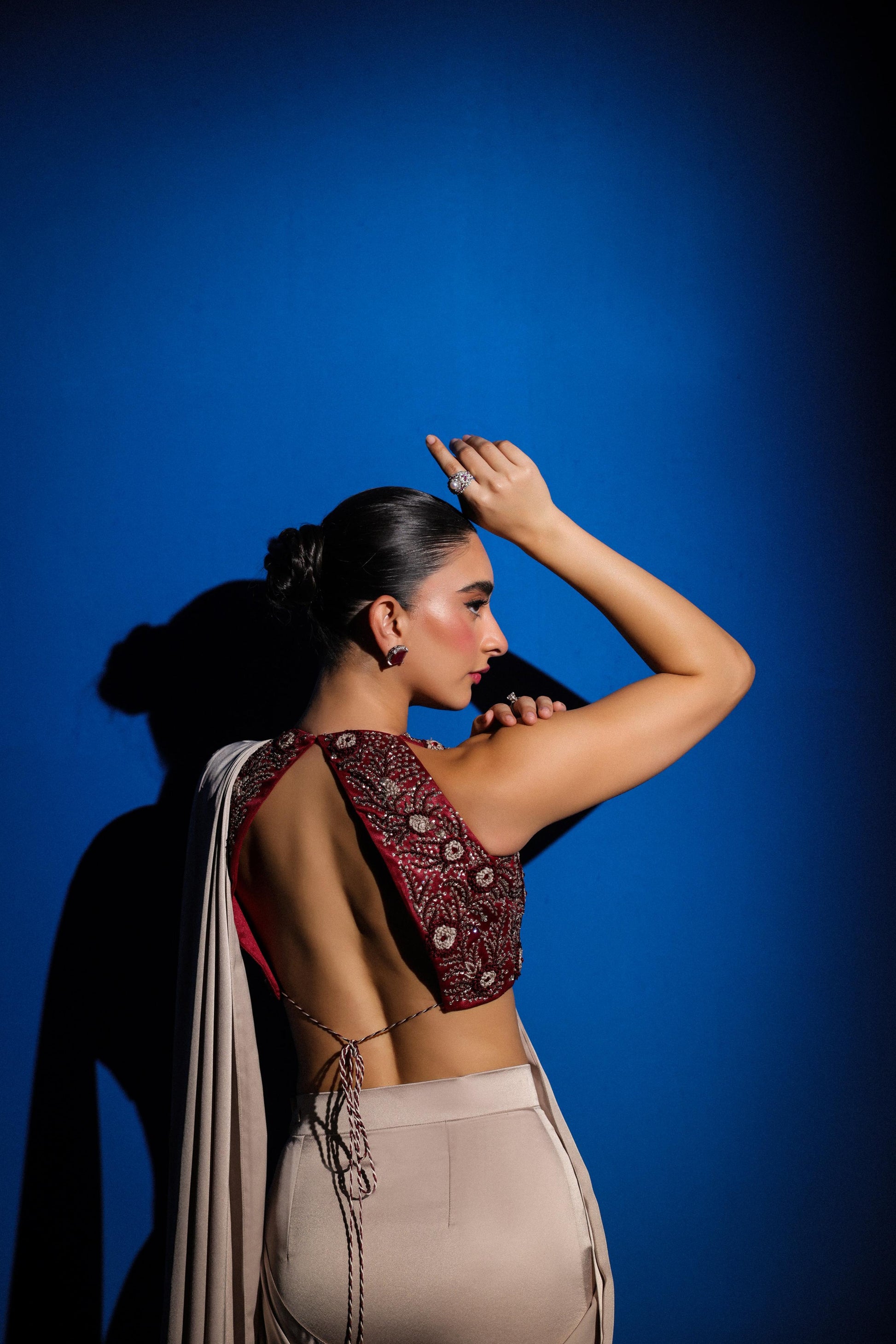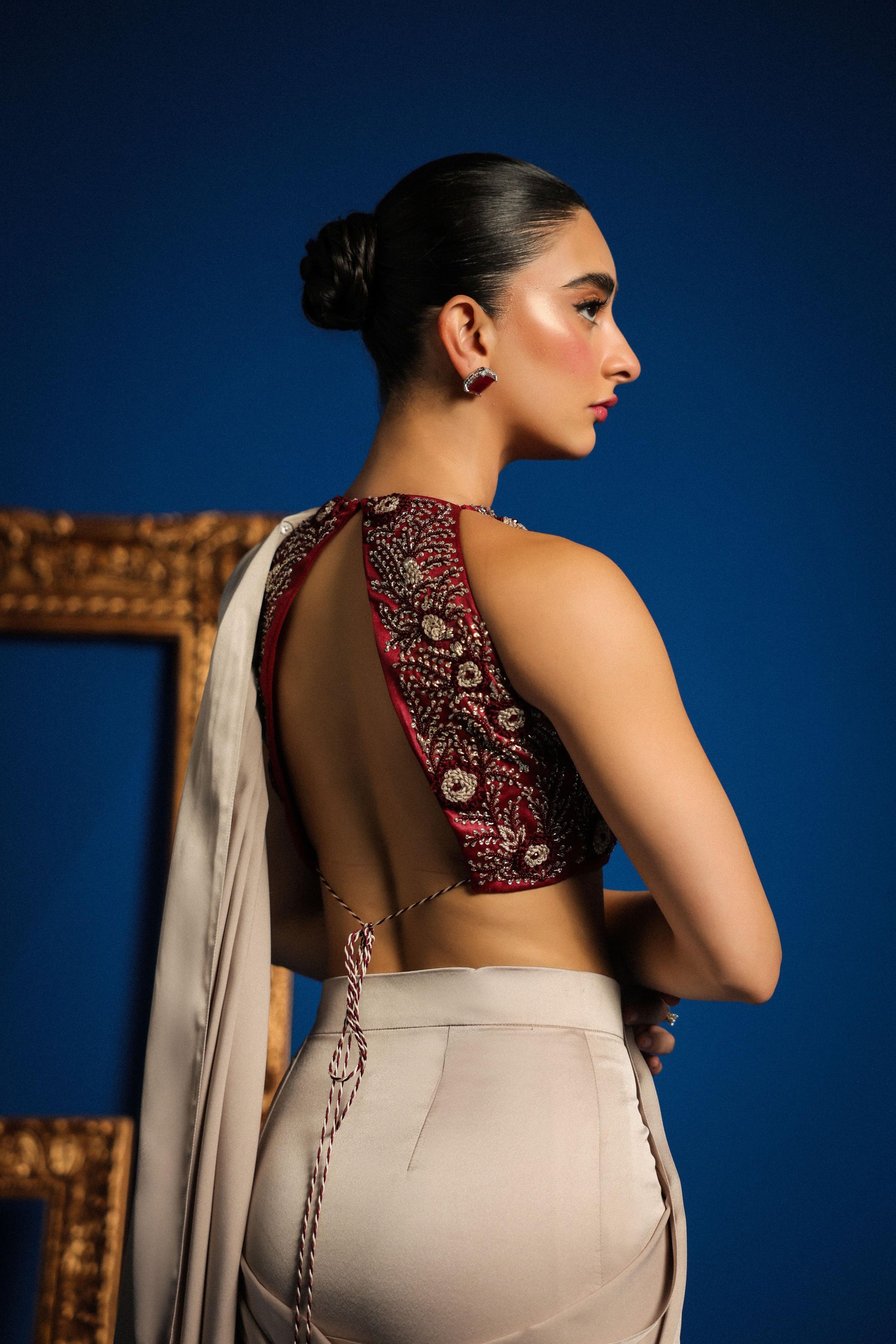 Introducing our Crimson Elegance Ensemble, a striking fusion of modern minimalism and traditional artistry. This contemporary saree look features a silky draped base in a refined neutral hue, perfectly paired with a hand-embroidered maroon blouse that radiates the confidence.