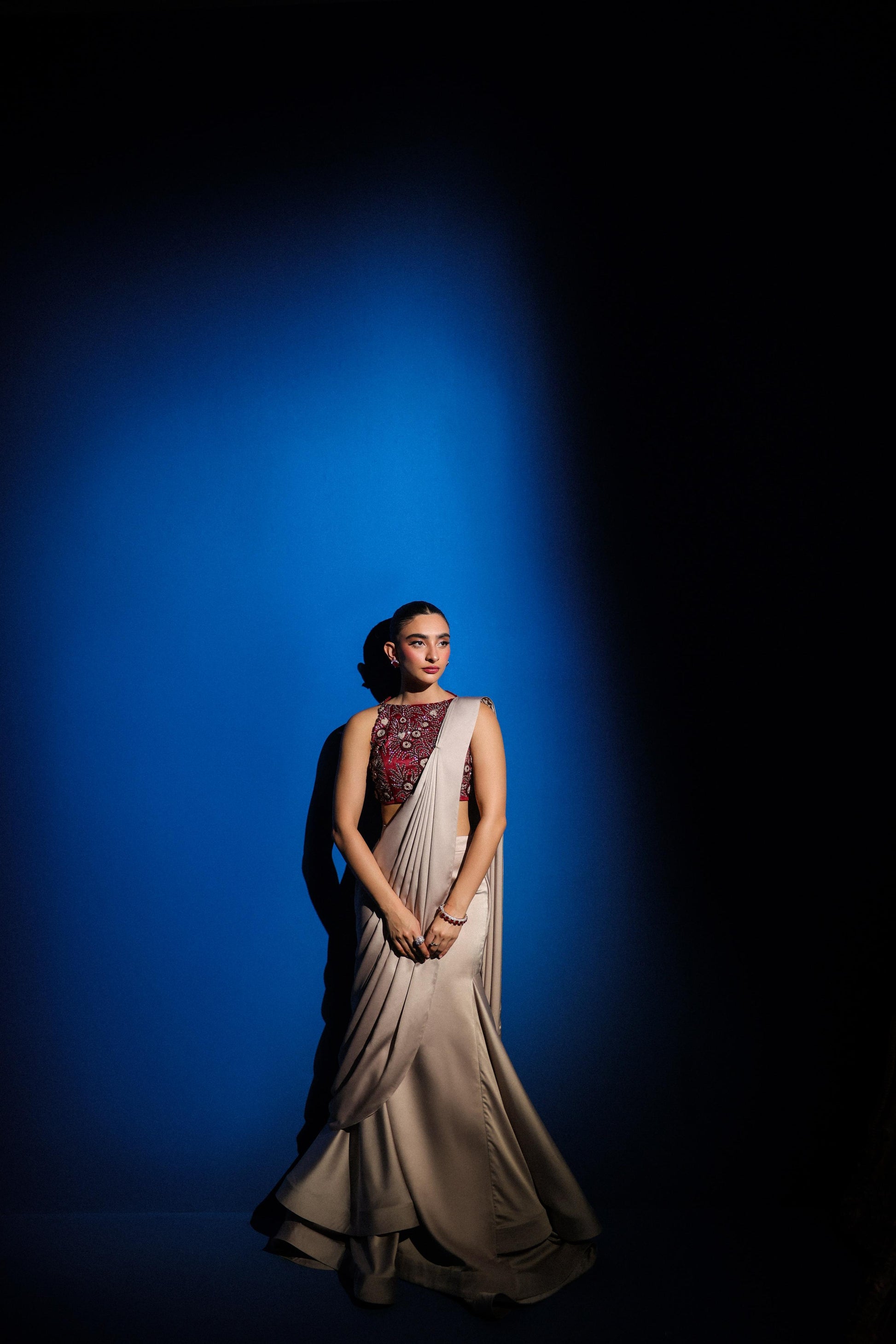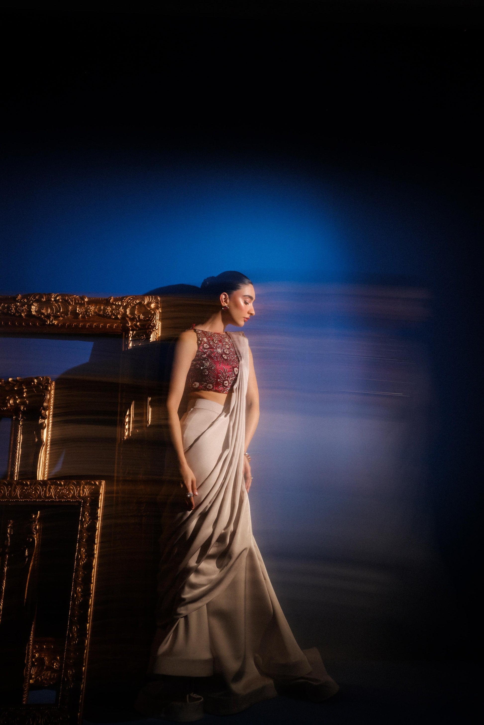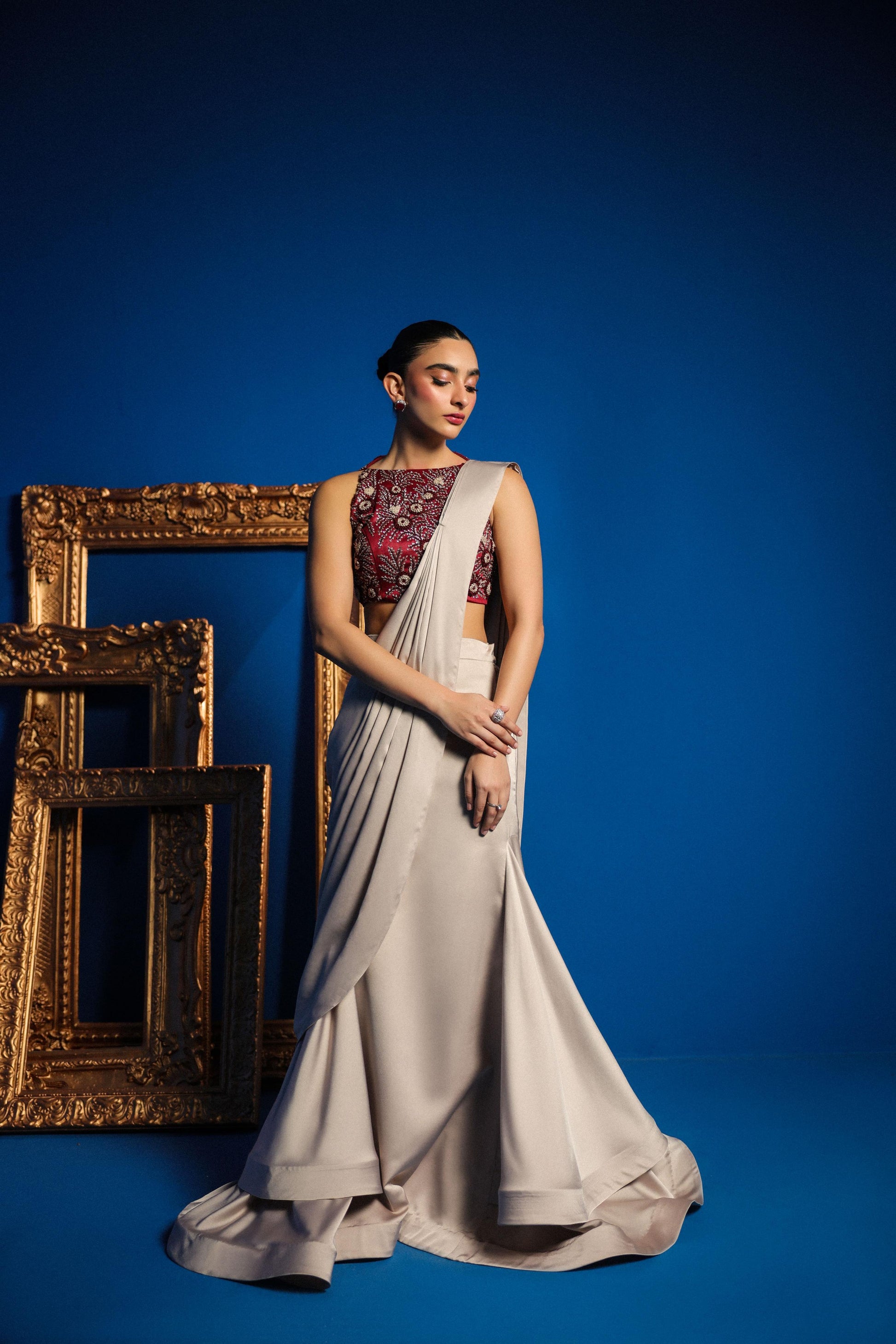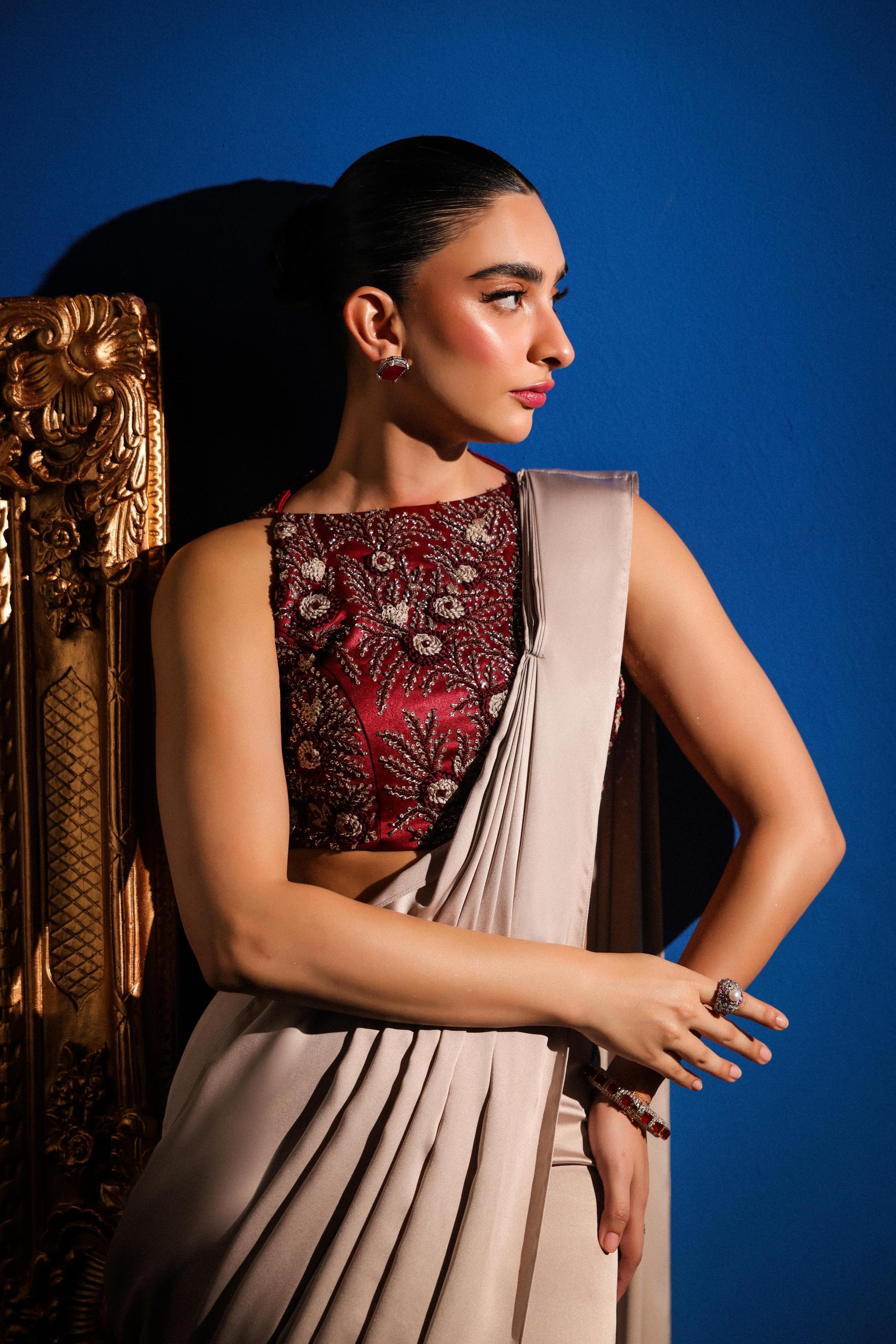 Introducing our Crimson Elegance Ensemble, a striking fusion of modern minimalism and traditional artistry. This contemporary saree look features a silky draped base in a refined neutral hue, perfectly paired with a hand-embroidered maroon blouse that radiates the confidence.