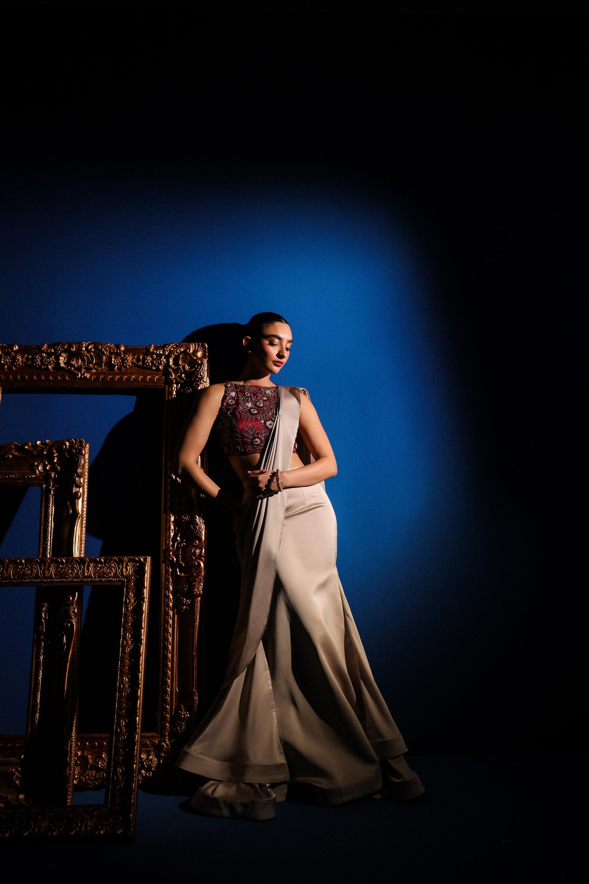 · Contemporary drape saree minimalist, fluid draping in a soft neutral tone for effortless elegance