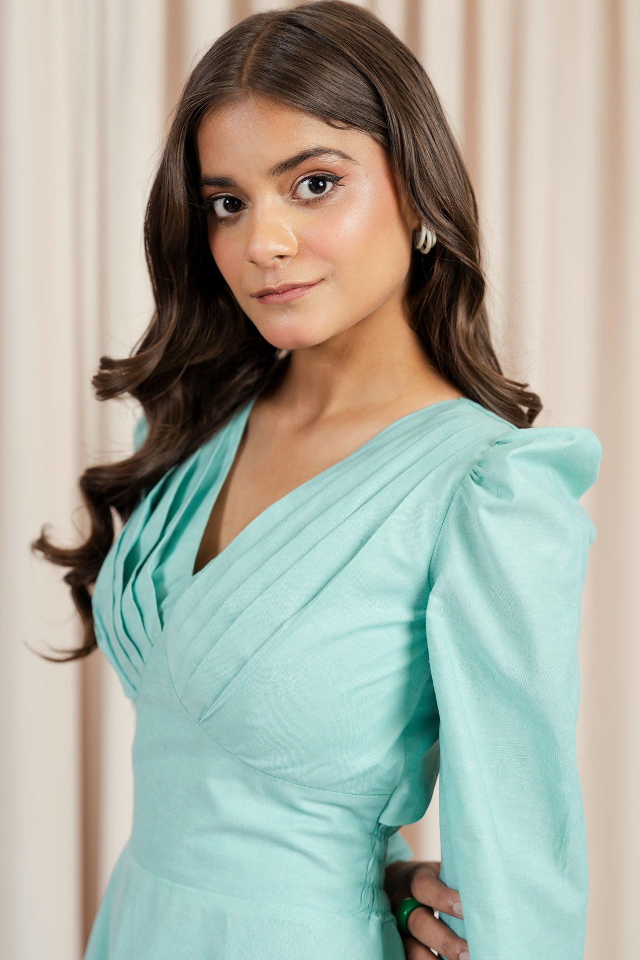 · A deep V-neckline with structured pleating on both sides enhancing the bodice with an artistic flair