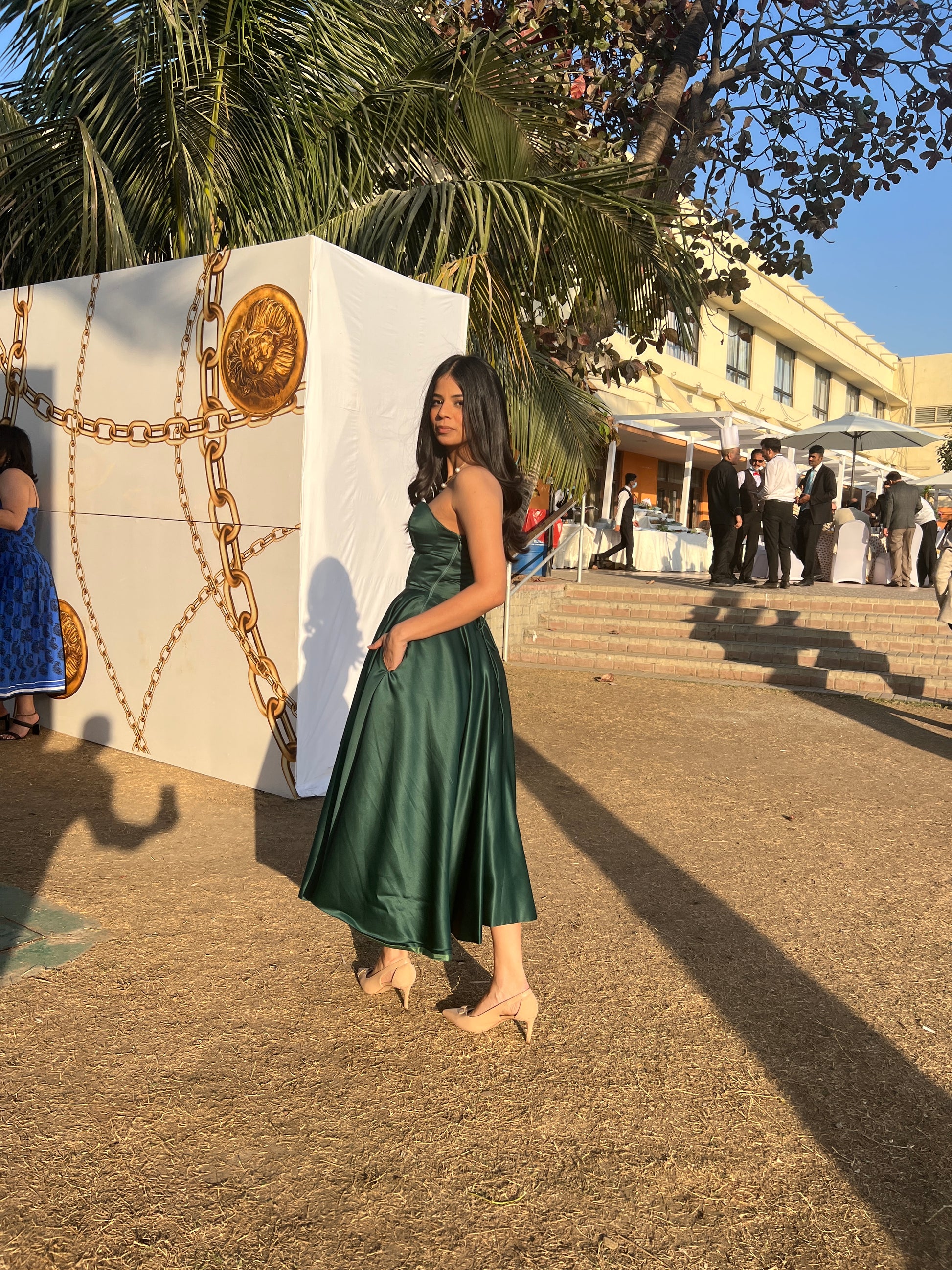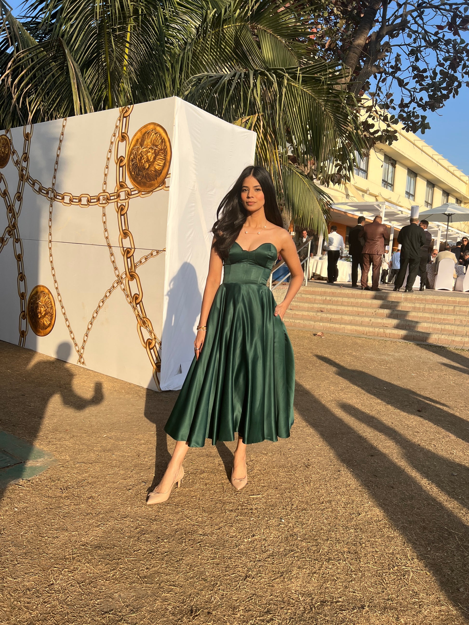 This stunning emerald green premium silk dress is a masterpiece of elegance and sophistication. The strapless design features a sweetheart neckline, accentuating the wearer's curves, while the fitted bodice cinches at the waist, creating a flattering silhouette. The full, flowing skirt falls just below the knee, exuding a sense of refinement and poise. Crafted from luxurious silk, the dress boasts a lustrous sheen that catches the light, adding depth and dimension to its already striking color. The emerald green hue is rich and vibrant, making it perfect for formal occasions such as weddings, galas, or red-carpet events.