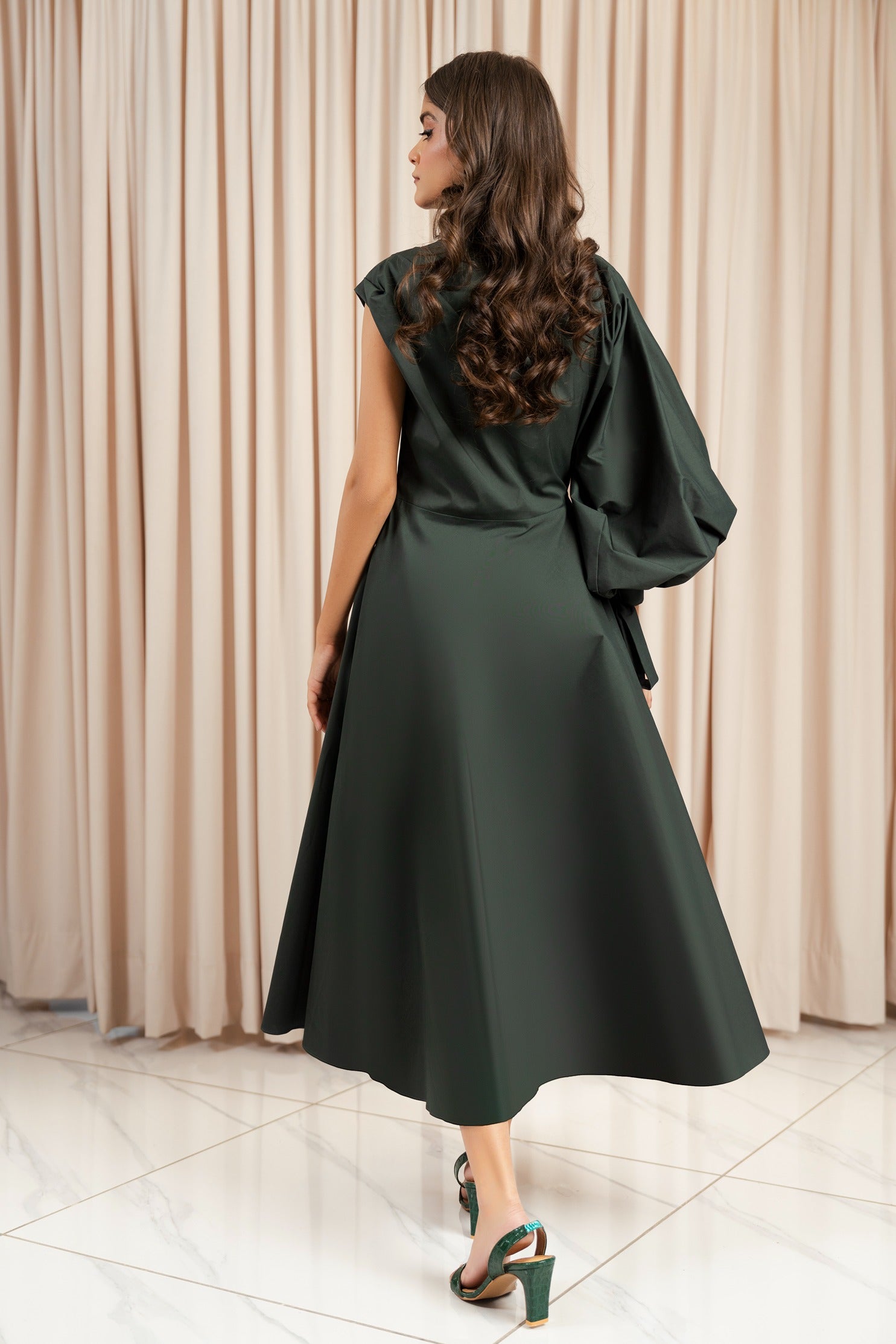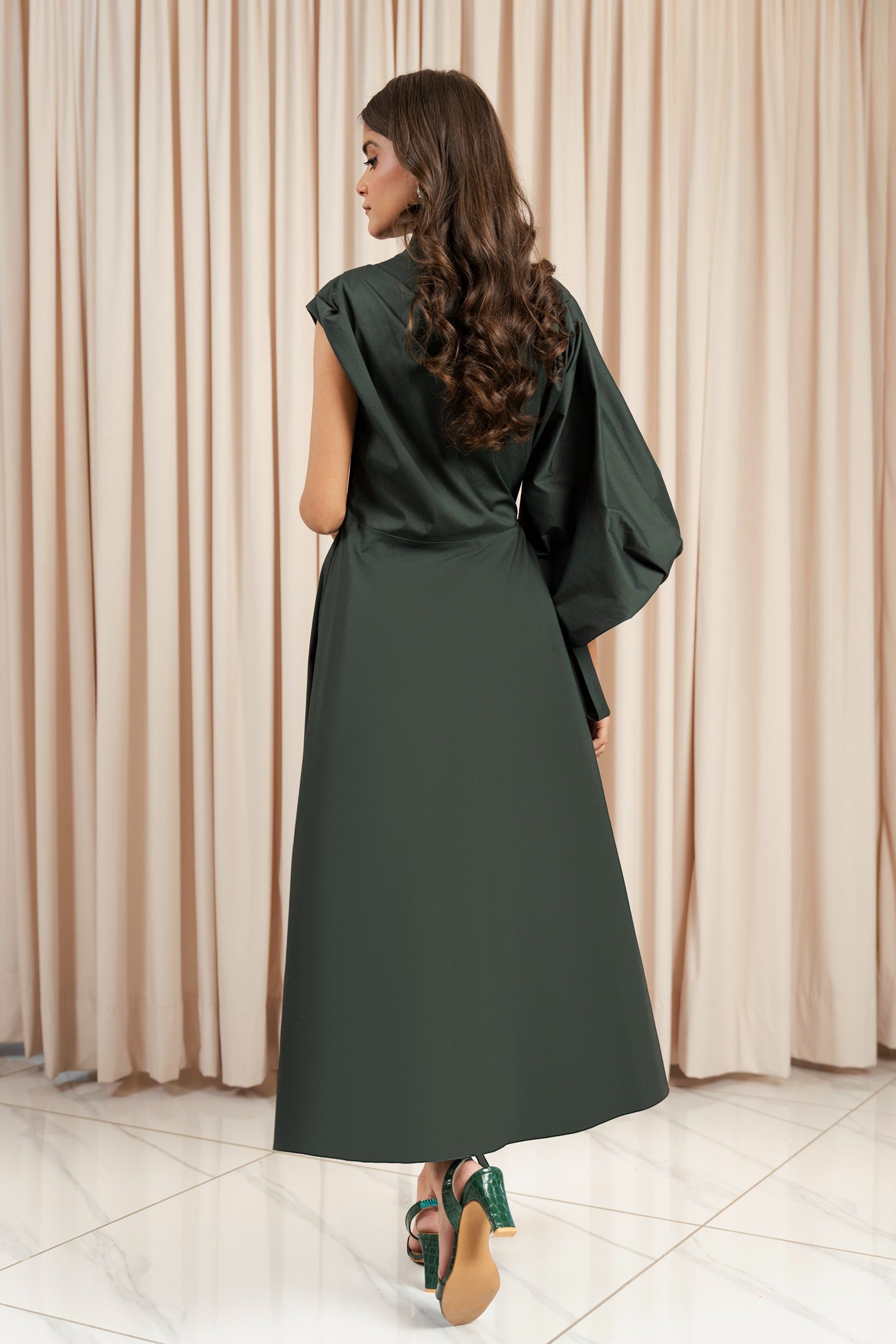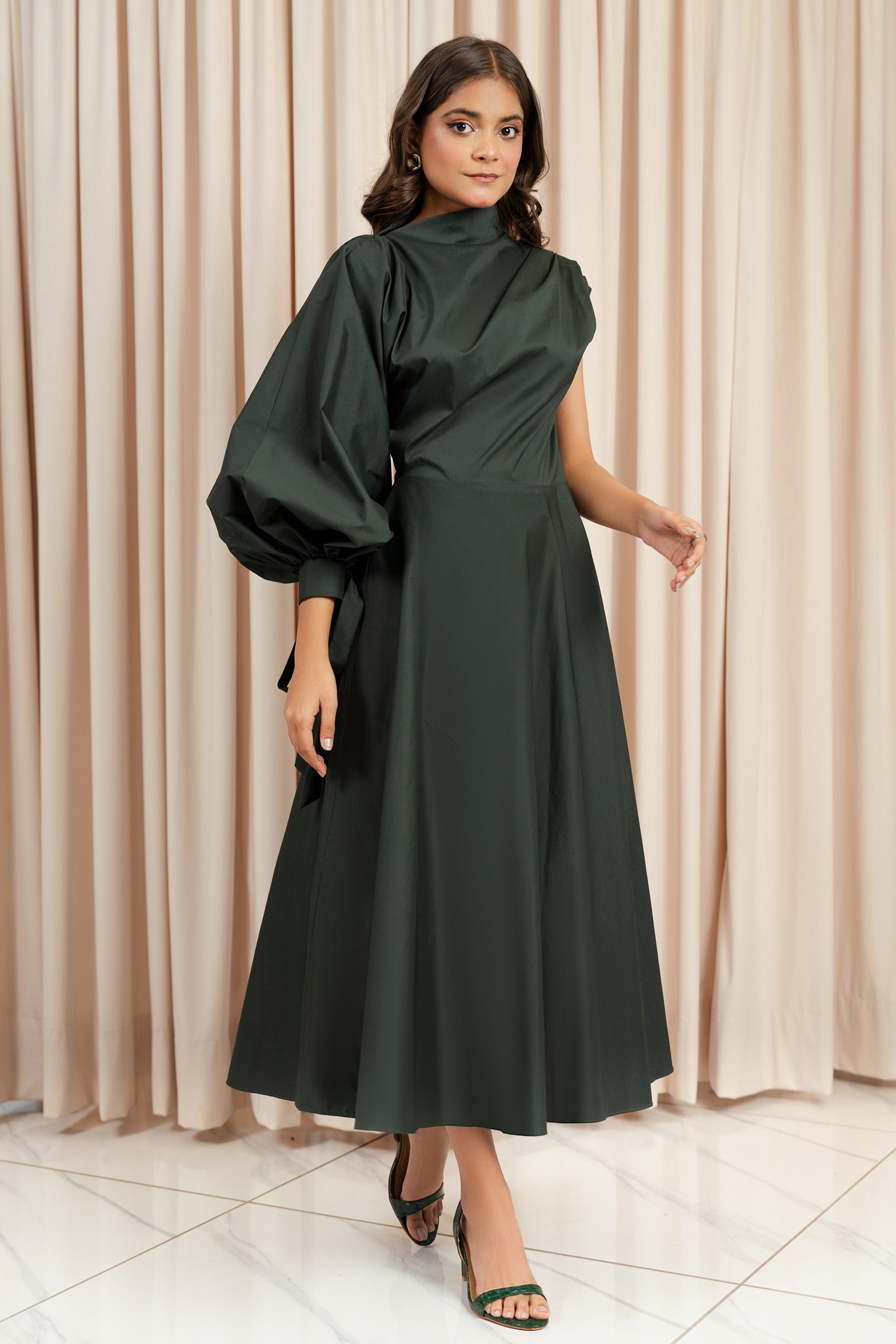 · Draped shoulder on one side, while full-length voluminous sleeve with a gathered cuff and tie detail on the other side