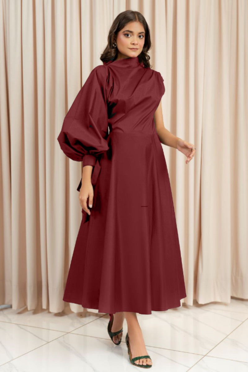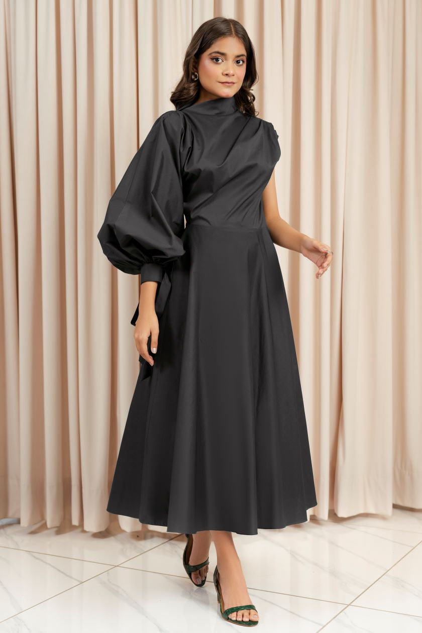This elegant western dress is a statement piece that blends contemporary asymmetry with classic sophistication. This casual wear designed for those who love bold yet refined fashion, creating a dramatic yet balanced look. The high neckline adds a touch of modesty, making it a perfect choice for formal and semi-formal occasions.