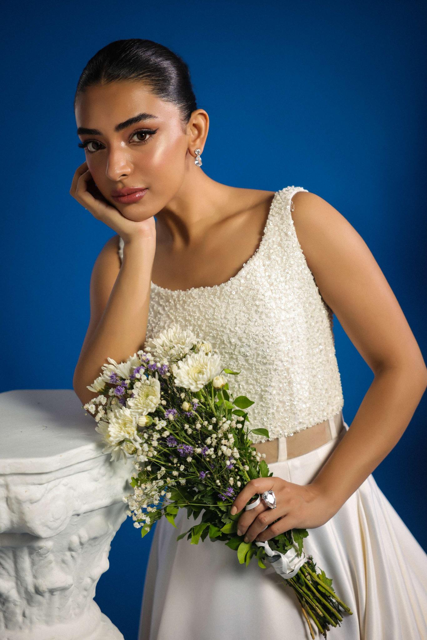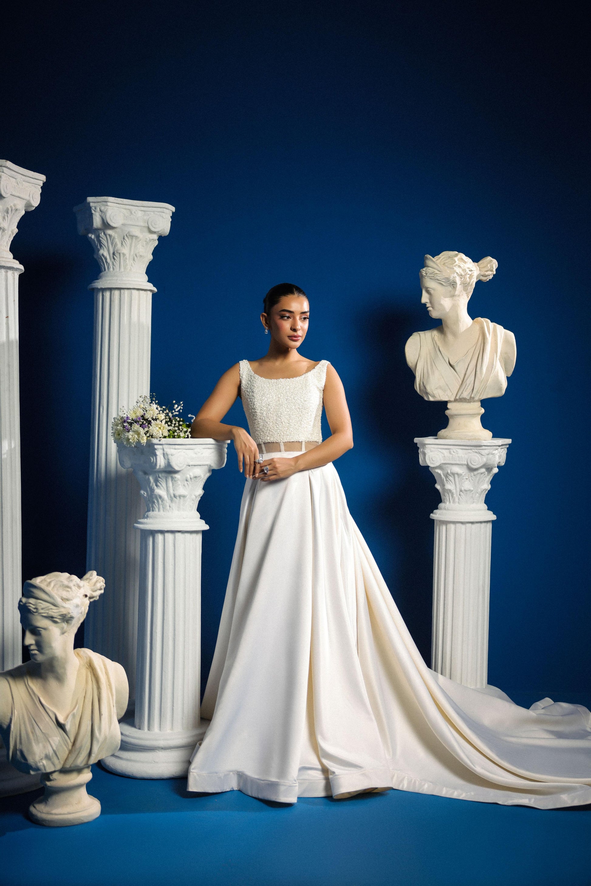 Eterna ivory gown is a timeless piece that speaks of grace and simplicity. The sleeveless bodice is delicately hand-embroidered with fine detailing, adding subtle texture and charm. A soft sheer belt cinches the waist, flowing into a full skirt that drapes beautifully and trails into a long, elegant train. The look is refined yet effortless classic in silhouette but modern in its clean finish.