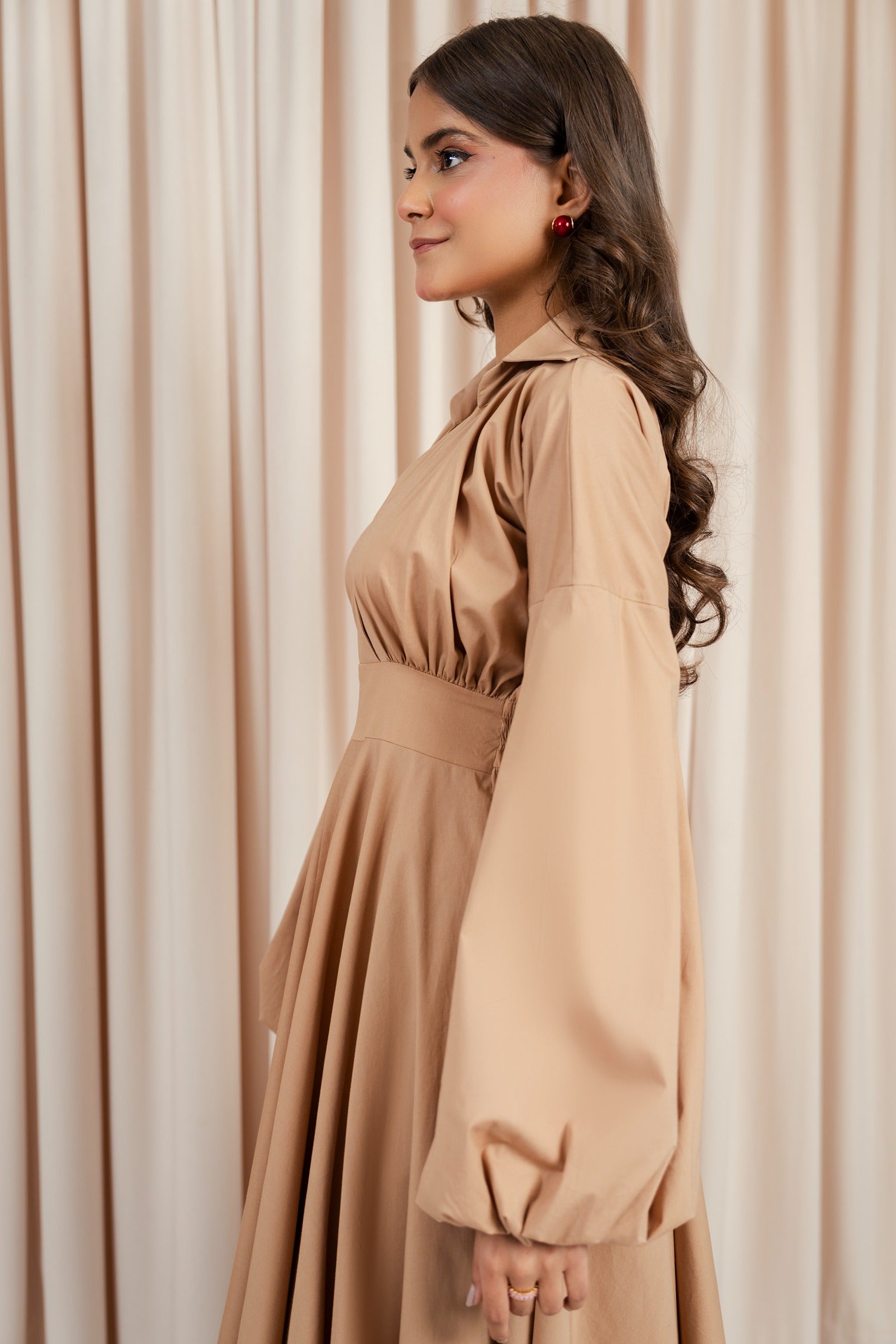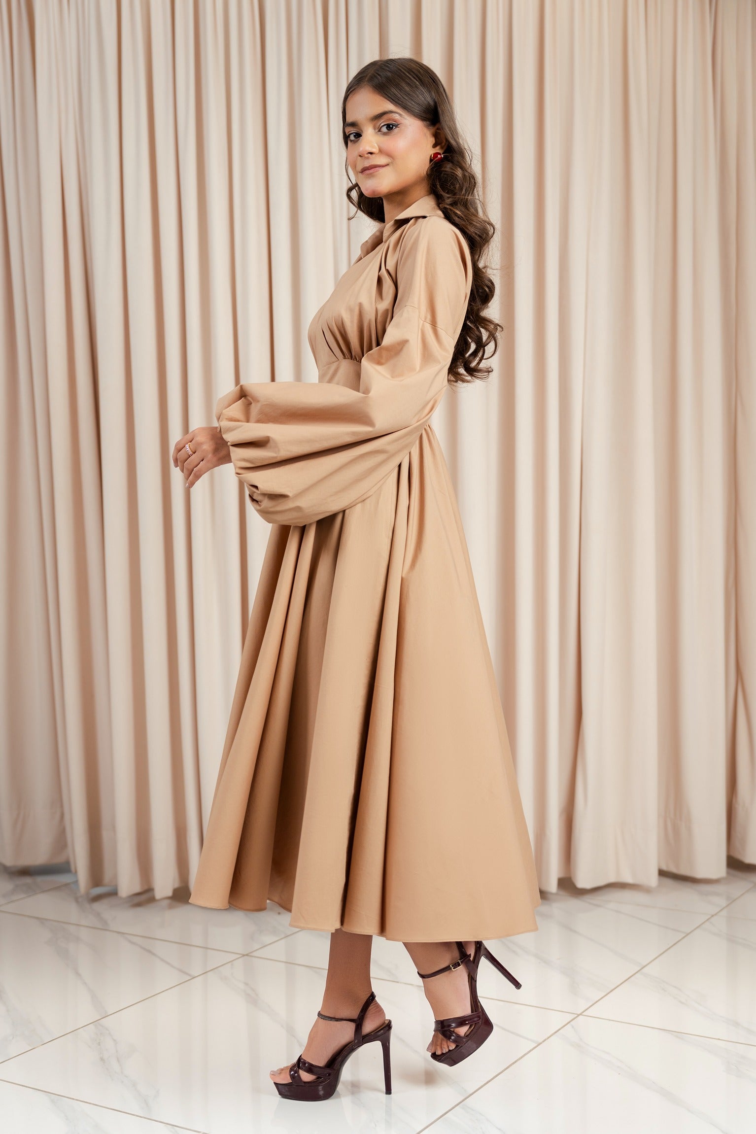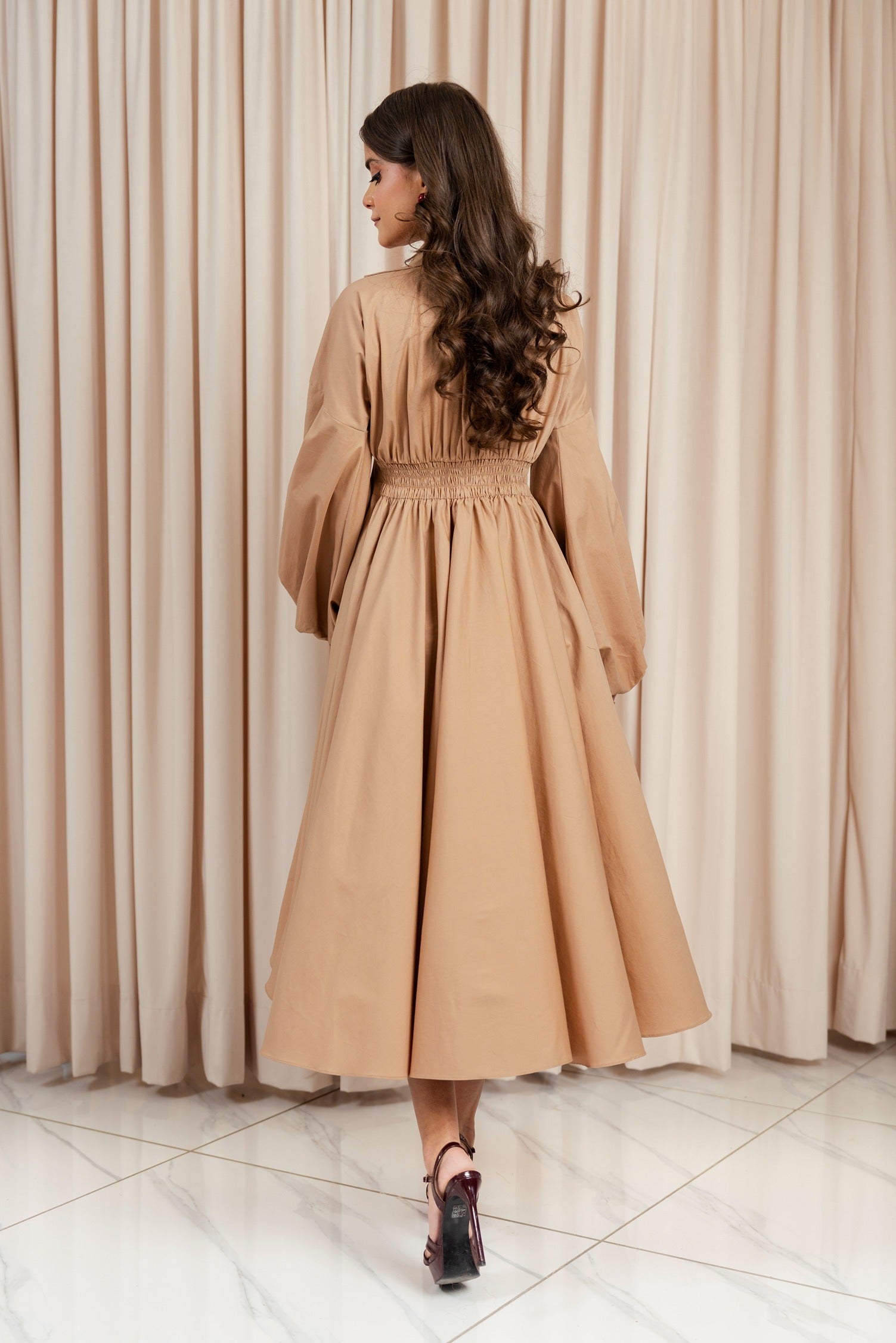 This designer wear piece is a refined take on casual wear, merging romantic detailing with contemporary finesse. Featuring a soft V-neckline, gathered bust, and dramatic balloon sleeves, the silhouette flows into a graceful flare, making it ideal for both relaxed gatherings and stylish daywear.