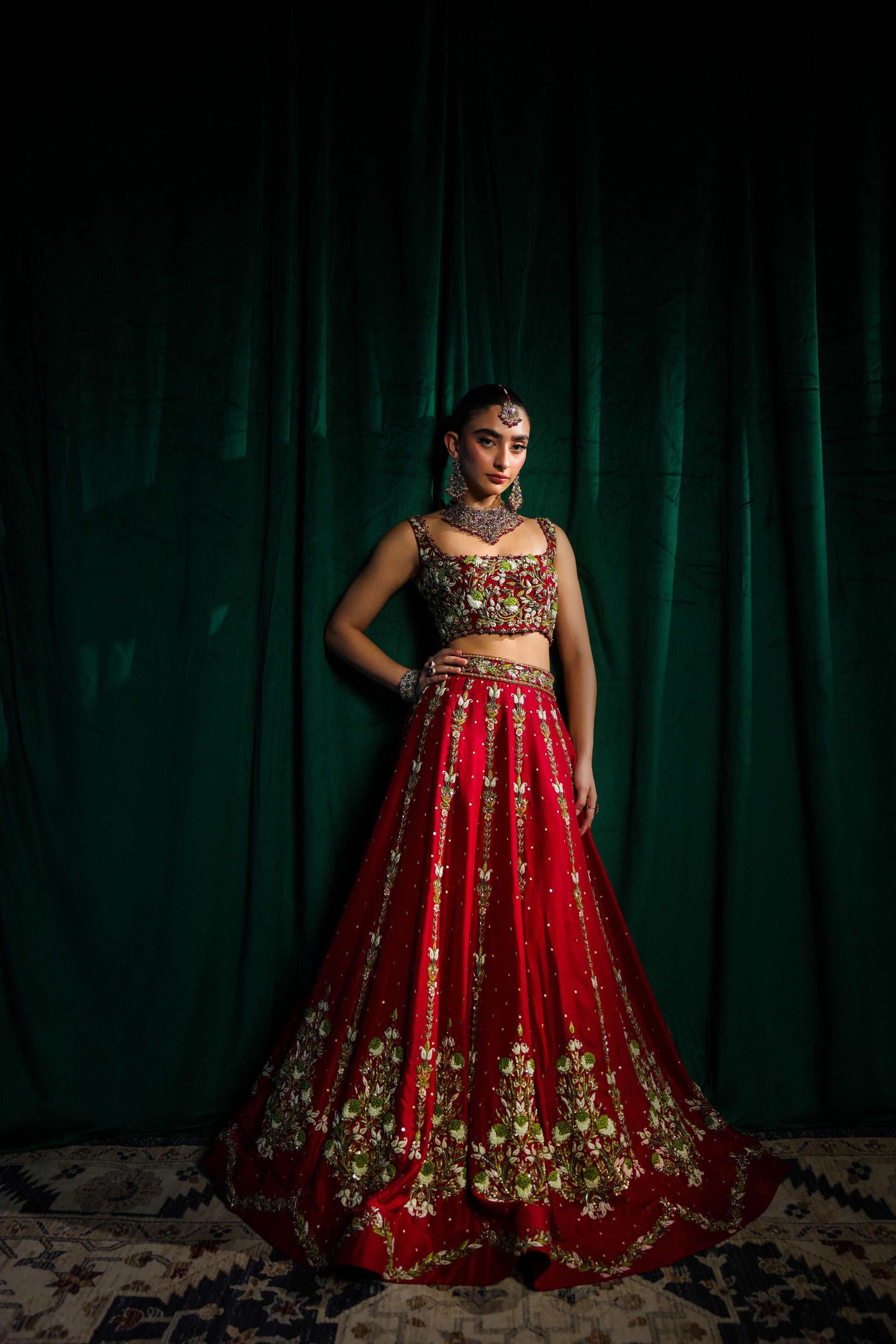 · Deep red lehenga set with handcrafted floral embroidery in green and mint green