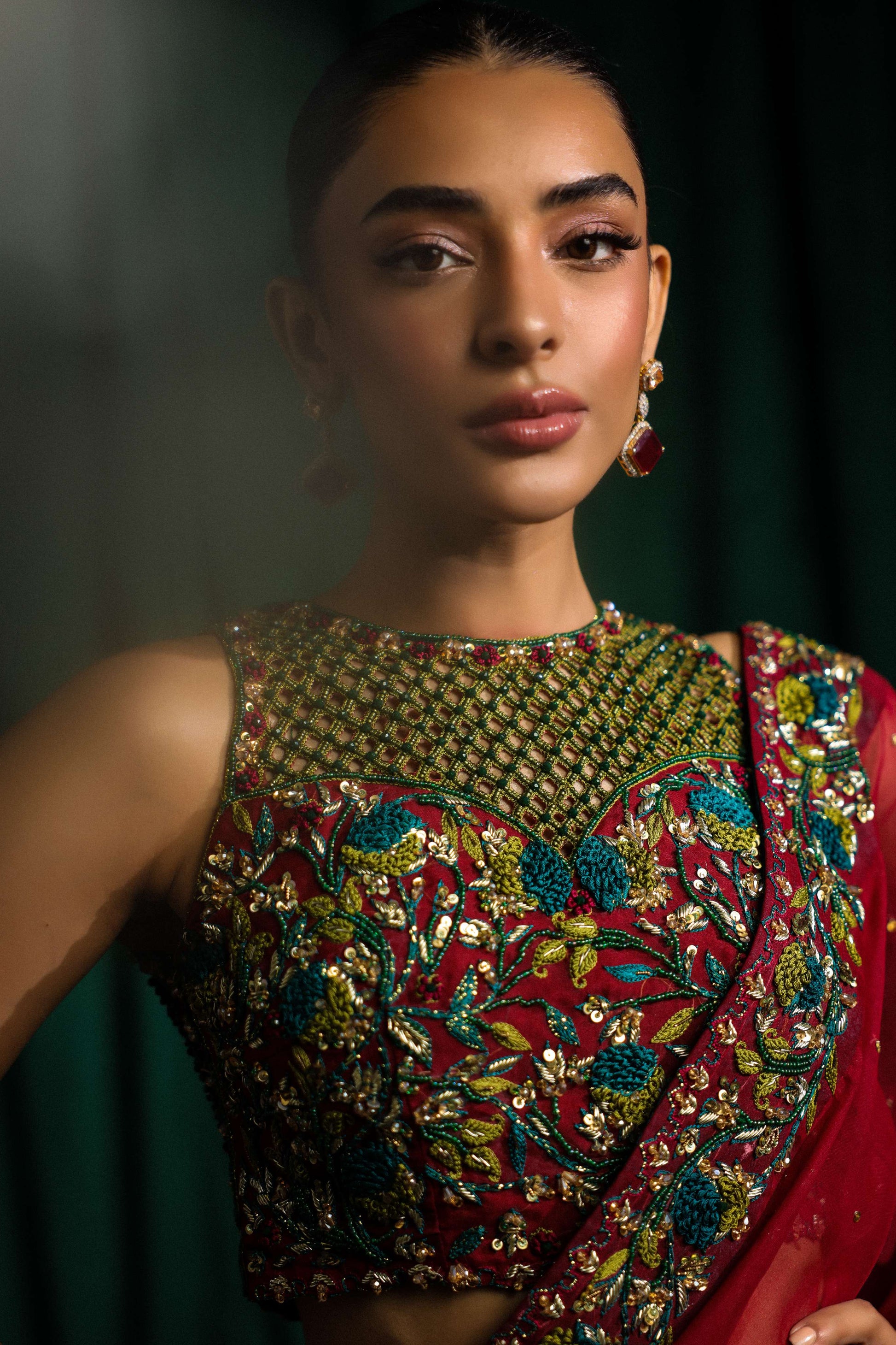 The saree and blouse showcase detailed floral embroidery with a mix of green, blue and gold