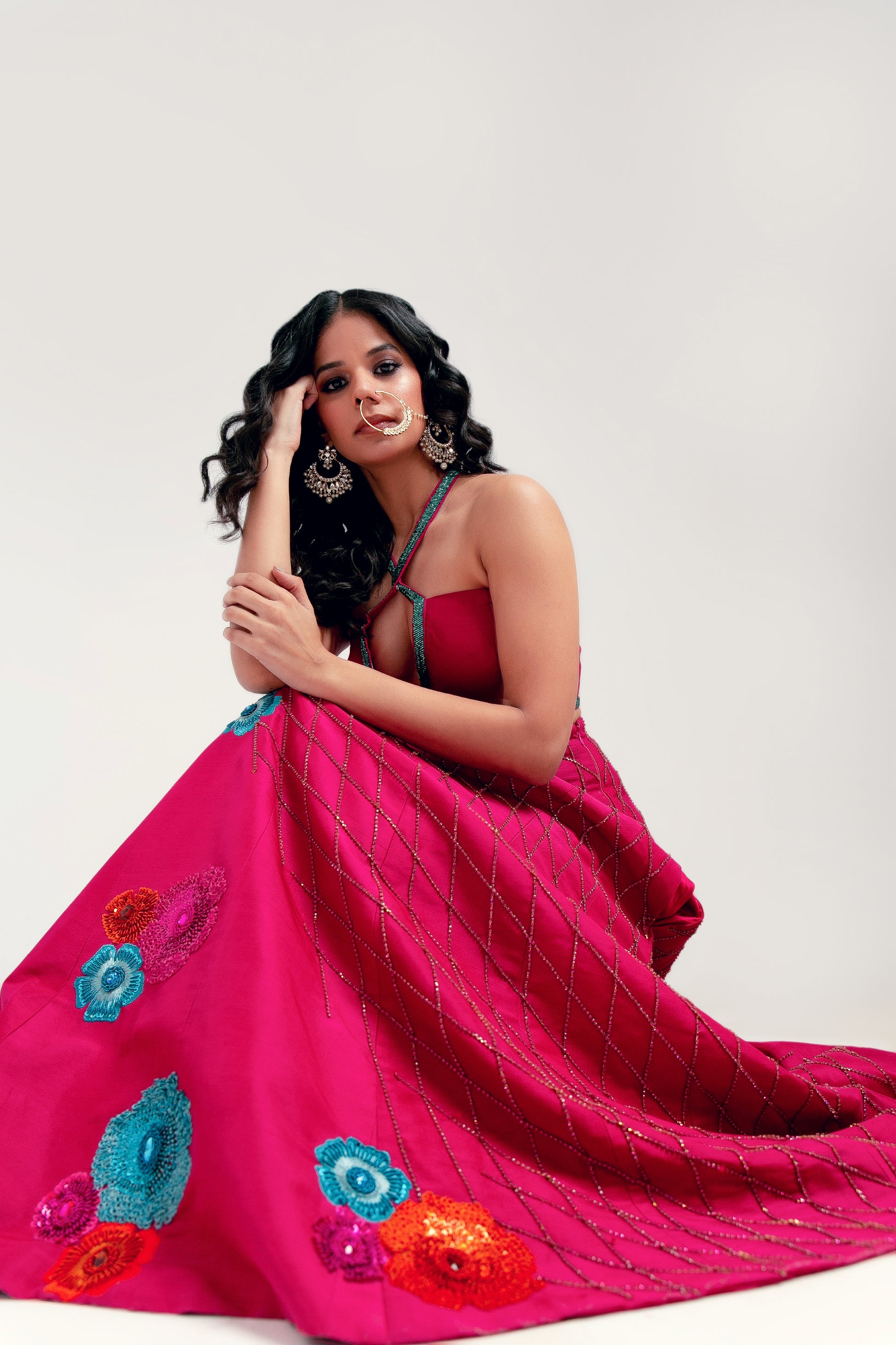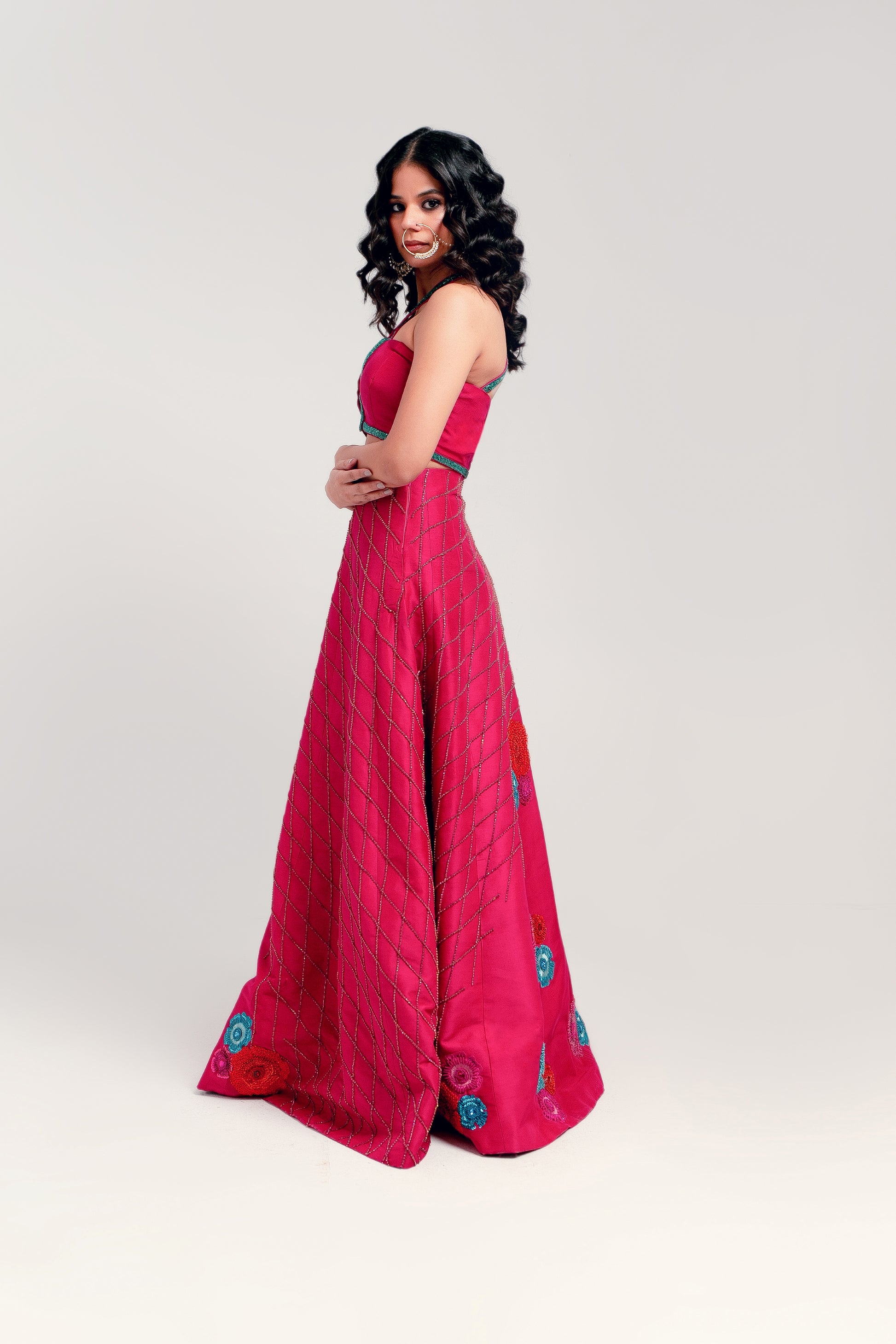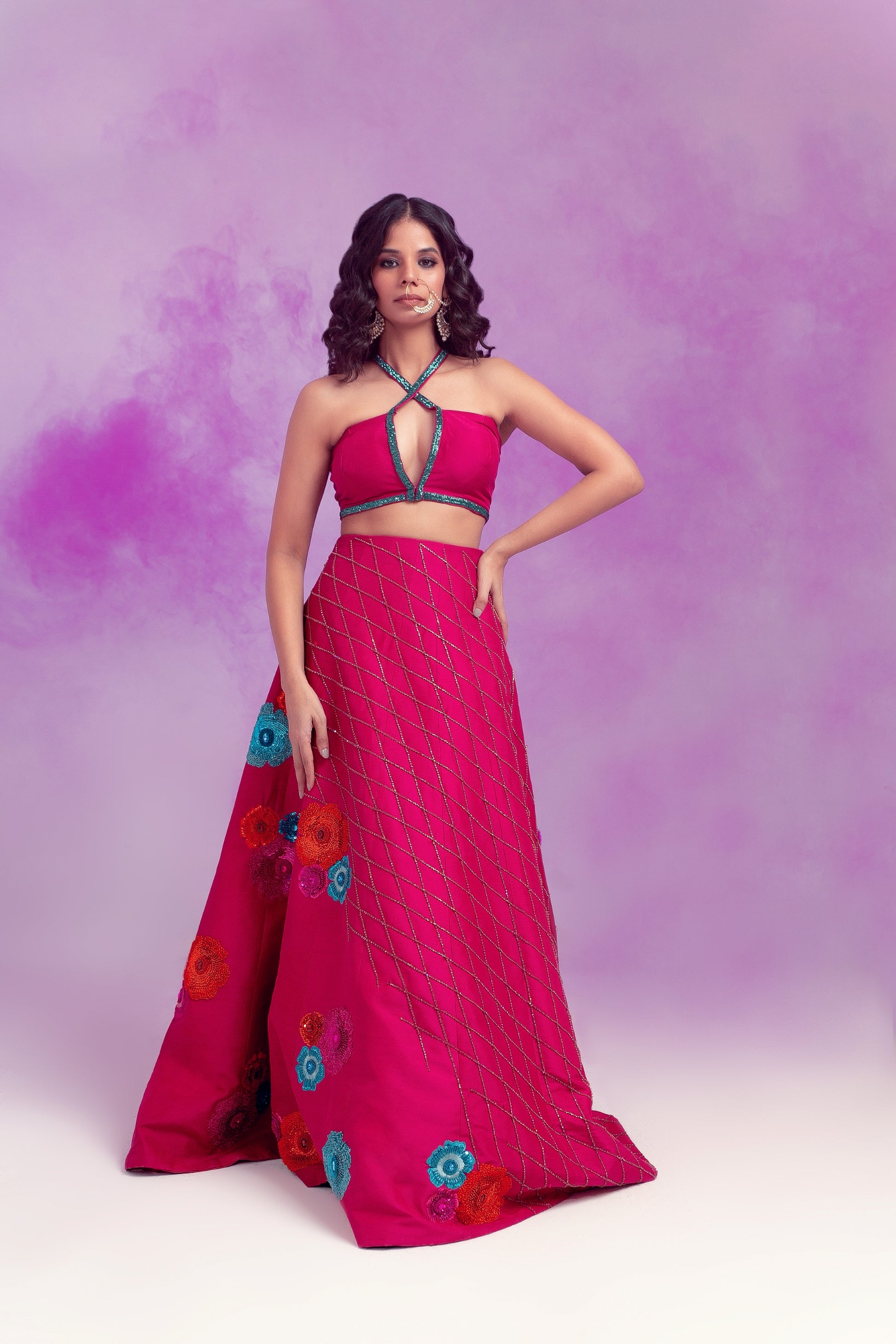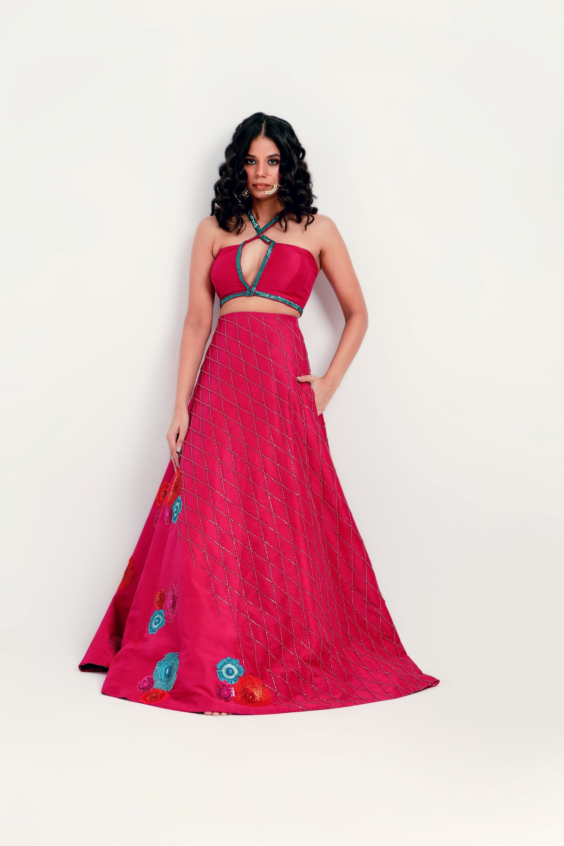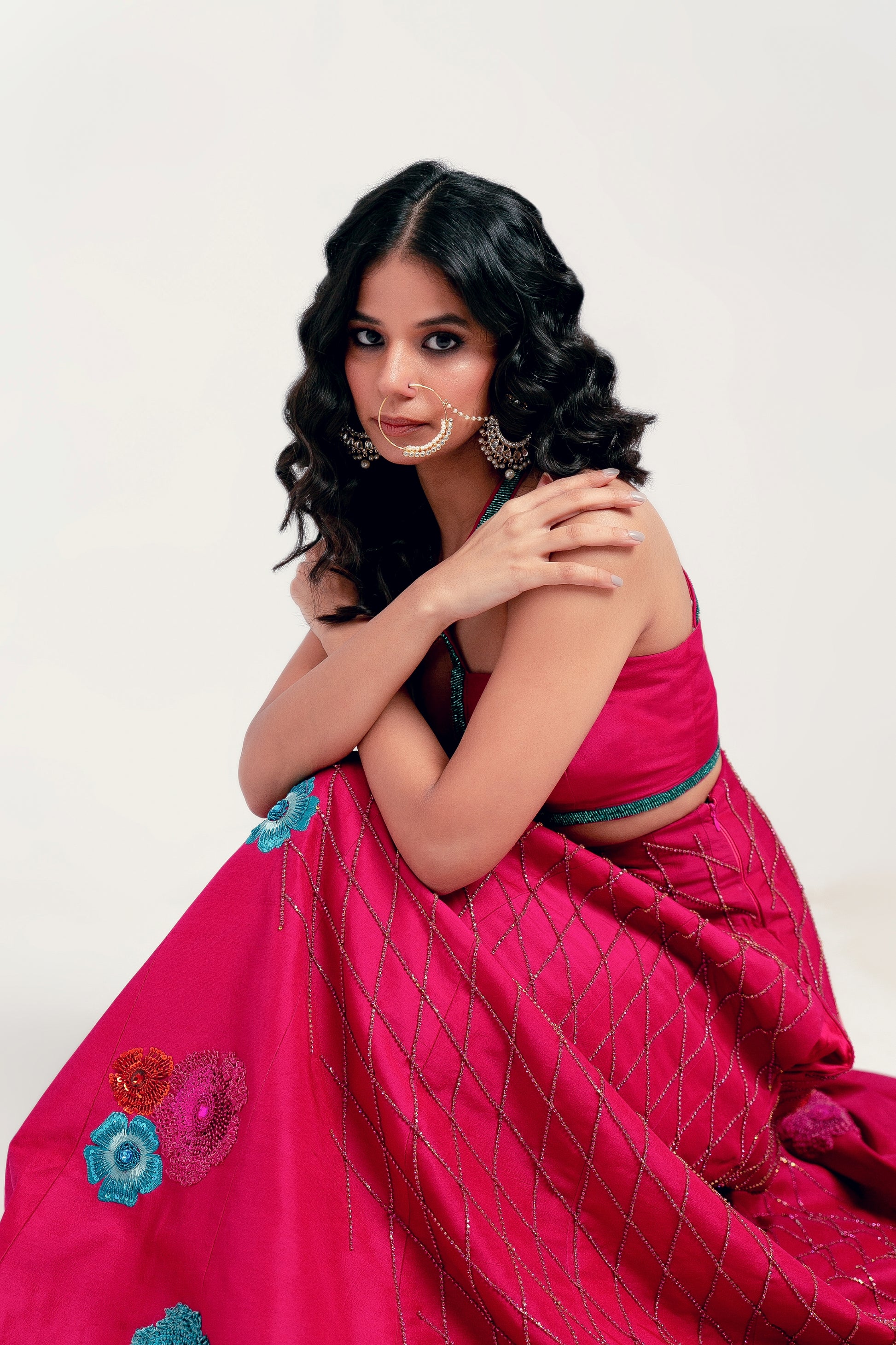 Jahan is a pure silk lehnga with embroidery in popping colors on the blouse and lehnga. The lehnga choli set is a striking and contemporary take on traditional couture. Perfect for modern festivities.