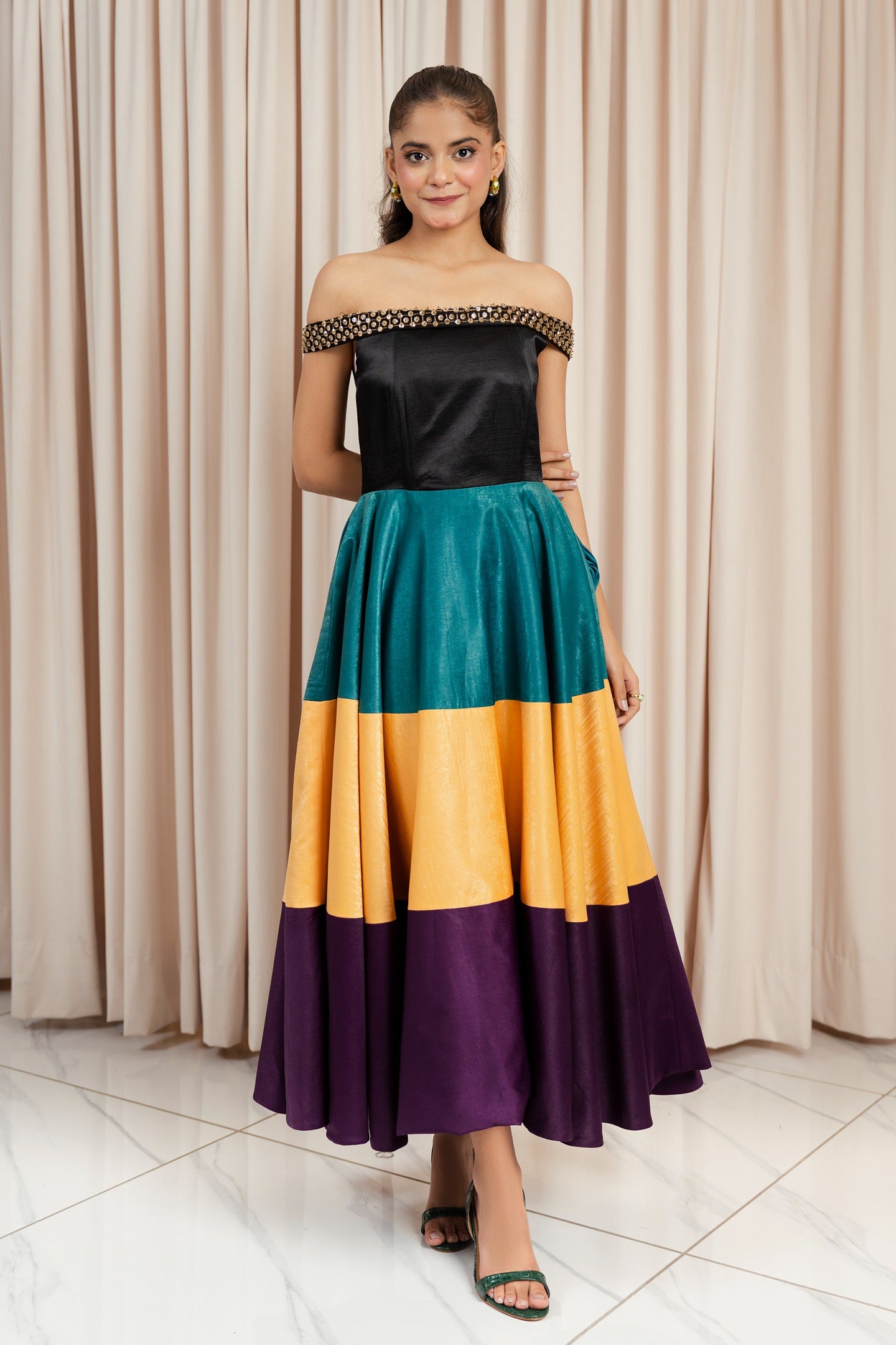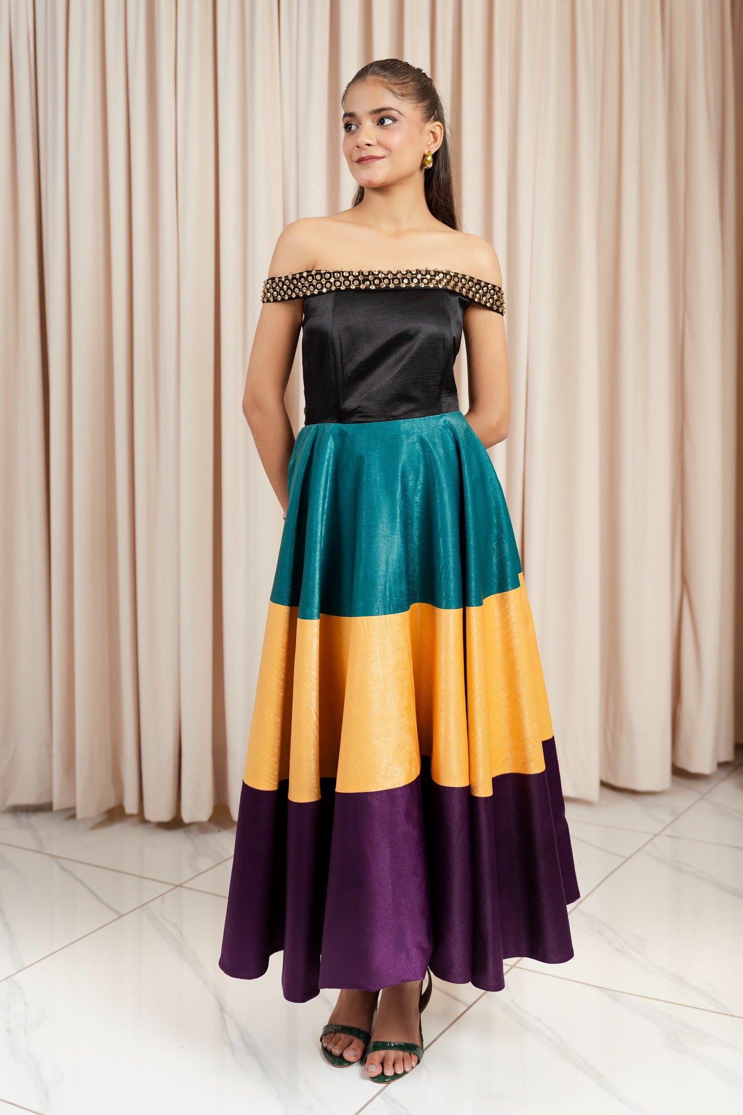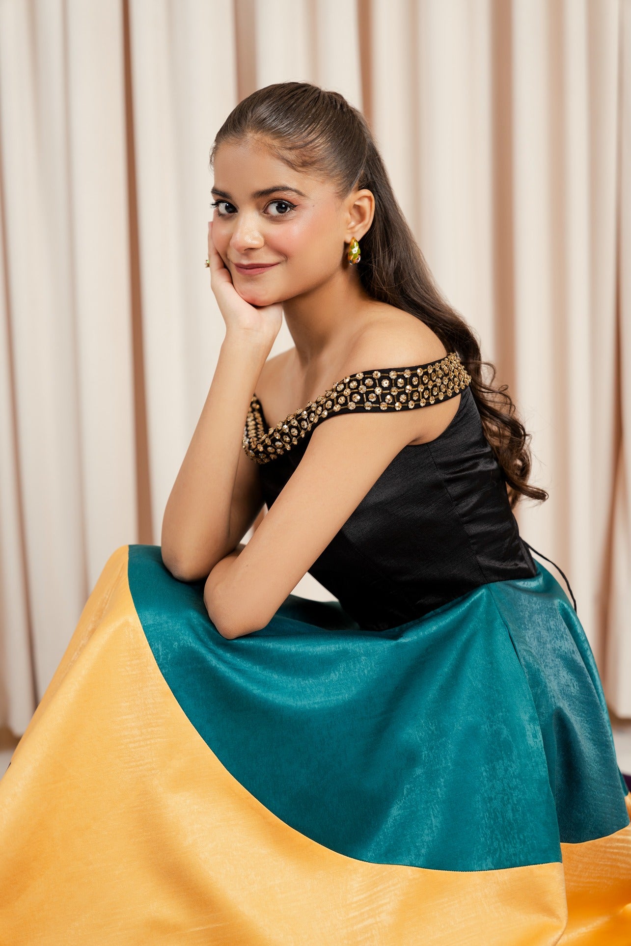 This designer dress is truly special. It’s captivating, with a design that’s so beautiful, it instantly catches your eye. The off-shoulder neckline adds a touch of elegance and sophistication, while the black bodice gives your figure a flattering shape.