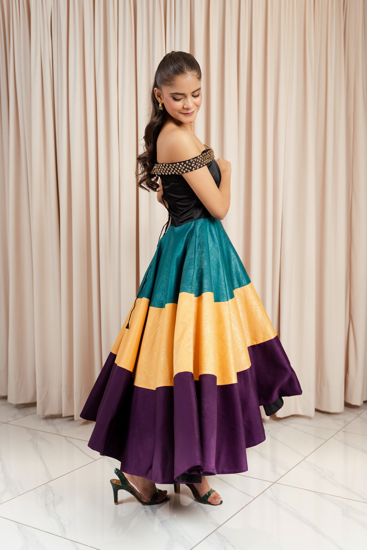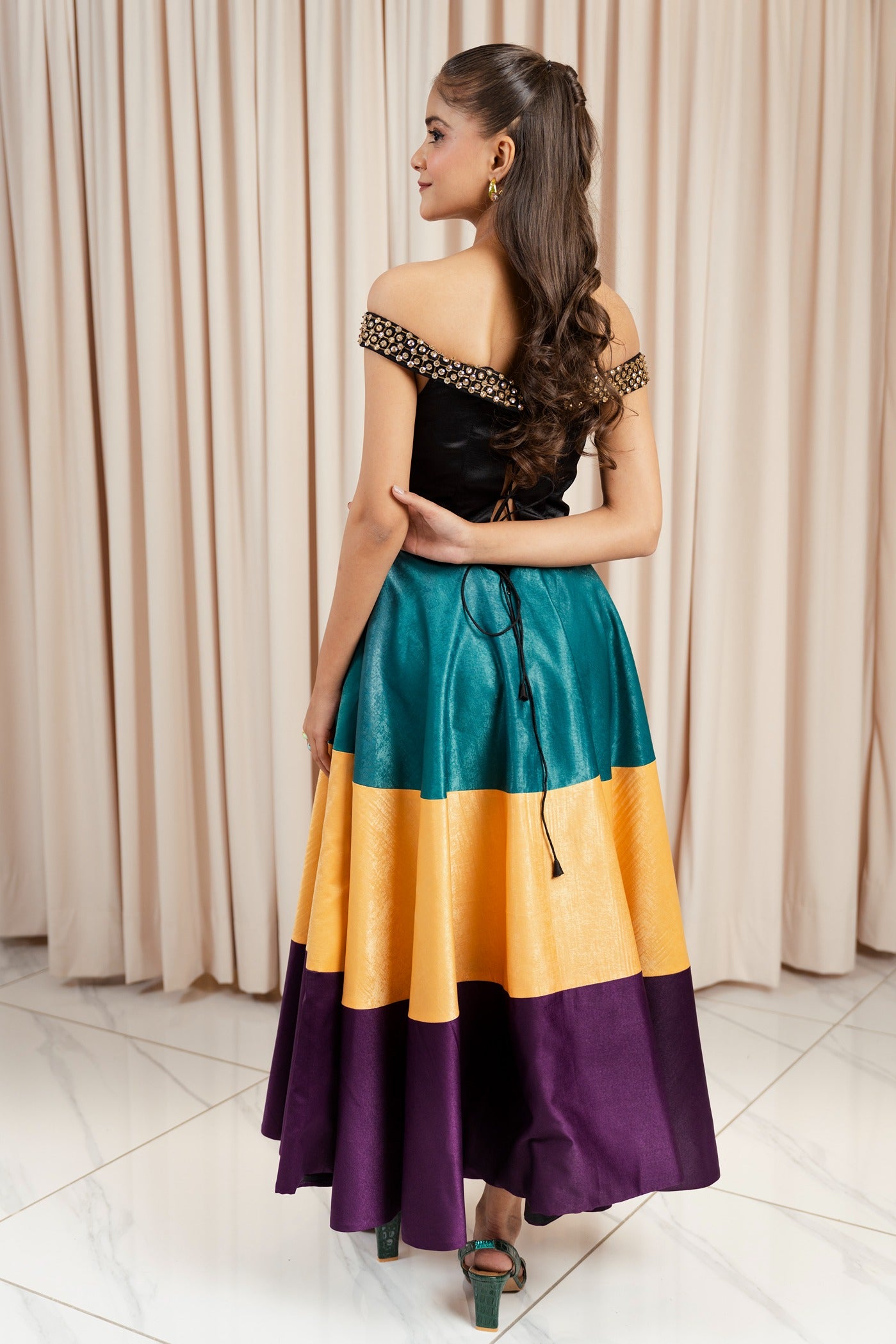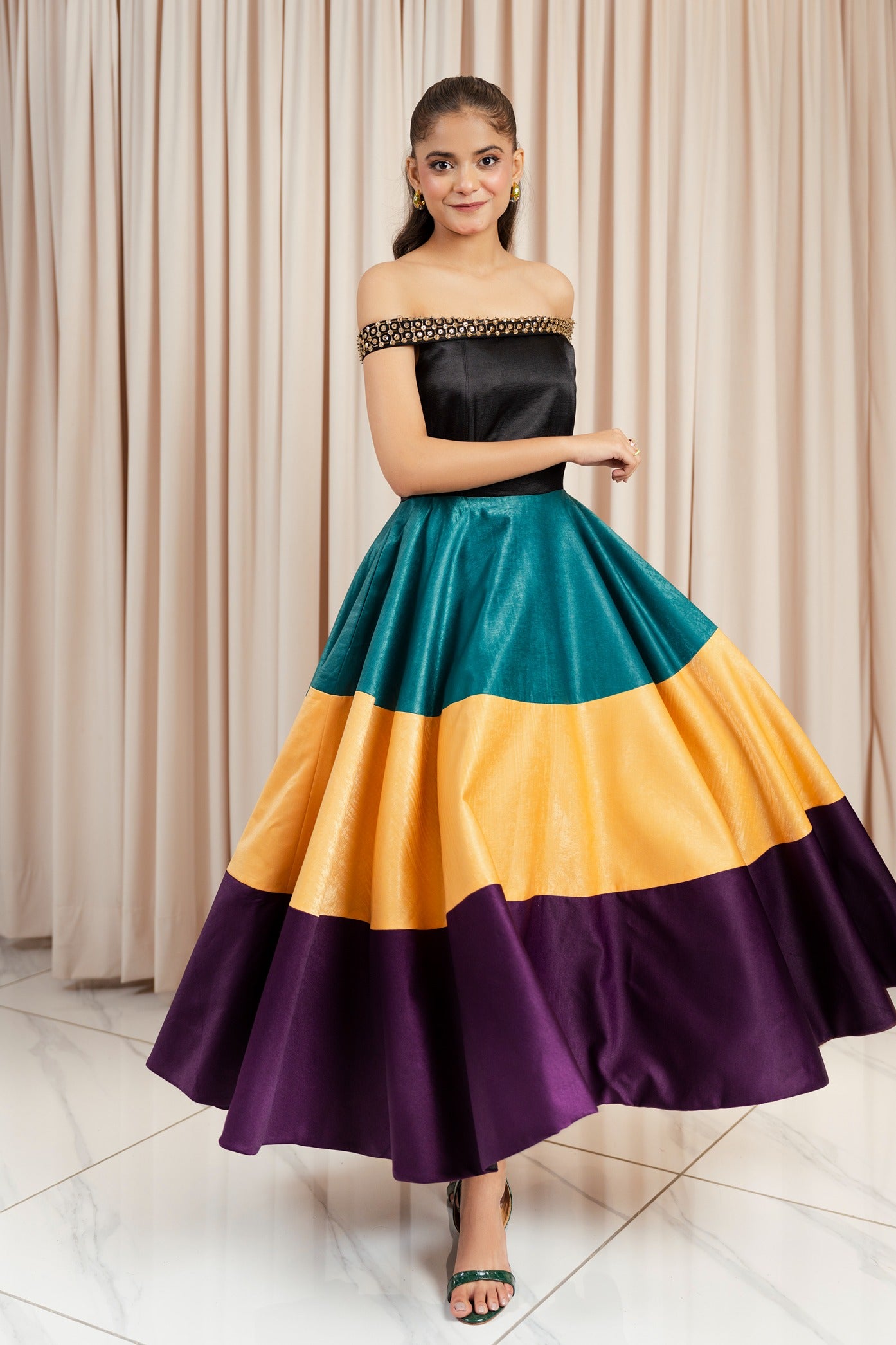 This designer dress is truly special. It’s captivating, with a design that’s so beautiful, it instantly catches your eye. The off-shoulder neckline adds a touch of elegance and sophistication, while the black bodice gives your figure a flattering shape.