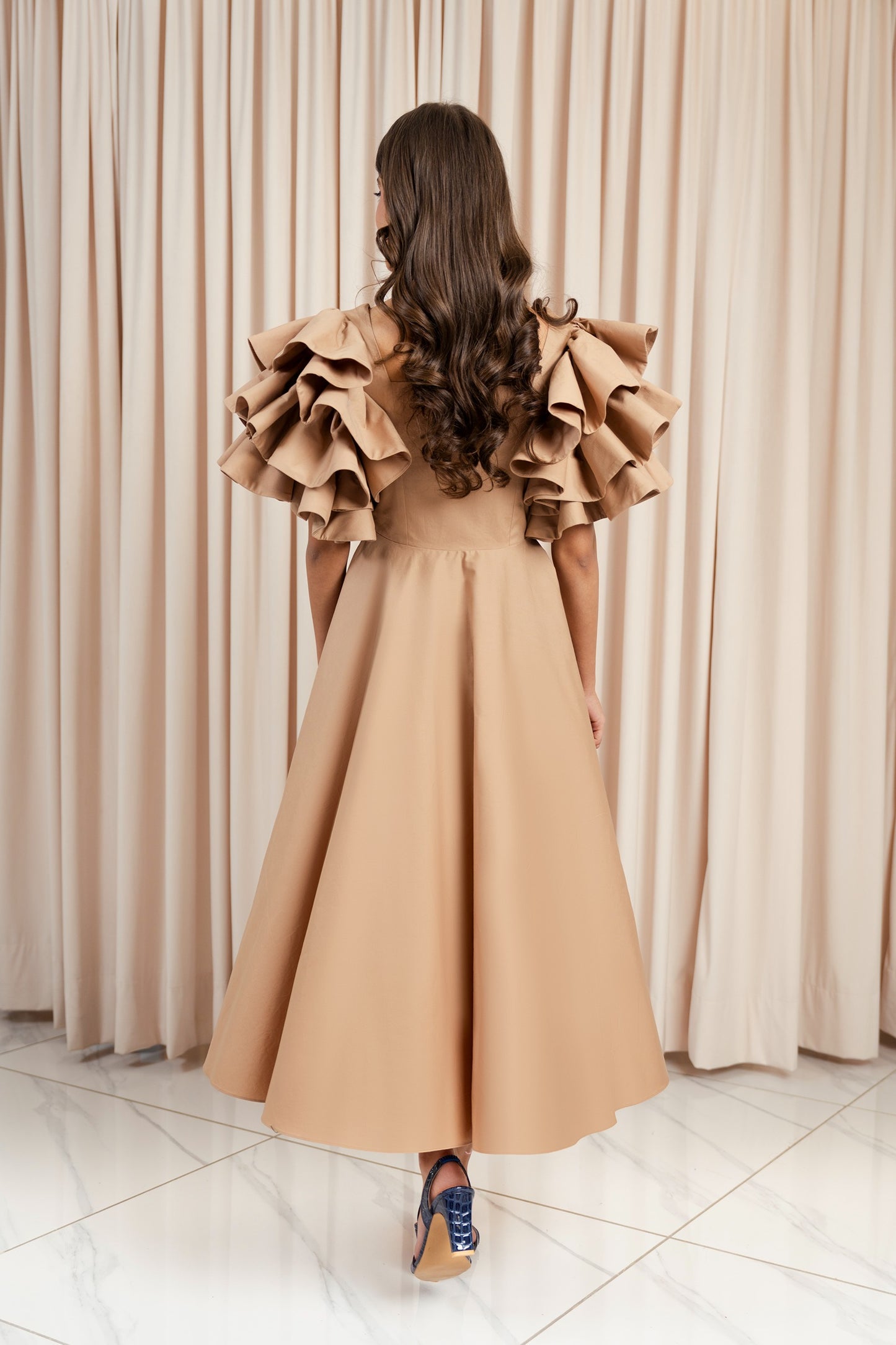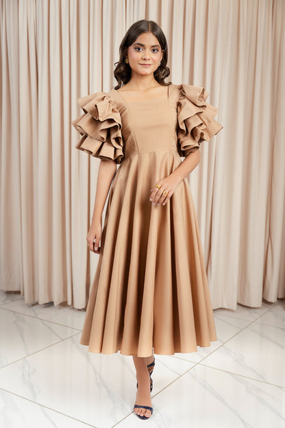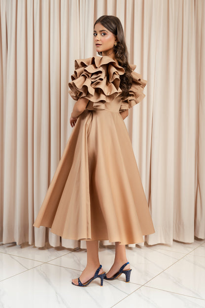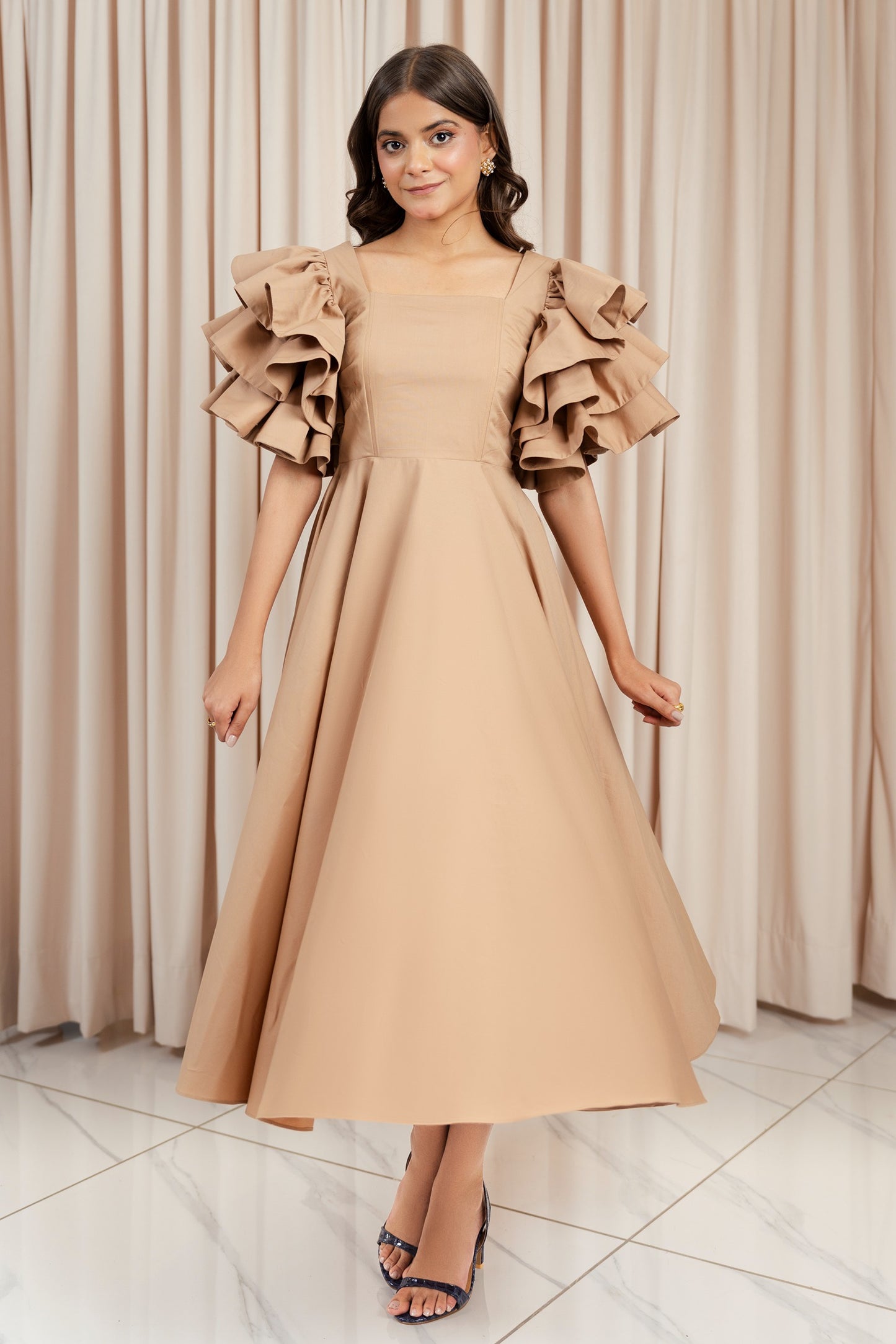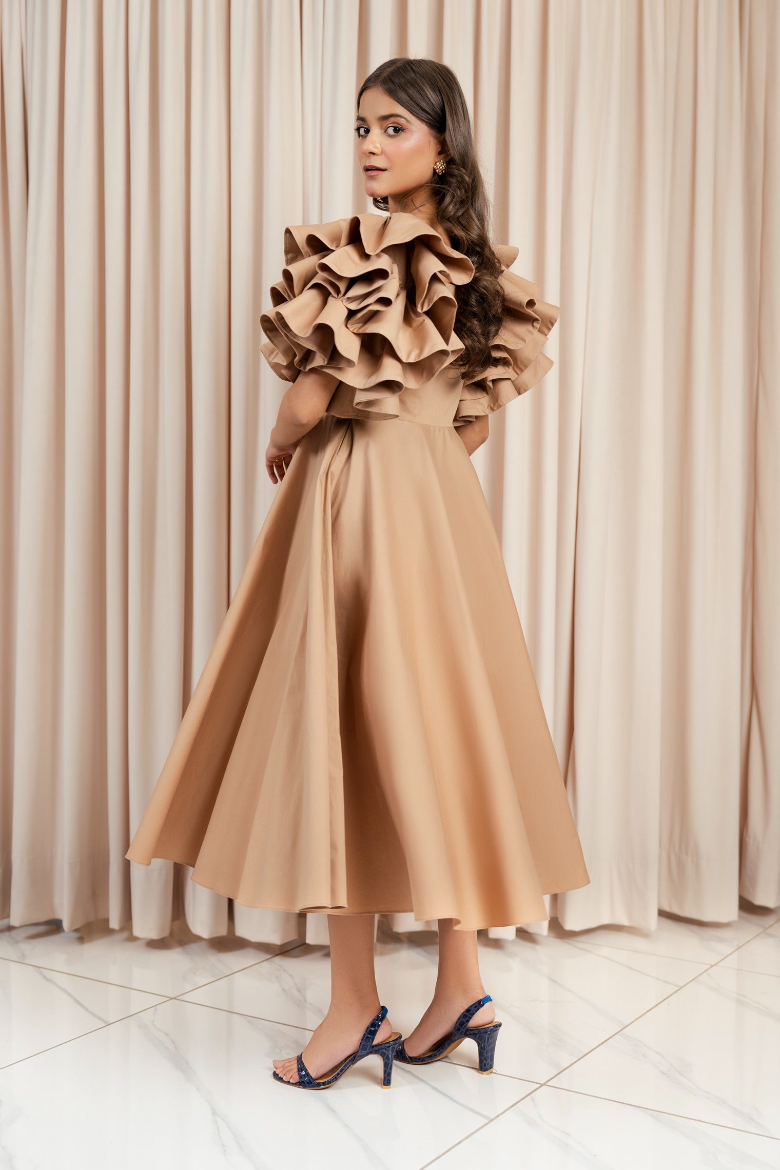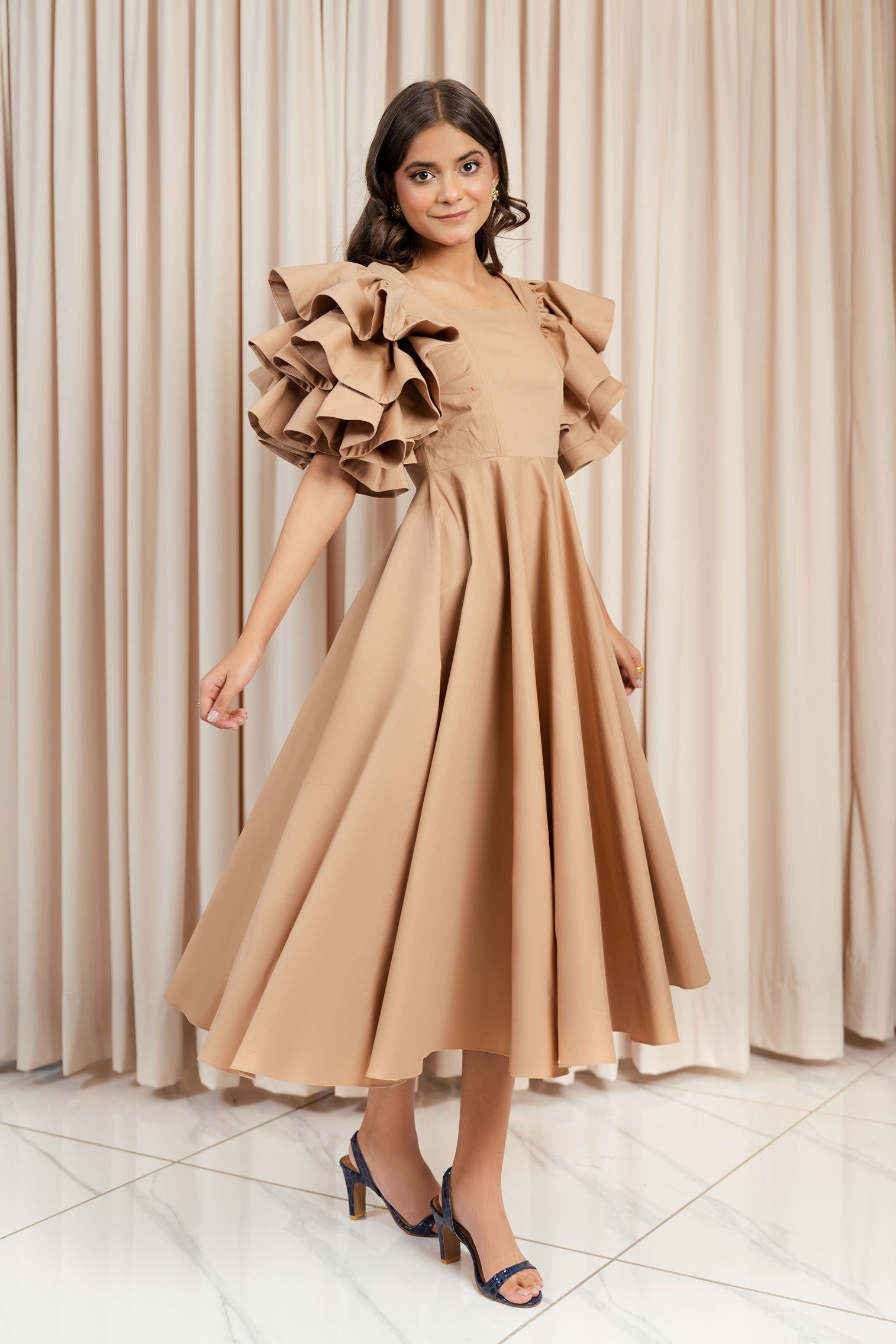 This designer wear dress blends casual wear comfort with elevated elegance. The standout element is its voluminous layered ruffle sleeves that create a dramatic yet balanced silhouette. With a structured bodice and flowing A-line skirt, it’s perfect for brunches, events, or intimate gatherings. The minimalist base allows the sleeves to shine, offering a refined statement look without overwhelming detail.