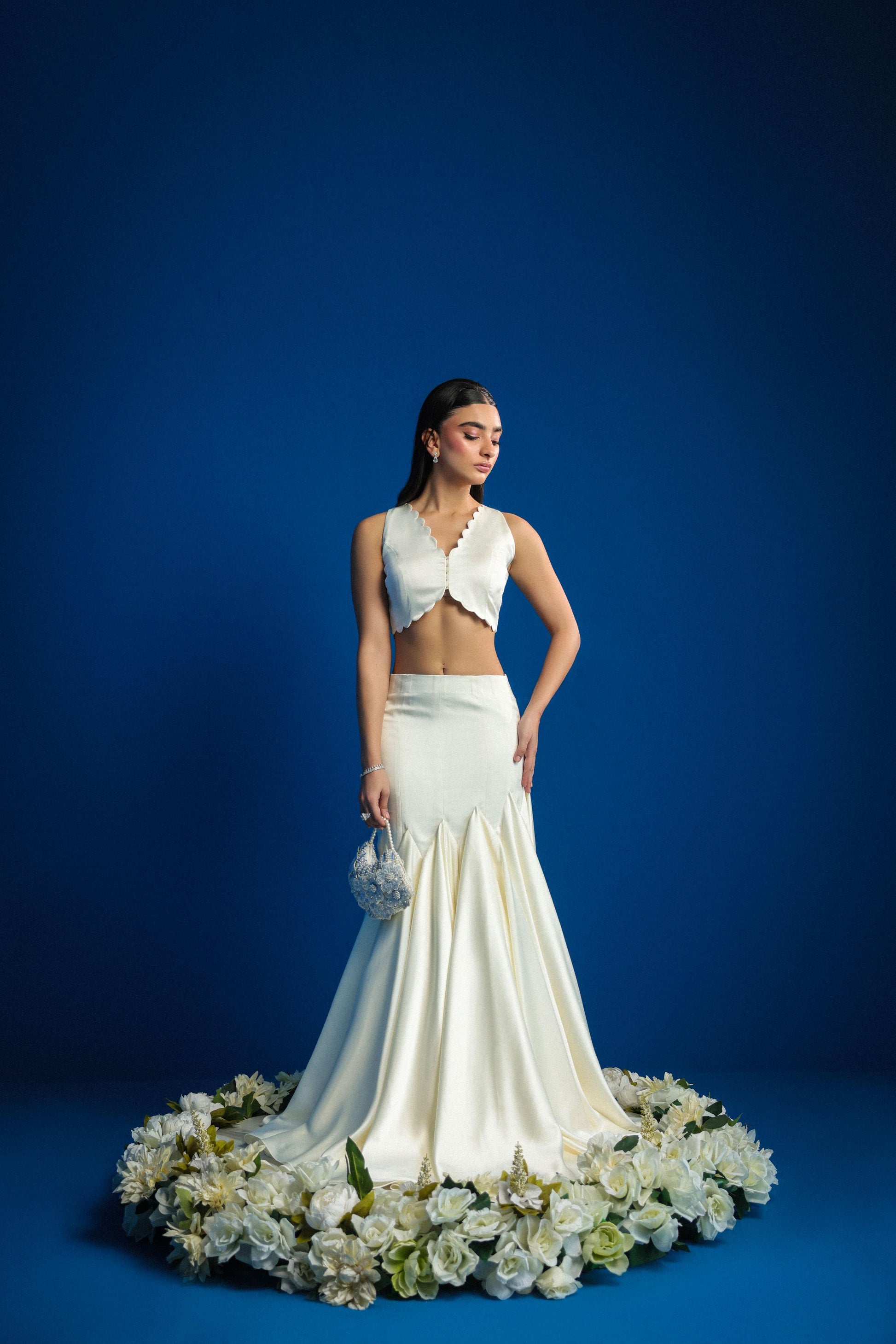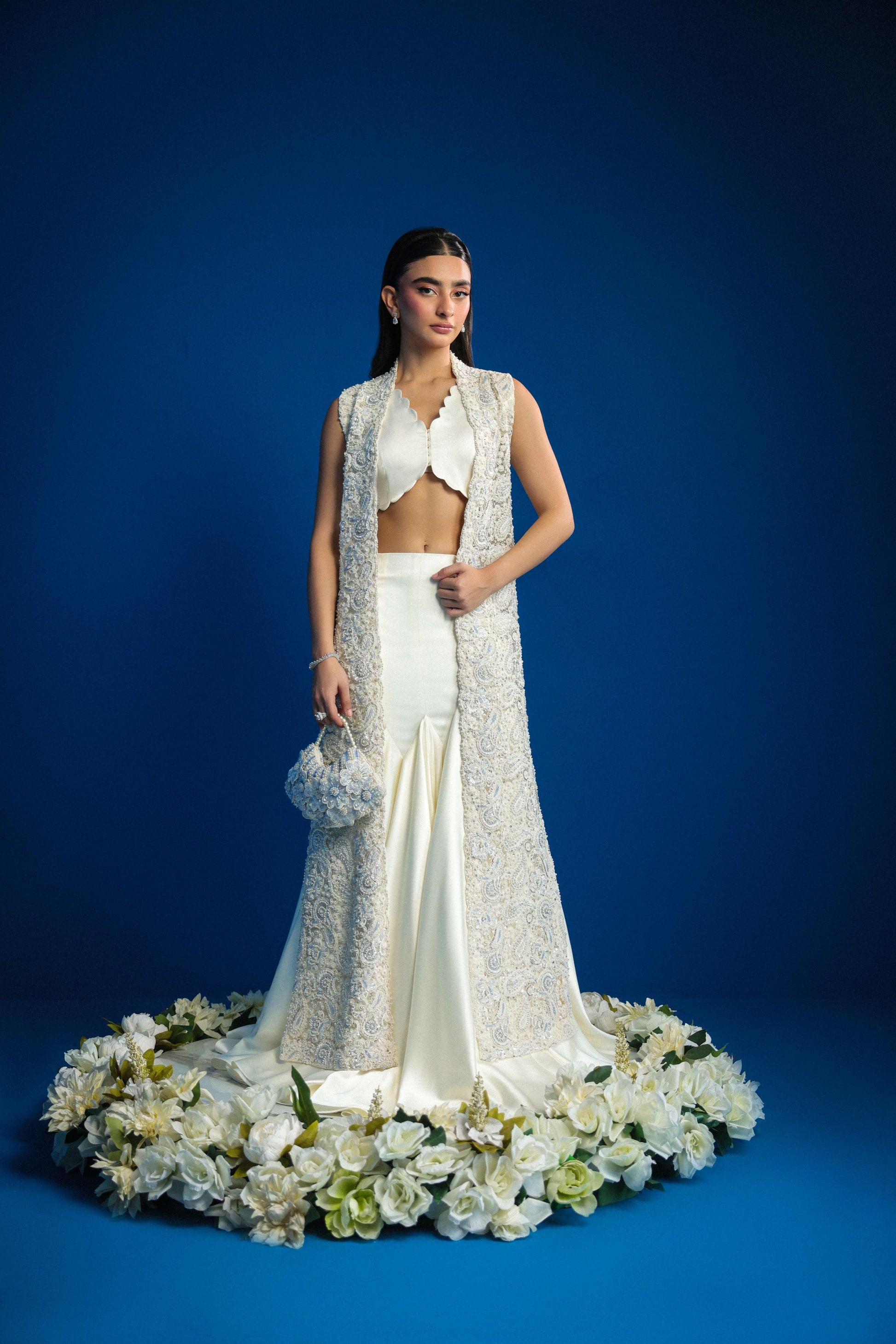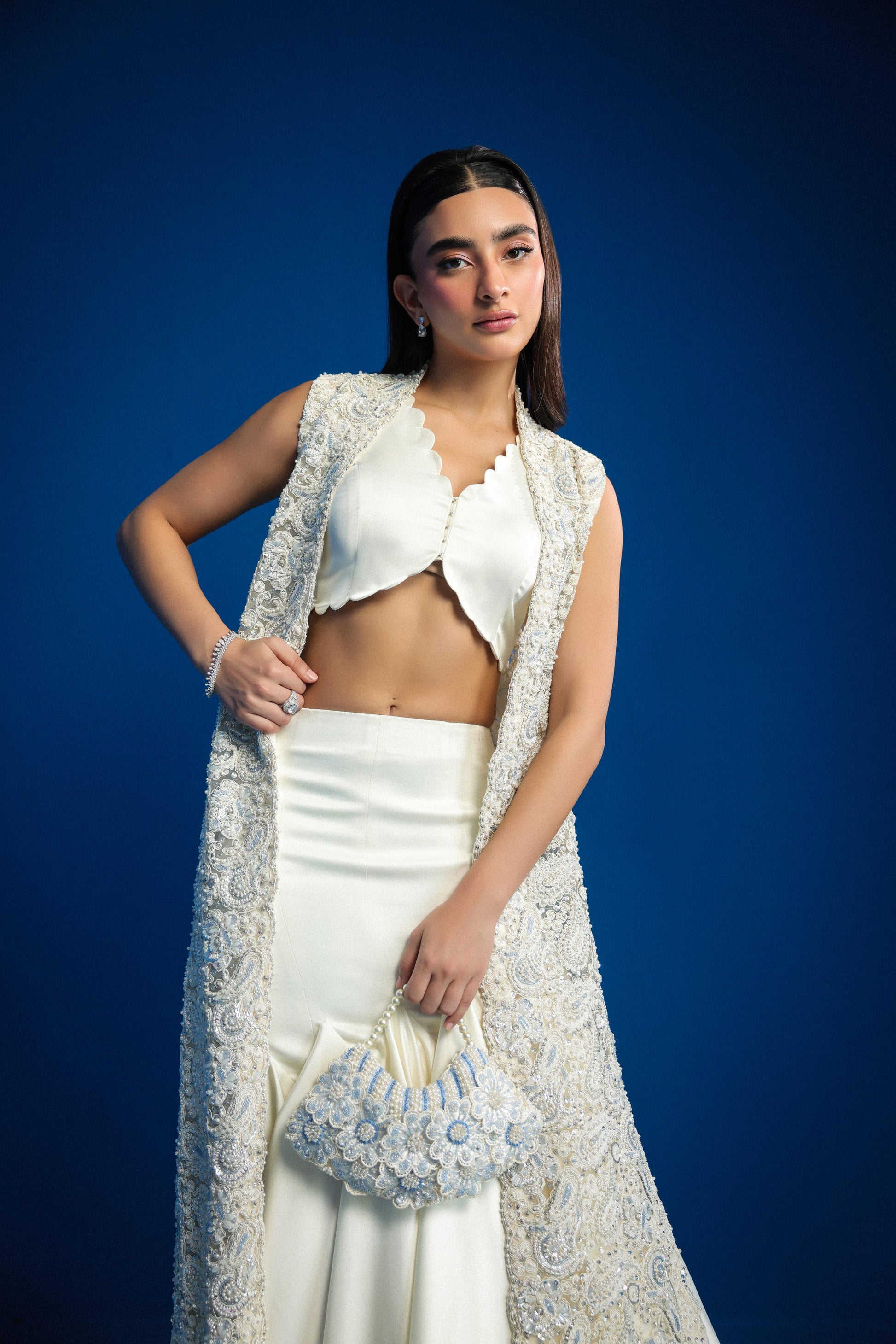 Introducing our Ivory Grace Ensemble, a vision of modern sophistication and timeless charm. This contemporary look redefines elegance with a sleek silhouette, intricate craftsmanship, and a serene ivory palette. The ensemble features a scalloped-edge crop blouse paired with a floor-length structured skirt, complemented by a hand-embroidered long overlay that adds dimension and luxury.