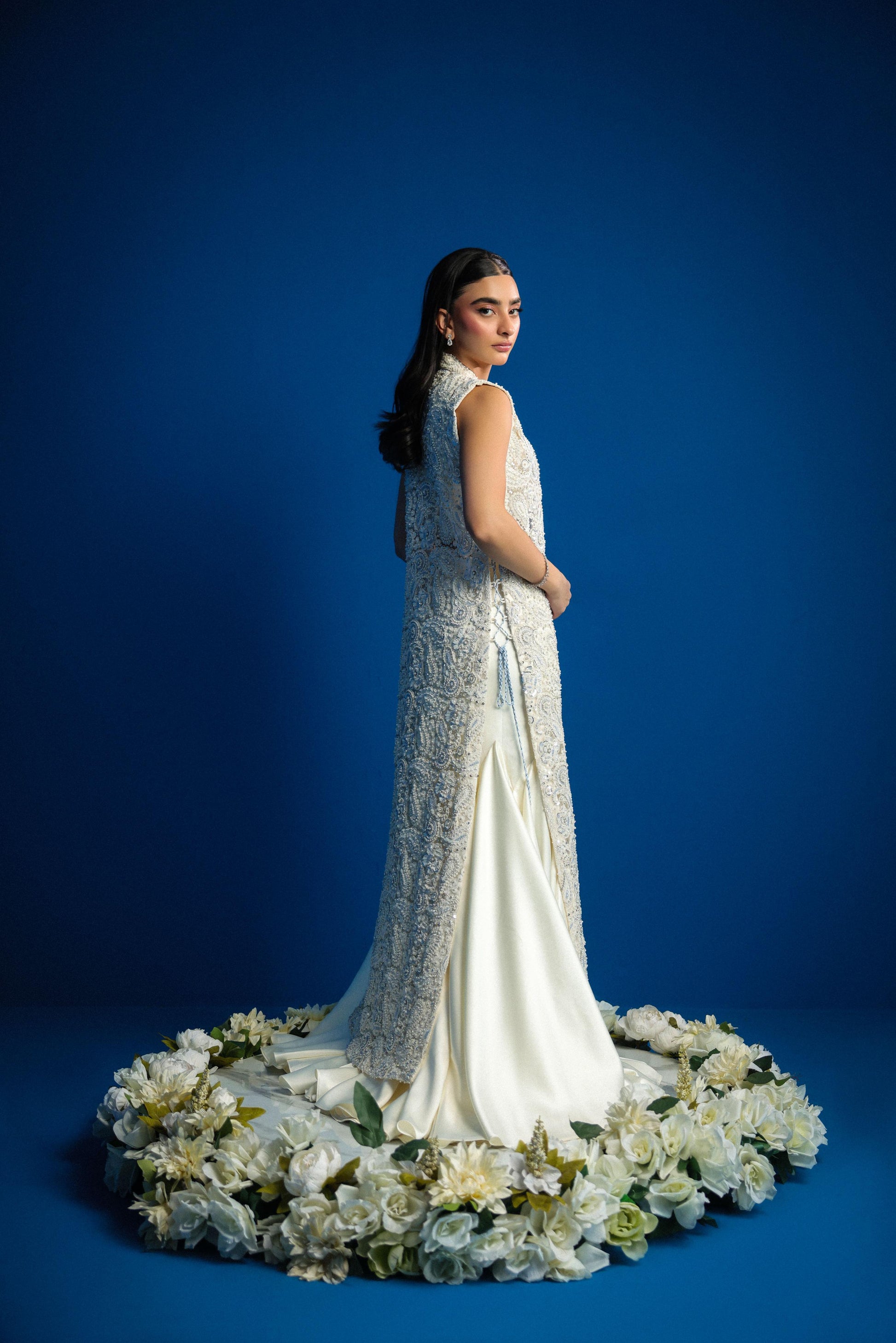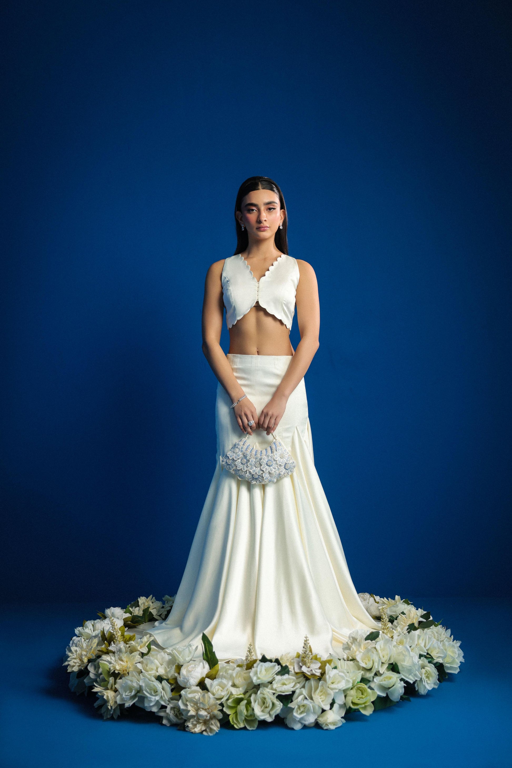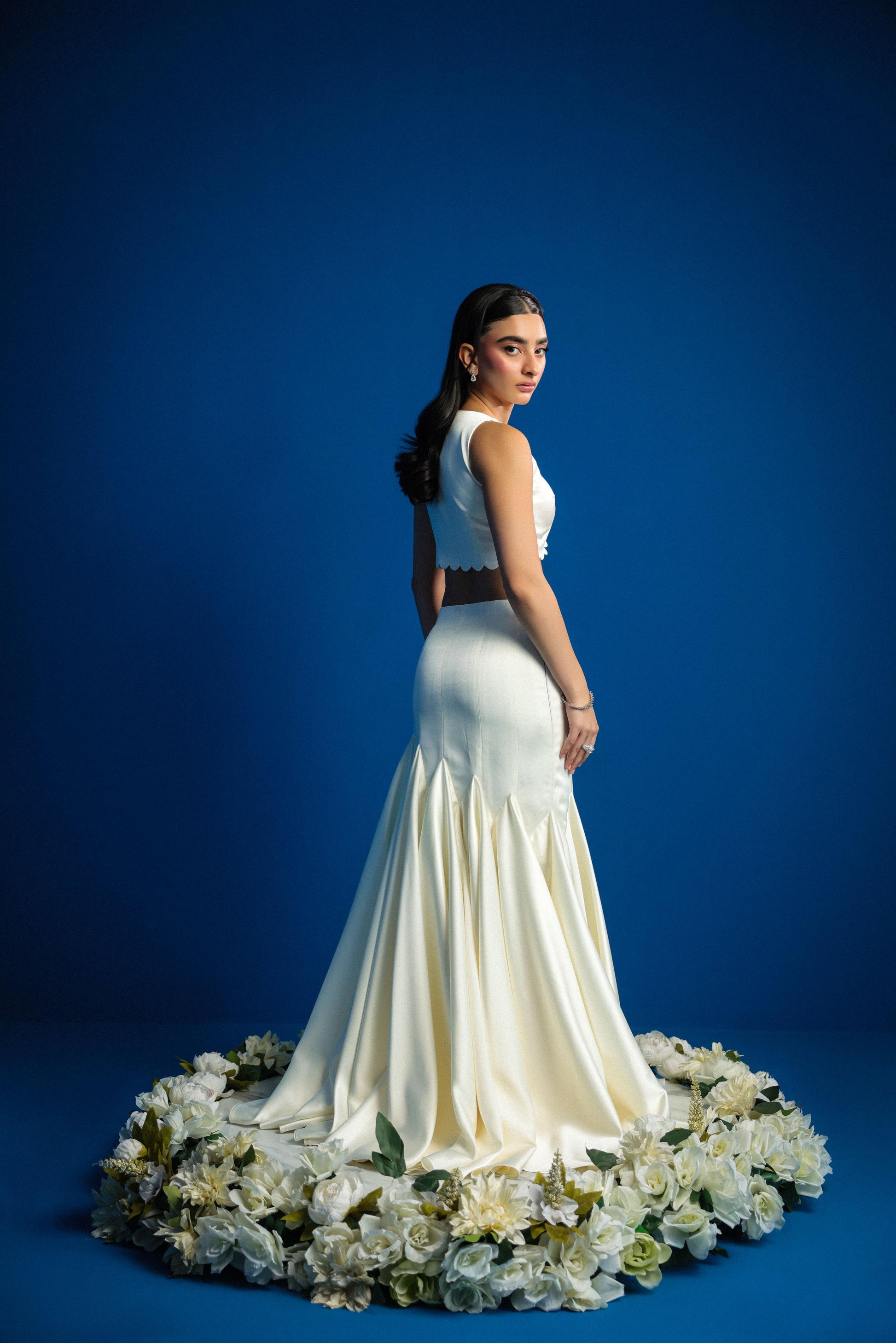 Introducing our Ivory Grace Ensemble, a vision of modern sophistication and timeless charm. This contemporary look redefines elegance with a sleek silhouette, intricate craftsmanship, and a serene ivory palette. The ensemble features a scalloped-edge crop blouse paired with a floor-length structured skirt, complemented by a hand-embroidered long overlay that adds dimension and luxury.