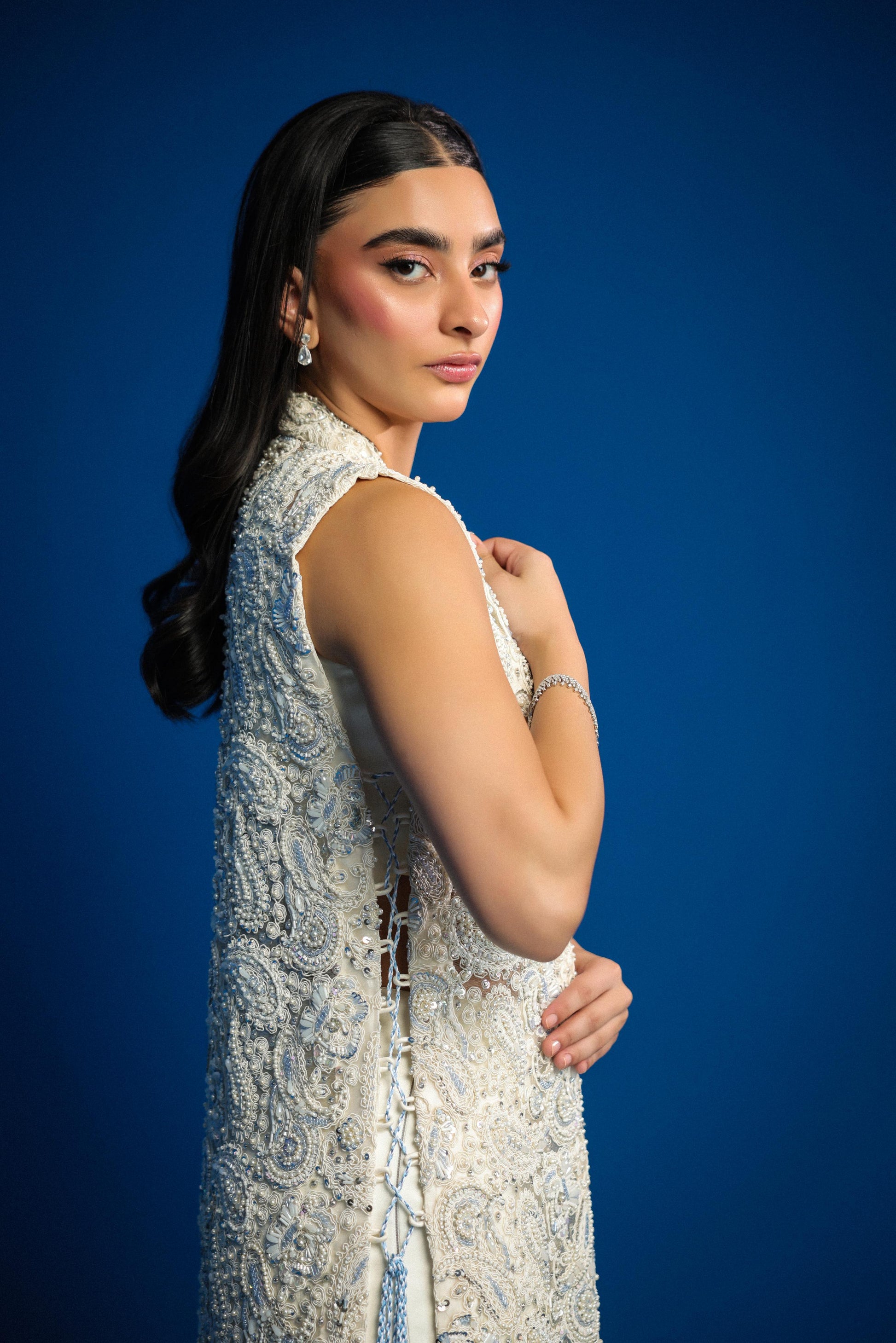 Designed for the modern woman who values subtle glamour and refined artistry, this look effortlessly blends minimalism with opulence. Whether for a high-end soirée, engagement, or festive celebration, the Ivory Grace Ensemble embodies understated beauty and confident femininity.