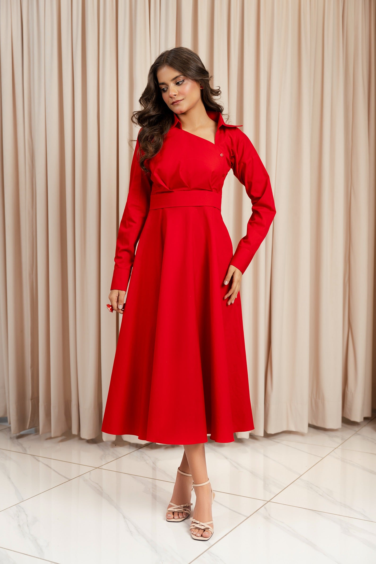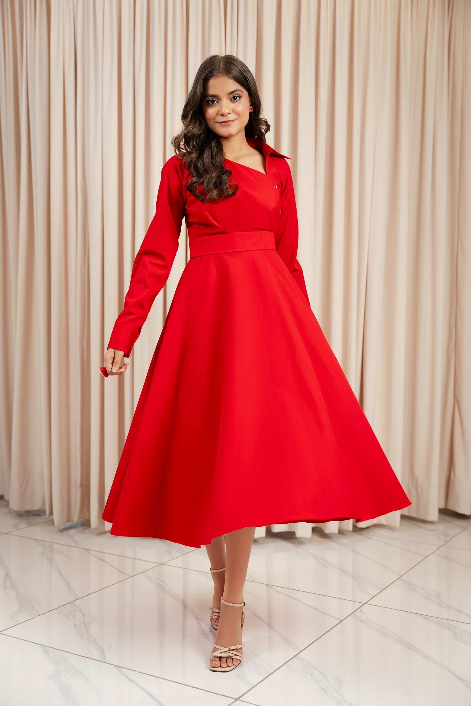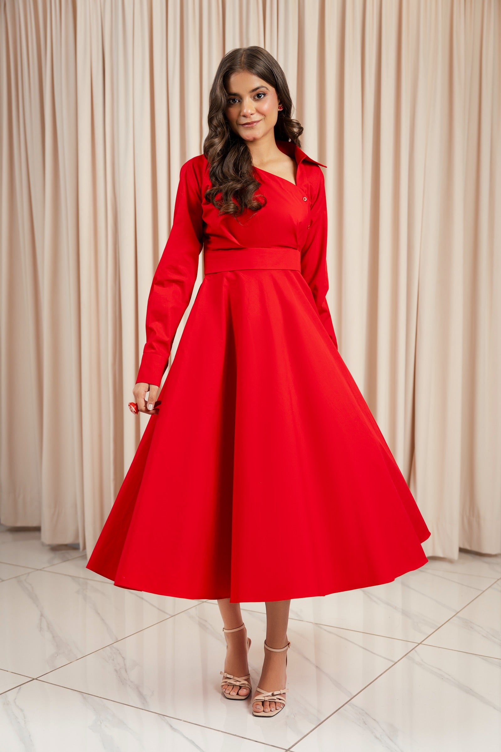 This captivating midi dress is a perfect blend of designer wear and casual wear, making it a versatile choice for any occasion. It features a flattering asymmetric neckline, long sleeves, a full skirt, this designer wear crafted for elevated everyday looks. The dress is both chic and playful, offering a touch of sophistication while remaining comfortable and easy to wear.