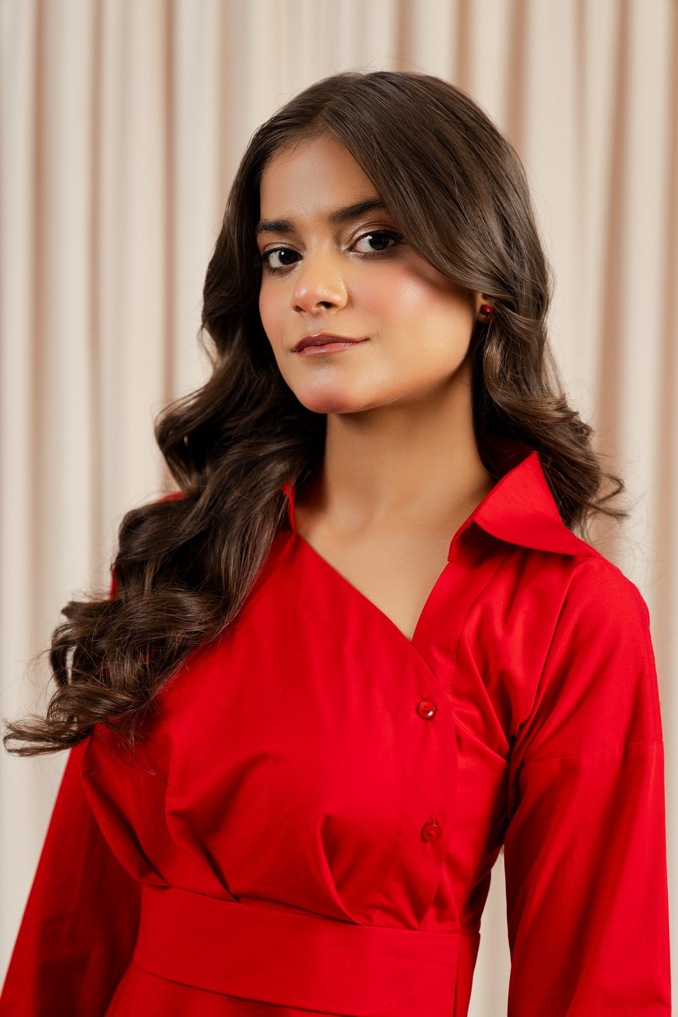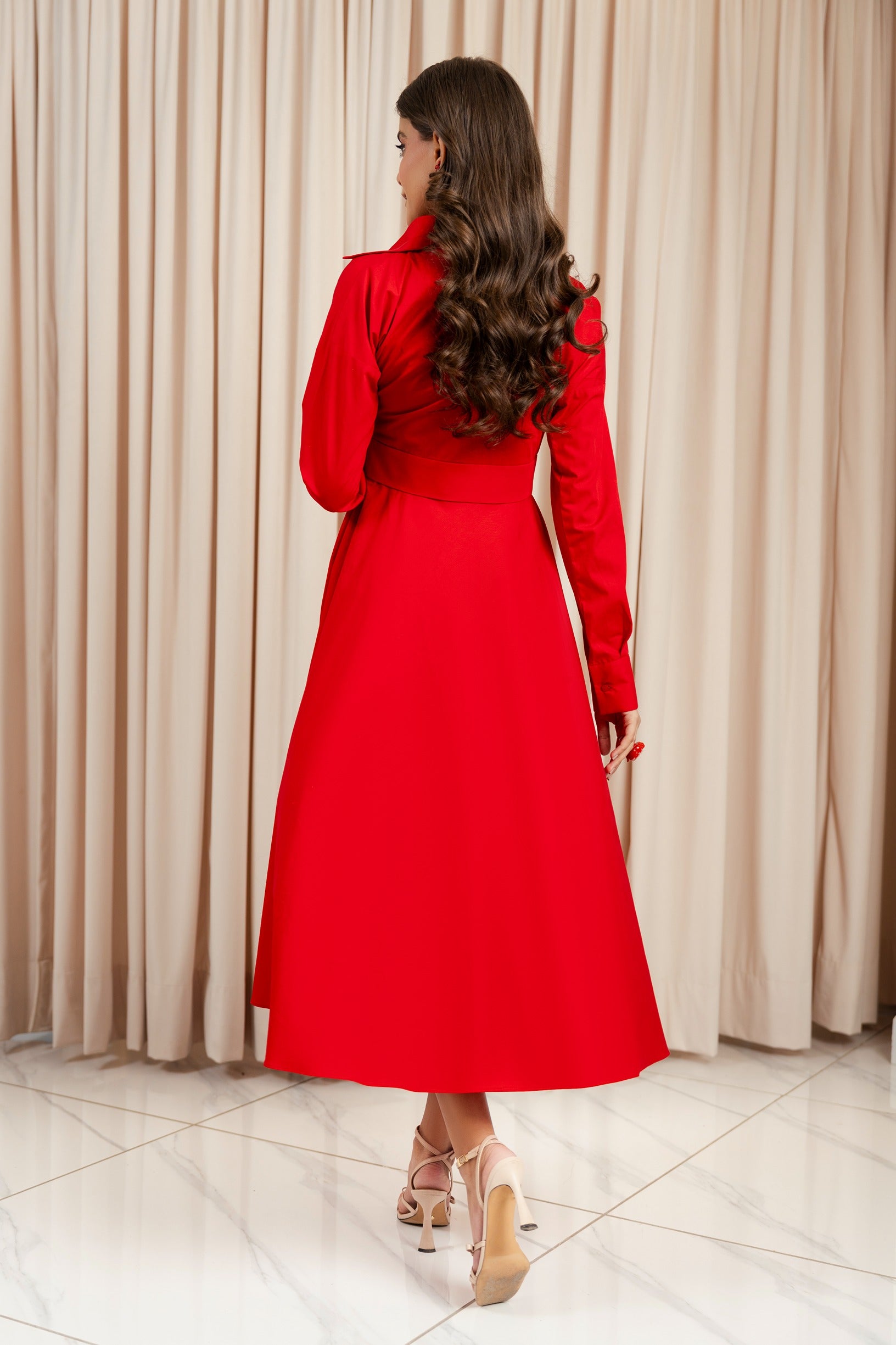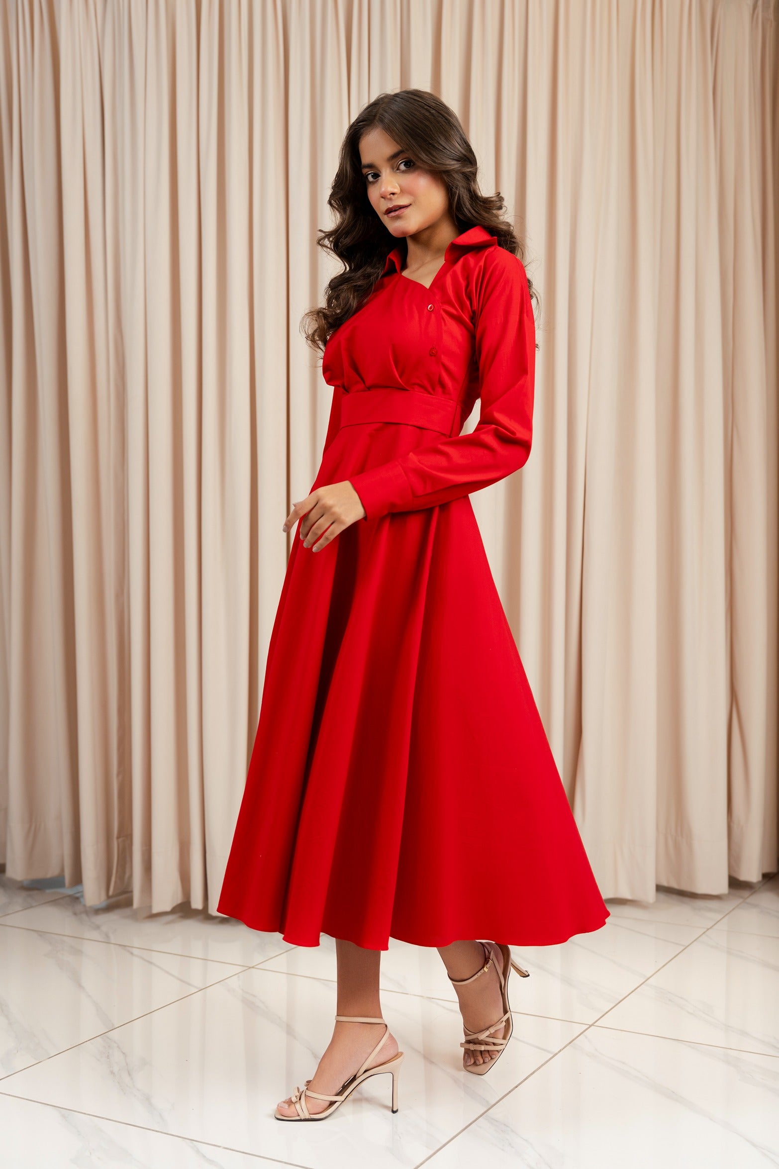 This captivating midi dress is a perfect blend of designer wear and casual wear, making it a versatile choice for any occasion. It features a flattering asymmetric neckline, long sleeves, a full skirt, this designer wear crafted for elevated everyday looks. The dress is both chic and playful, offering a touch of sophistication while remaining comfortable and easy to wear.