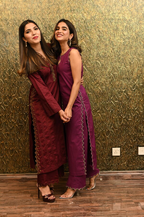 Cotton silk maroon matching separates with embroidery on neck, panels and pants.