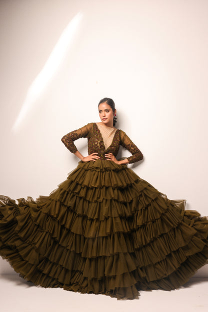 Out-of-a-Fairytale – this designer gown is a masterpiece of luxury wedding fashion, featuring delicate tulle ruffles -that a theatrical flair, seamlessly blending handcrafted heritage with a contemporary aesthetic.