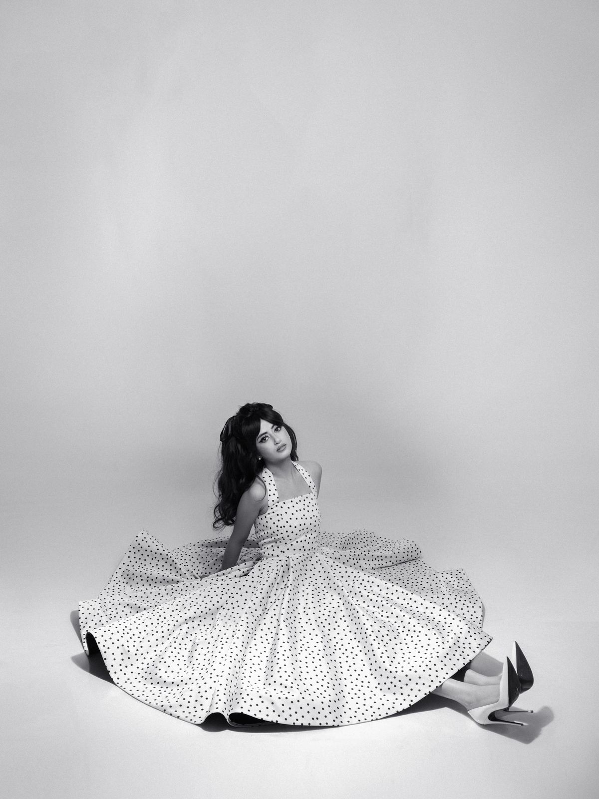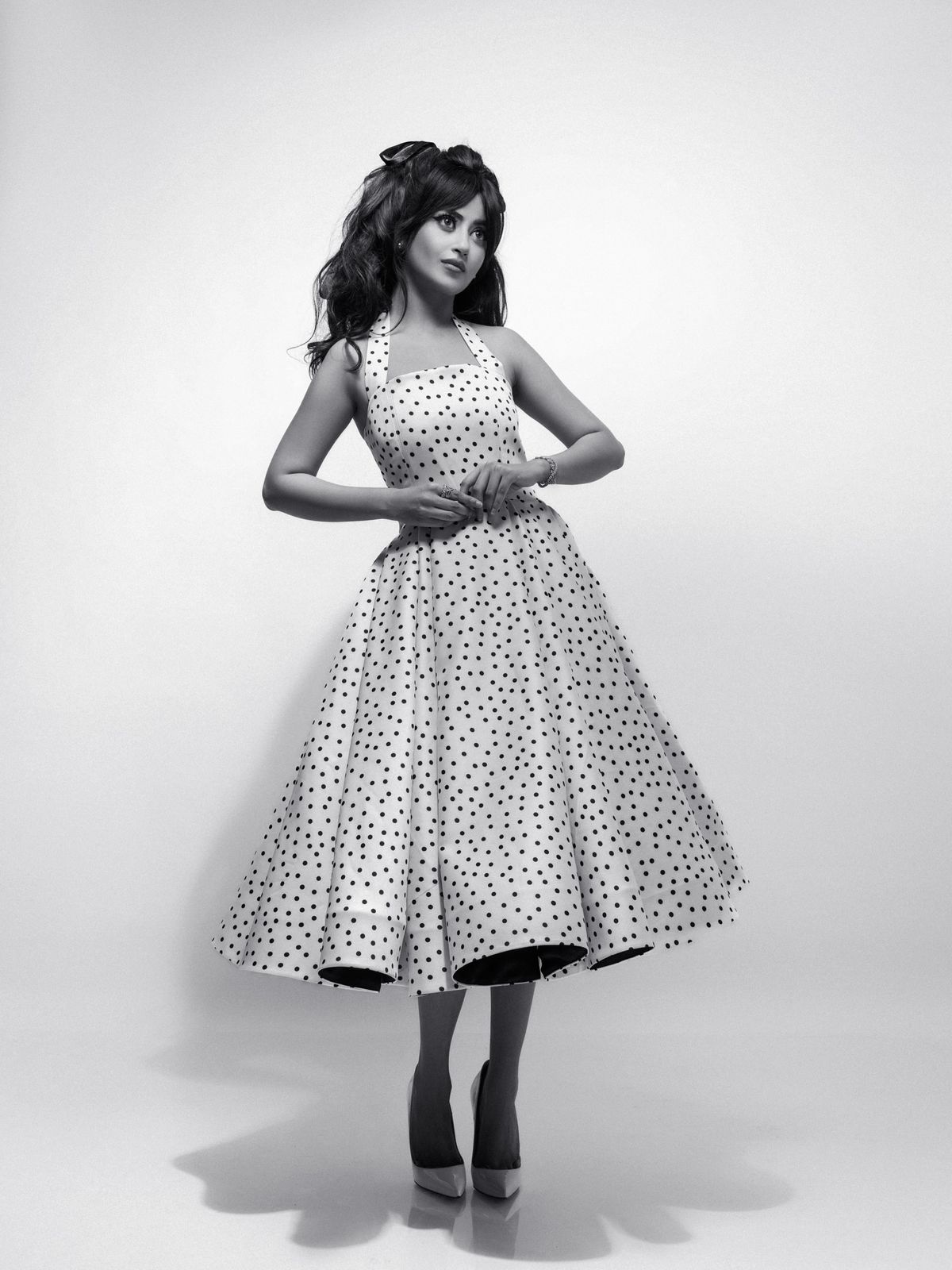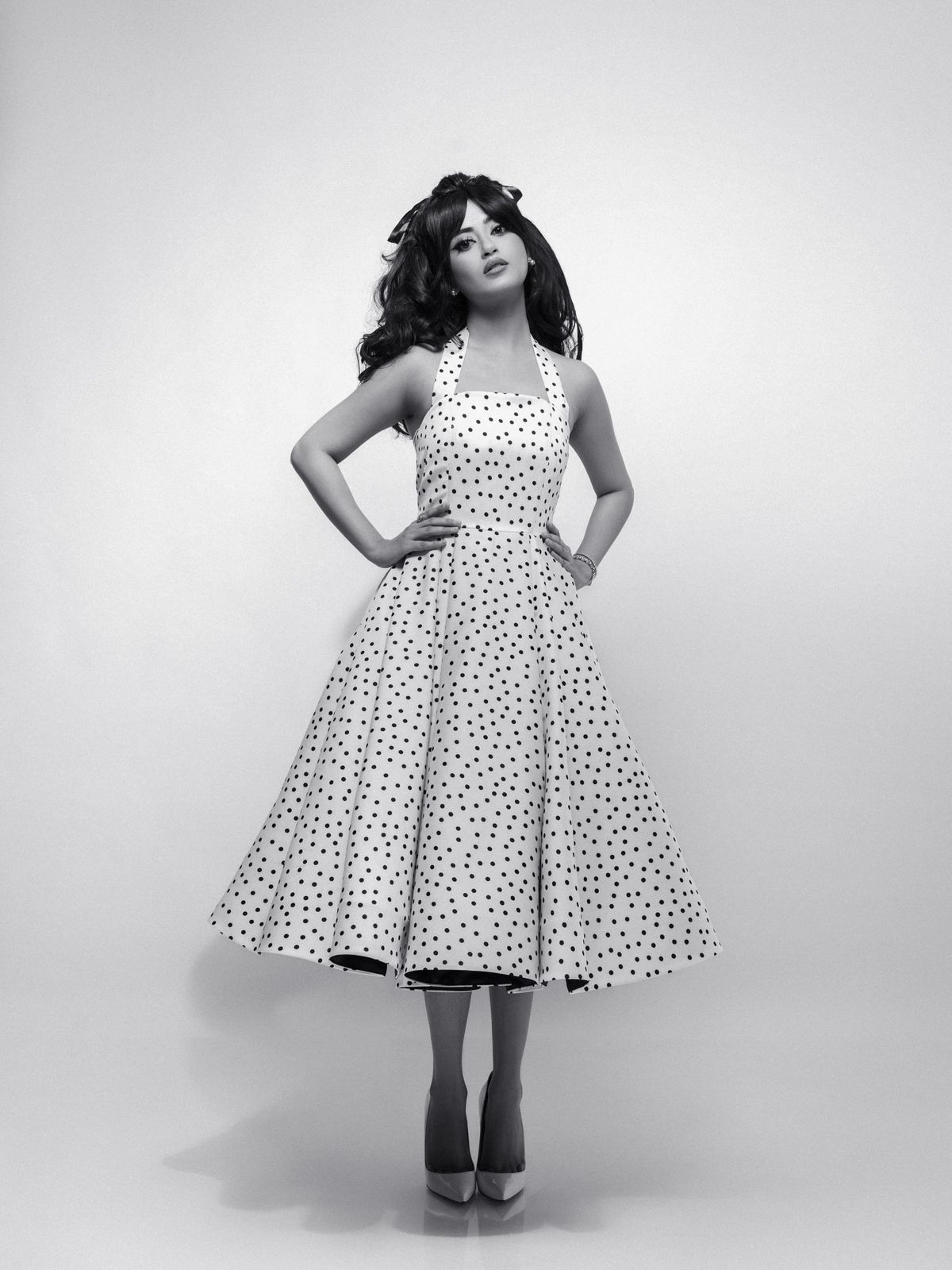 Sajal ali embodies vintage charm with a playful twist in classic monochrome polka dots. Crafted in a soft satin silk fabric, this retro-inspired dress features a halter neckline and a voluminous mid-length flare, evoking timeless femininity and grace. Perfect for making a statement at parties, or elegant soirées.
