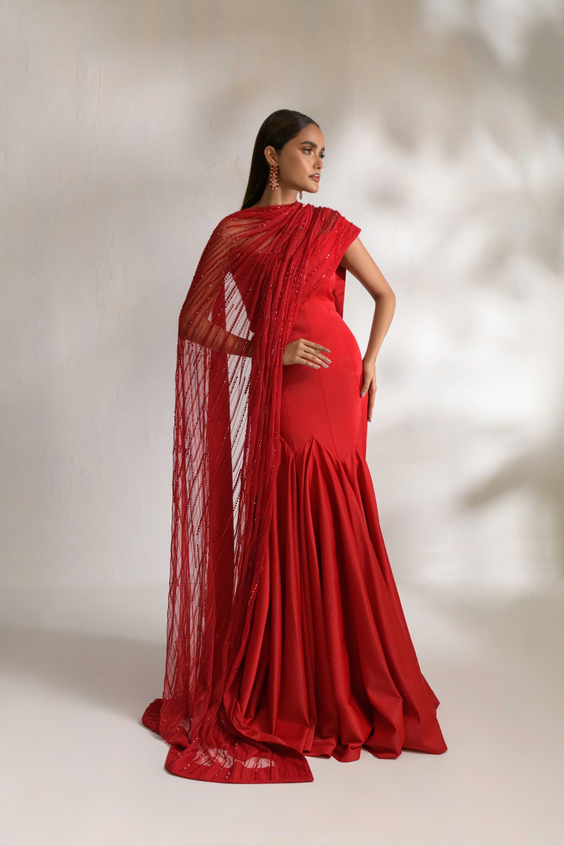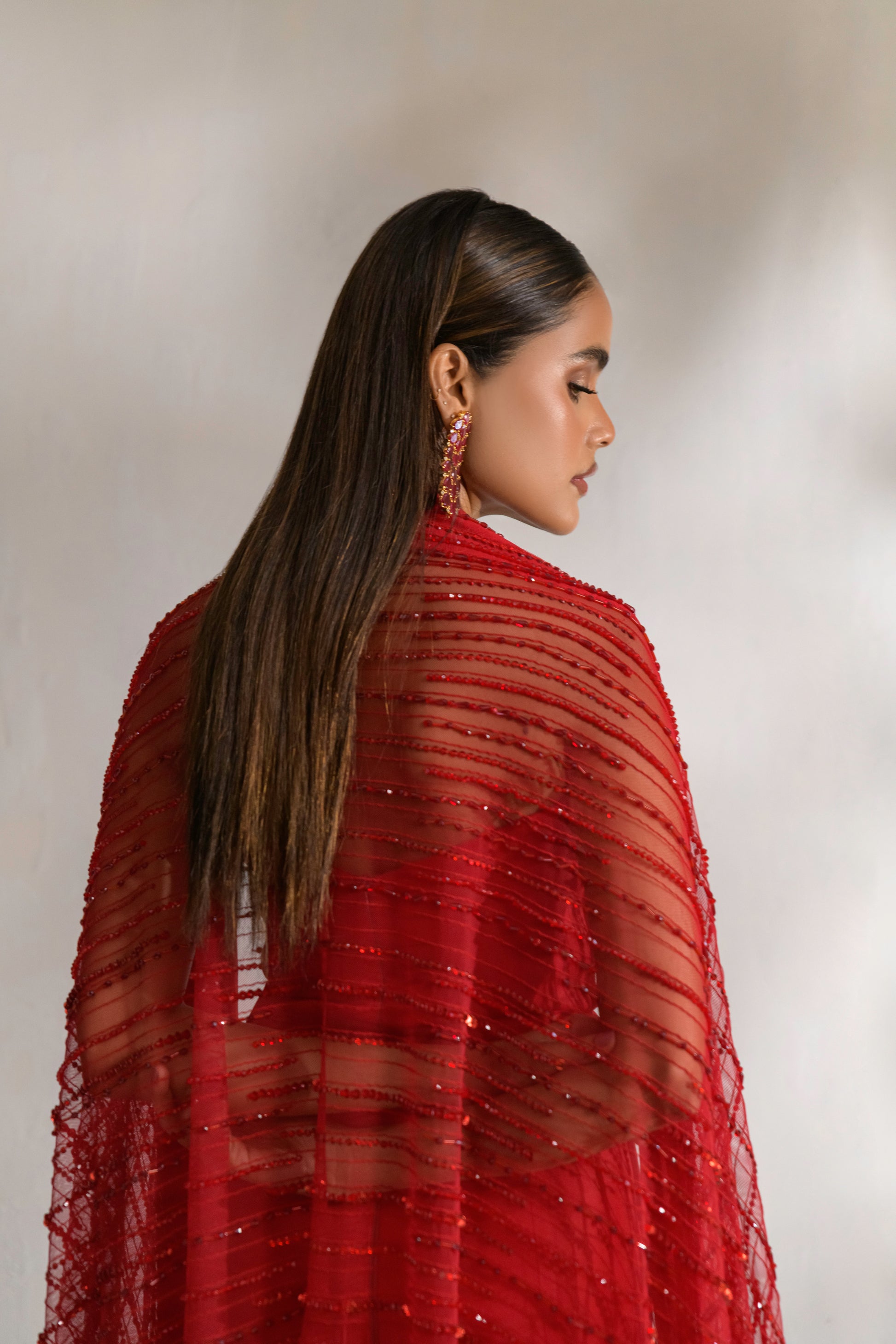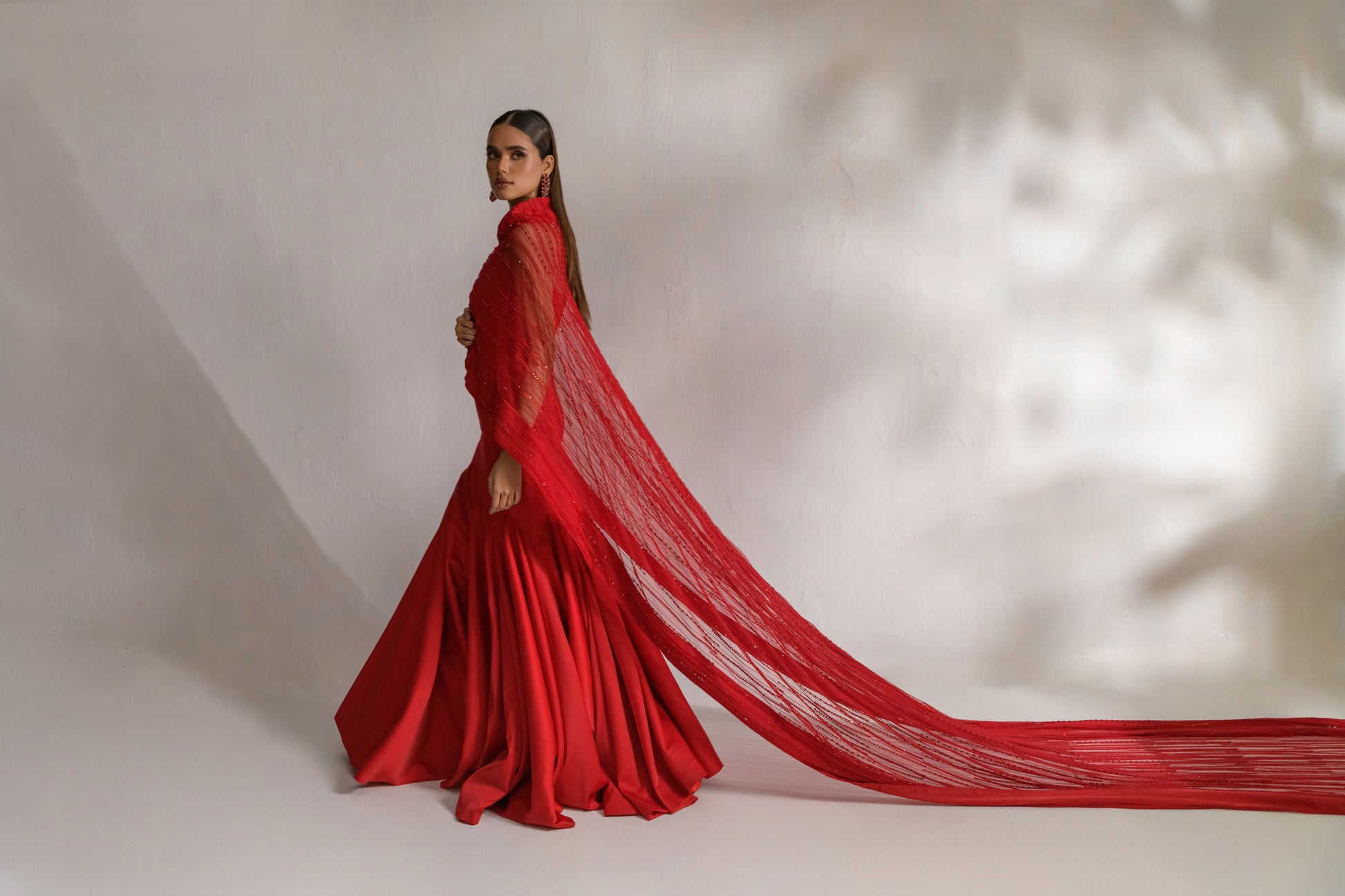 Indulge yourself in elegance this event season in Ruby, our premium haute couture gown. Carefully crafted in a deep red shade of our signature Premium silk, this formal piece is defined by a charming fully hand-embellished crystals veil/shoulder cape.