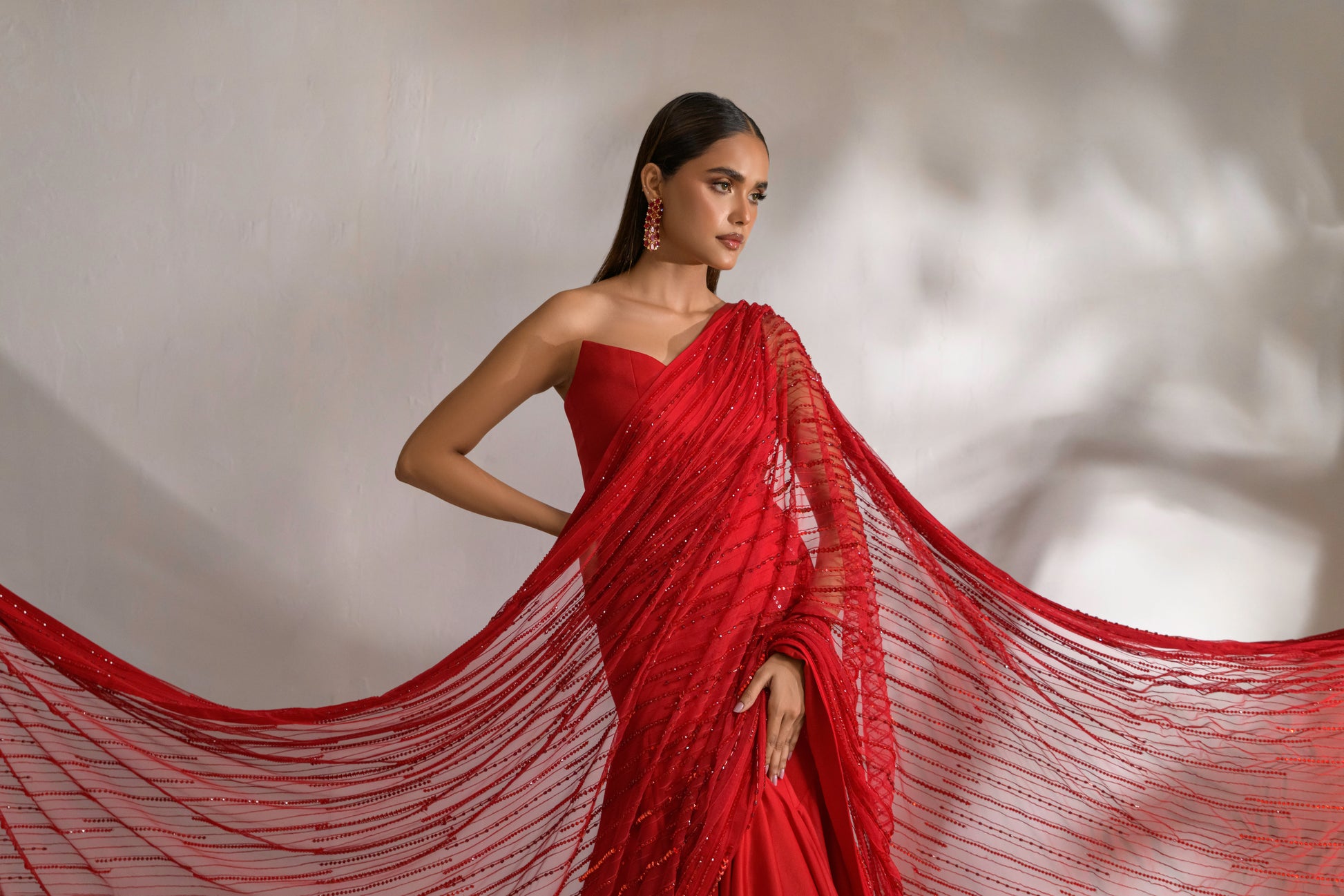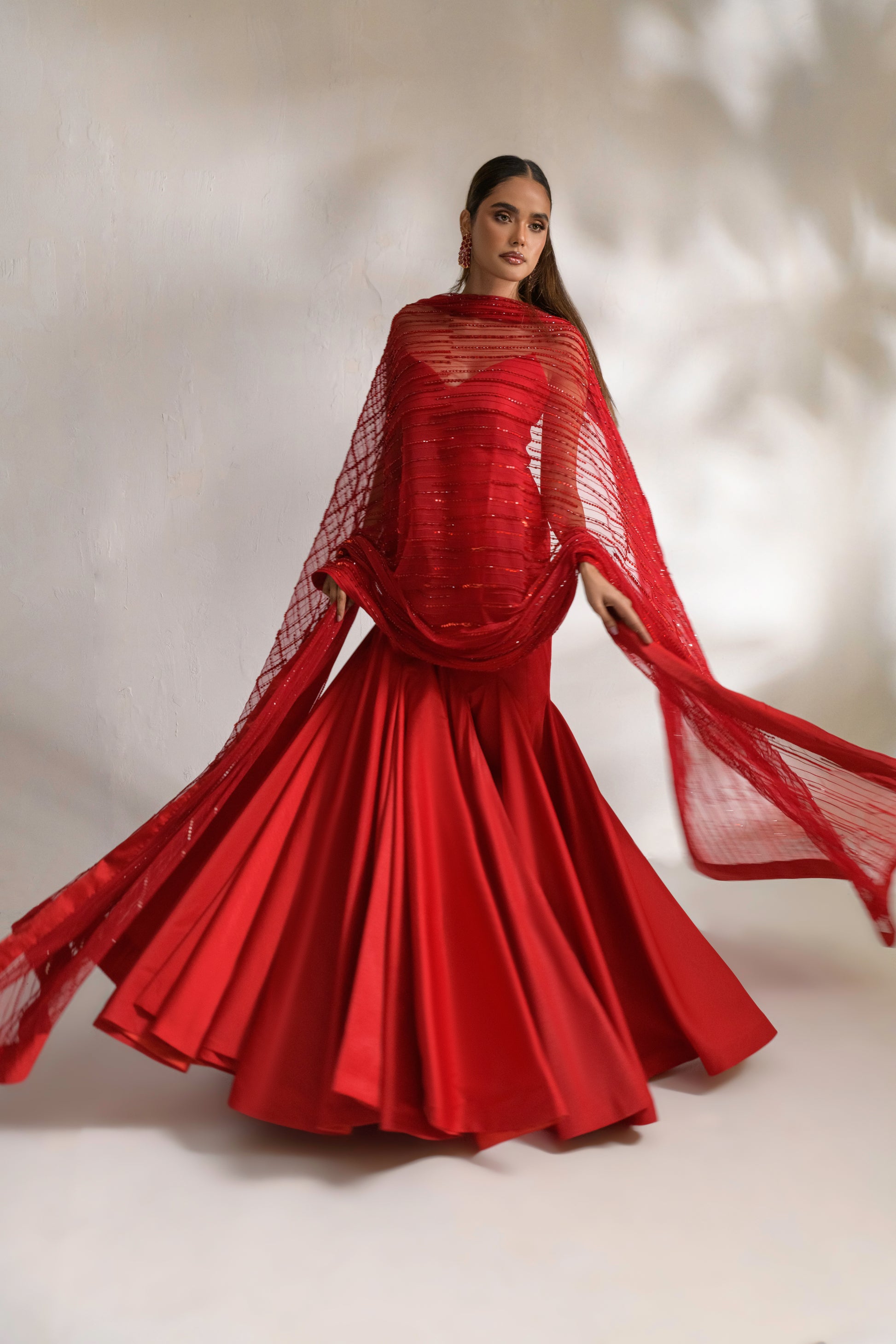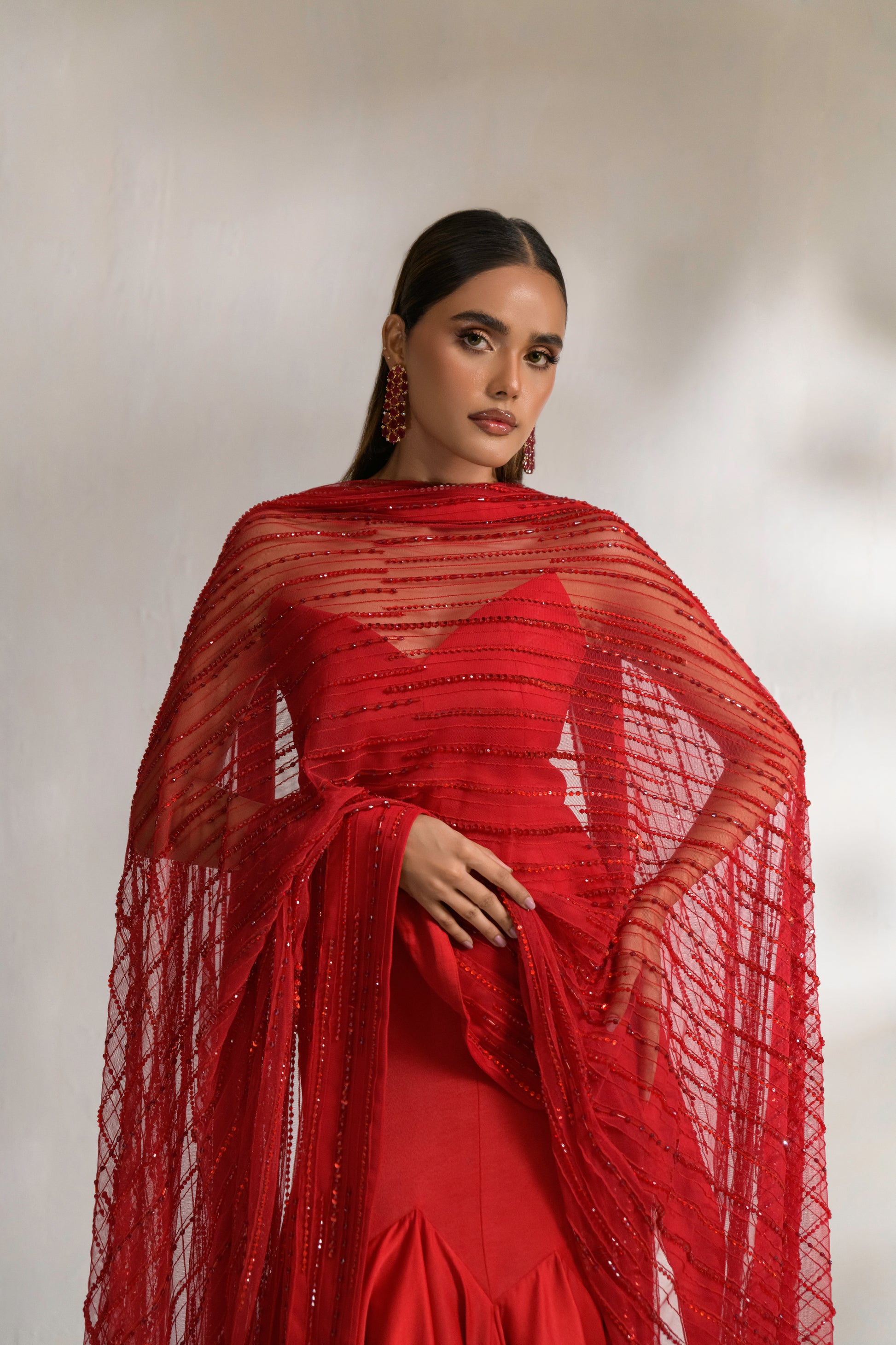 Indulge yourself in elegance this event season in Ruby, our premium haute couture gown. Carefully crafted in a deep red shade of our signature Premium silk, this formal piece is defined by a charming fully hand-embellished crystals veil/shoulder cape.