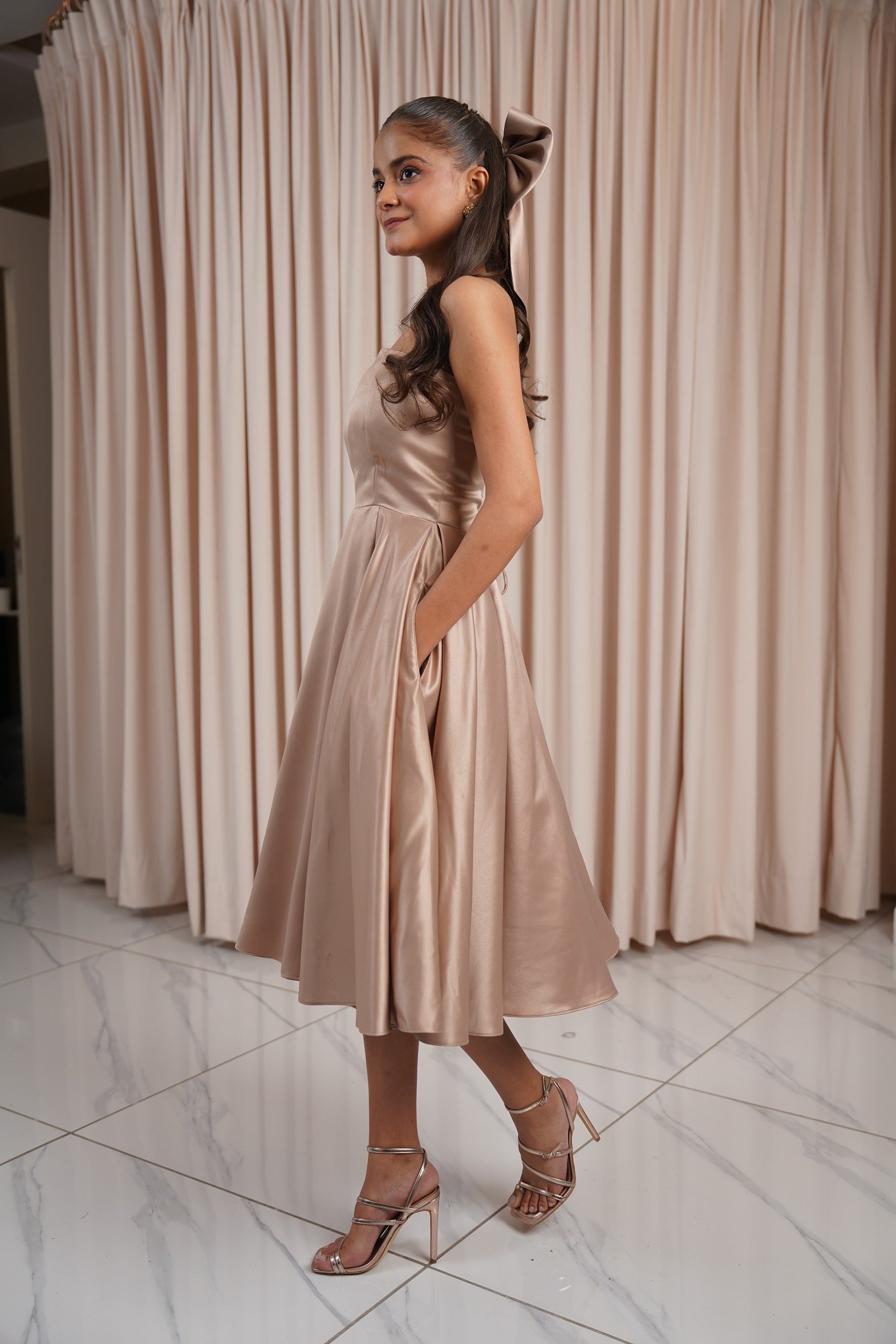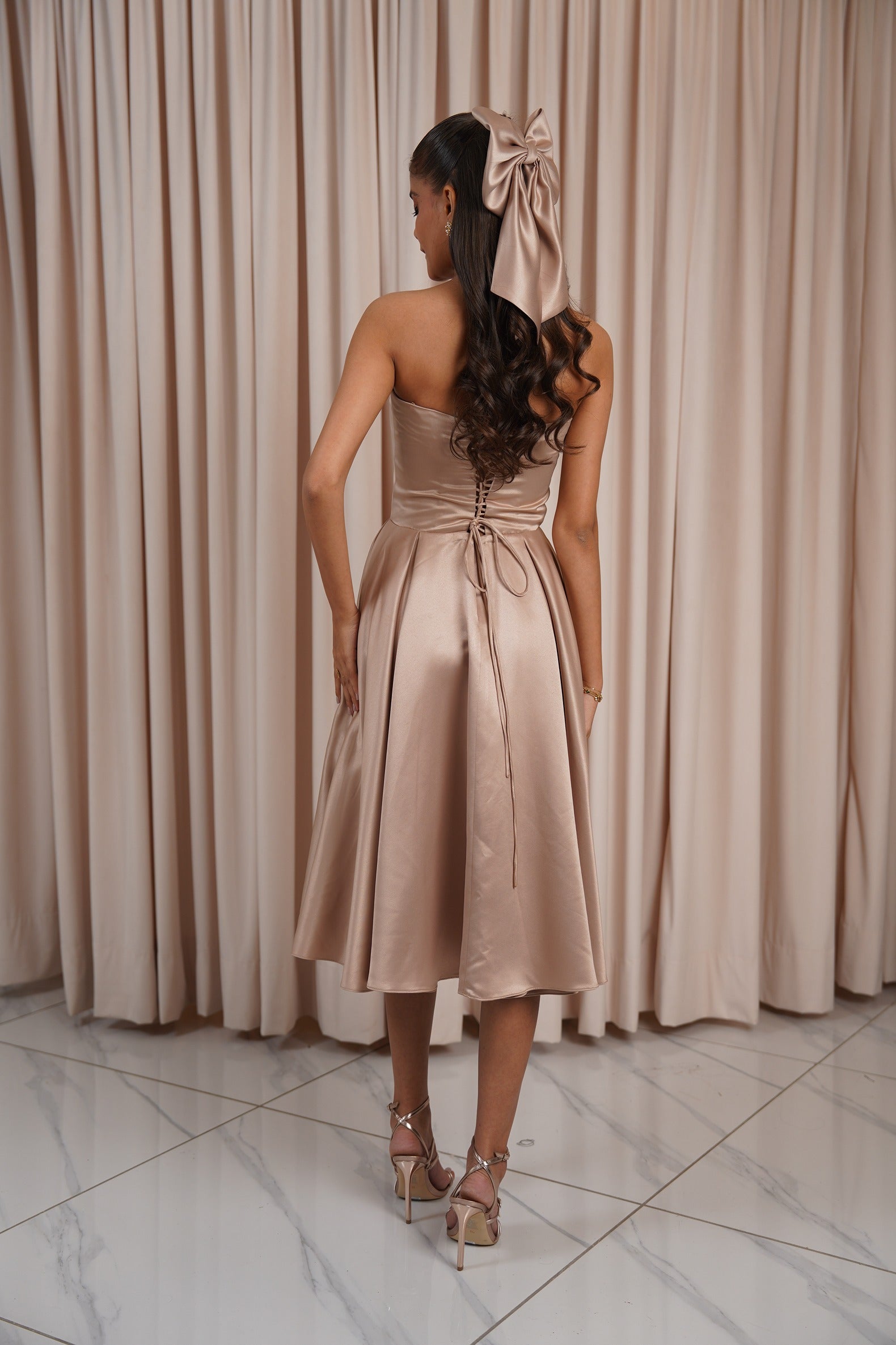 This premium silk midi dress is a dream come true! It's a true statement piece, perfect for a special occasion or a night out. The strapless bodice hugs your curves, while the full, flowing A-line skirt adds a touch of whimsy. The luxurious fabric drapes beautifully and feels incredible against your skin. This designer dress is a must-have for any fashion-forward woman. It's a perfect blend of elegance and playfulness, making it the perfect choice for any event.