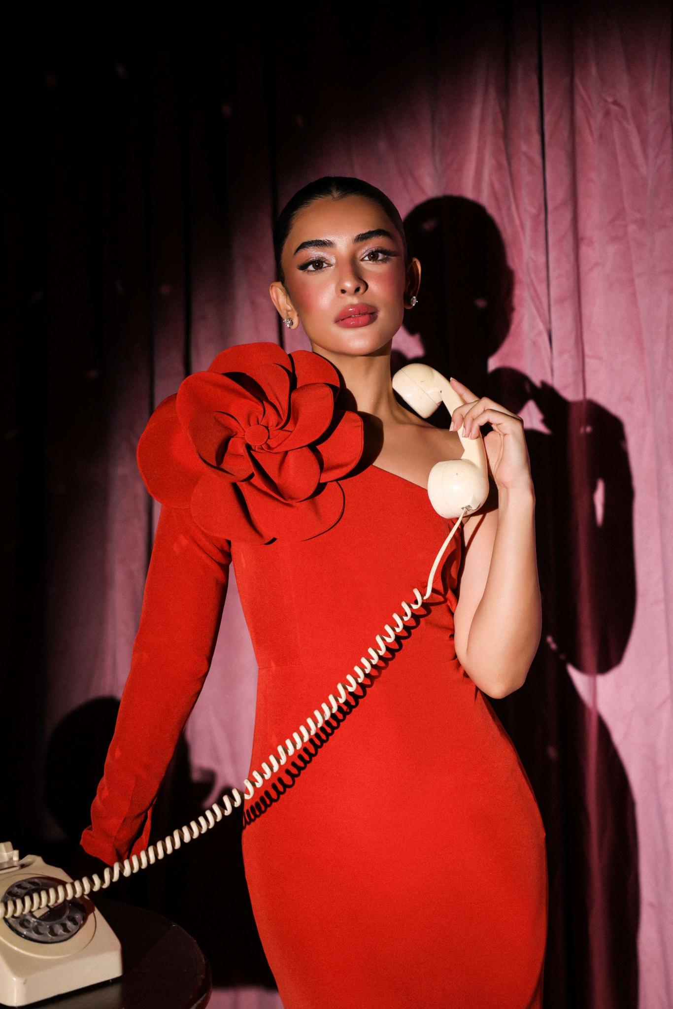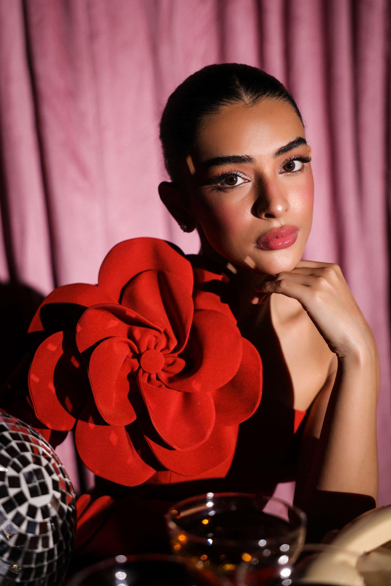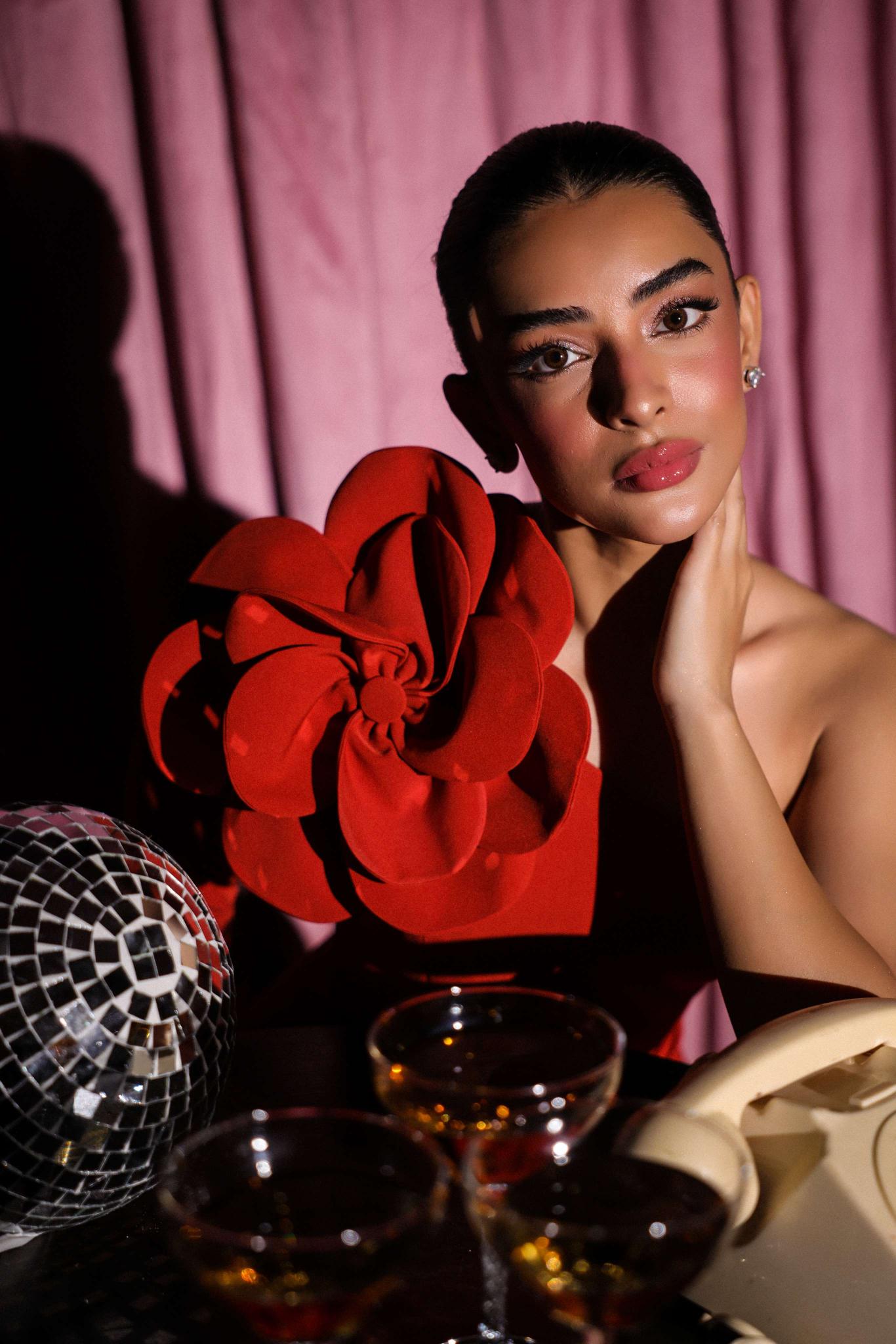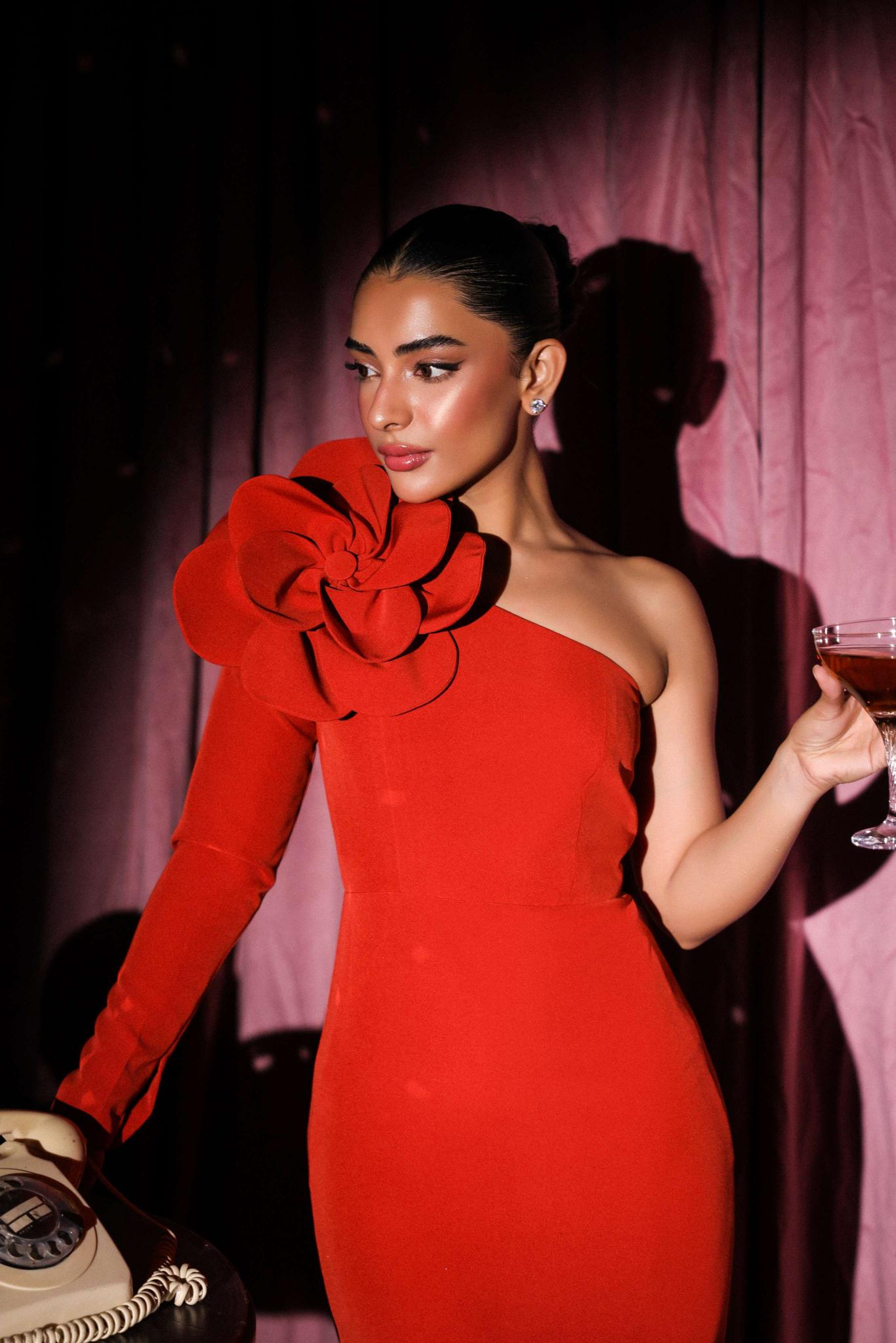 This captivating rust gown celebrates bold femininity with a touch of drama. The one-shoulder design is elevated by an oversized sculpted floral detail, adding a statement flourish to its clean, structured silhouette. Crafted from spandex fabric that hugs the body perfectly, the gown combines sophistication with a sense of playful confidence.