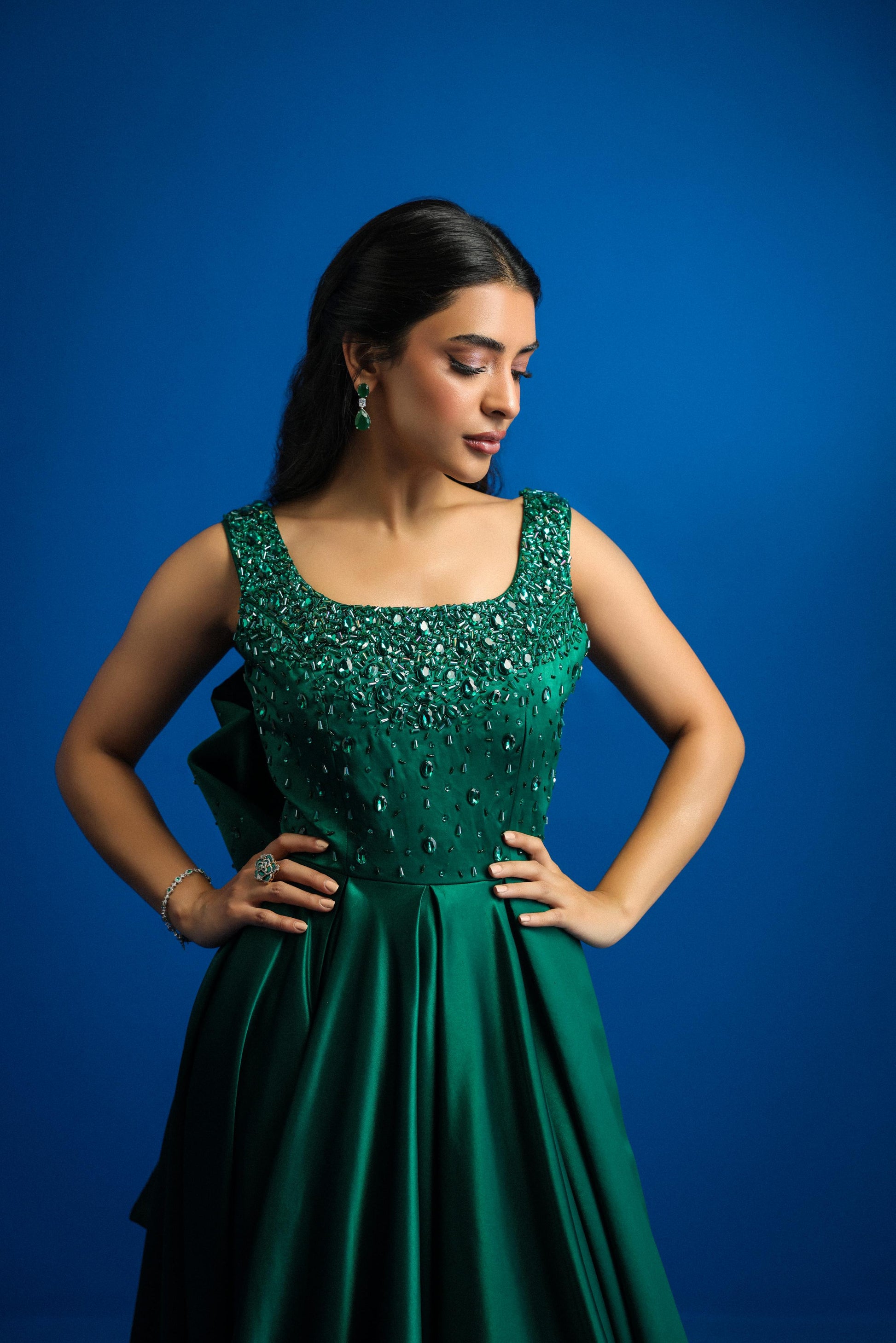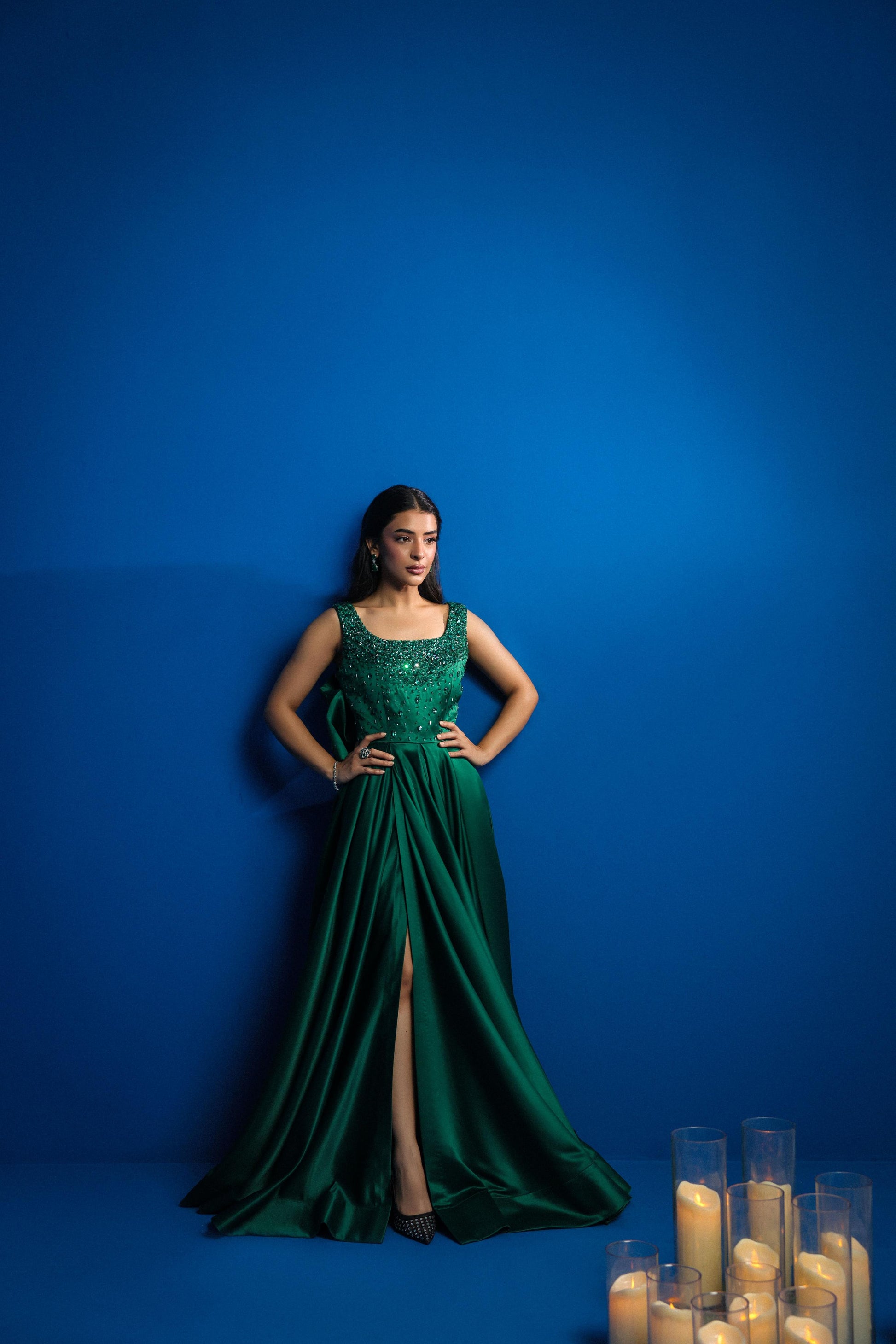 Step into timeless sophistication with our Emerald Green Gown, a statement of grace and magnificence. Crafted from luxurious premium silk fabric, this floor-length masterpiece flows effortlessly with every movement. The fitted bodice, adorned with intricate Austin Swarovski beadwork and delicate embroidery, adds a radiant sparkle that catches the light beautifully.