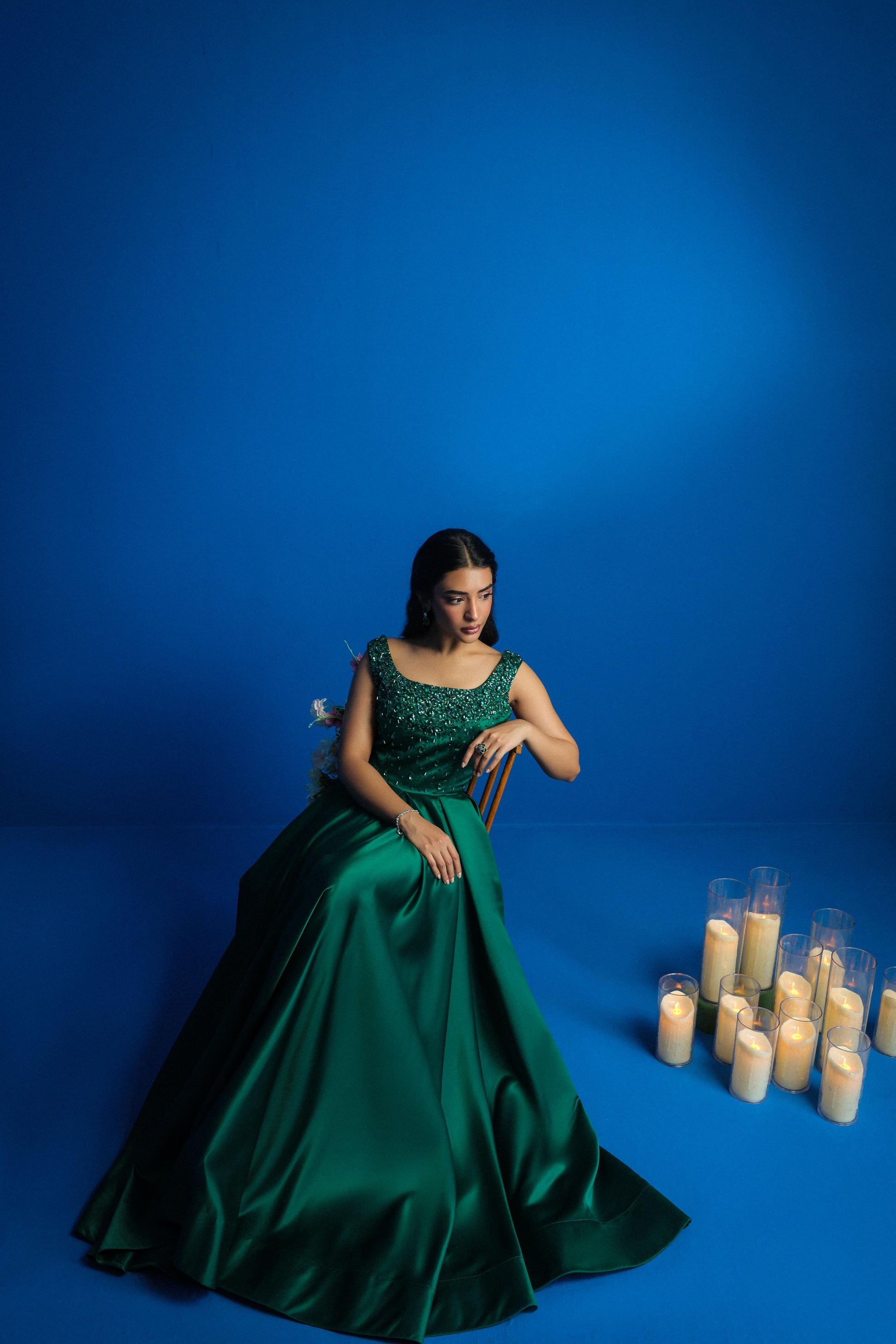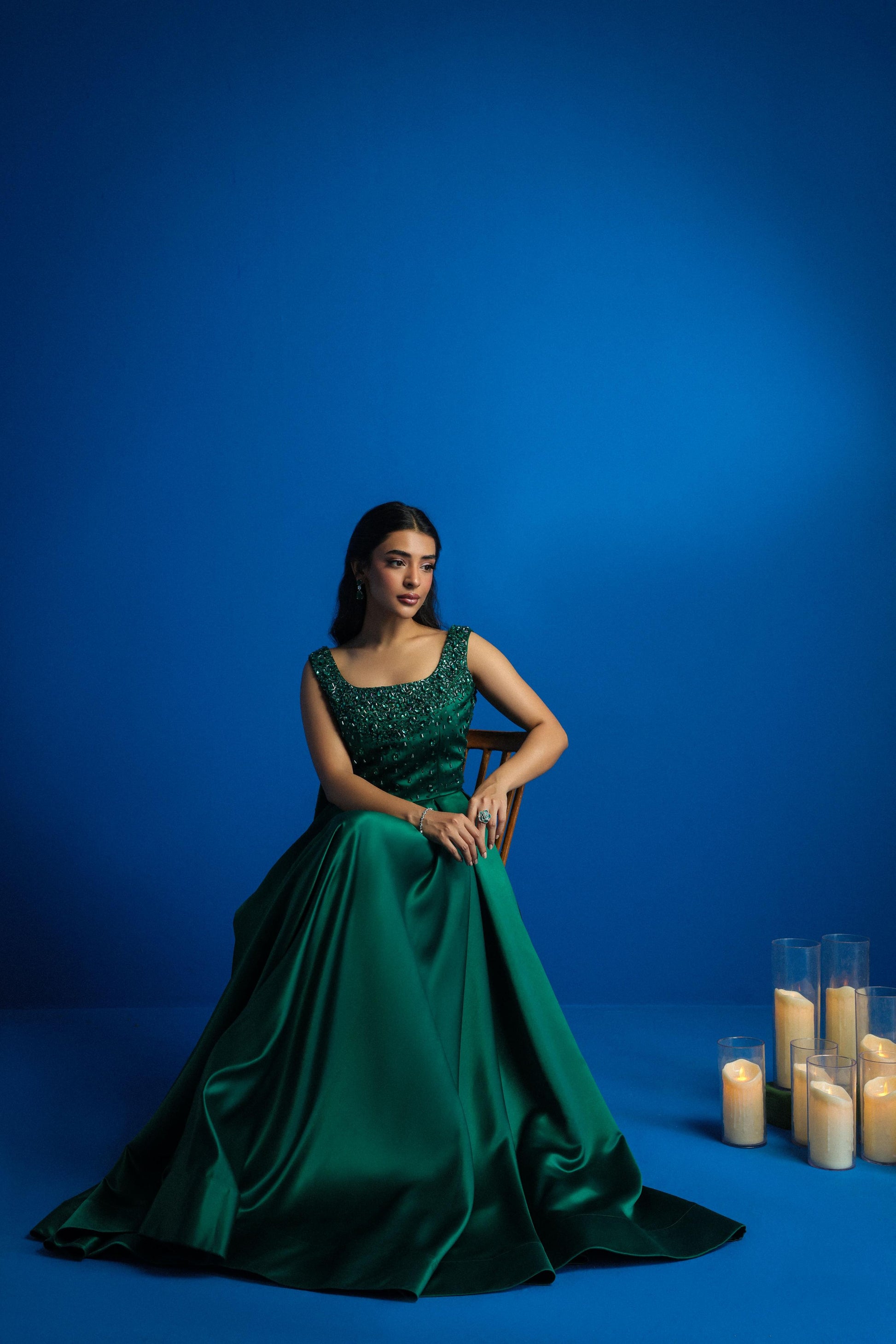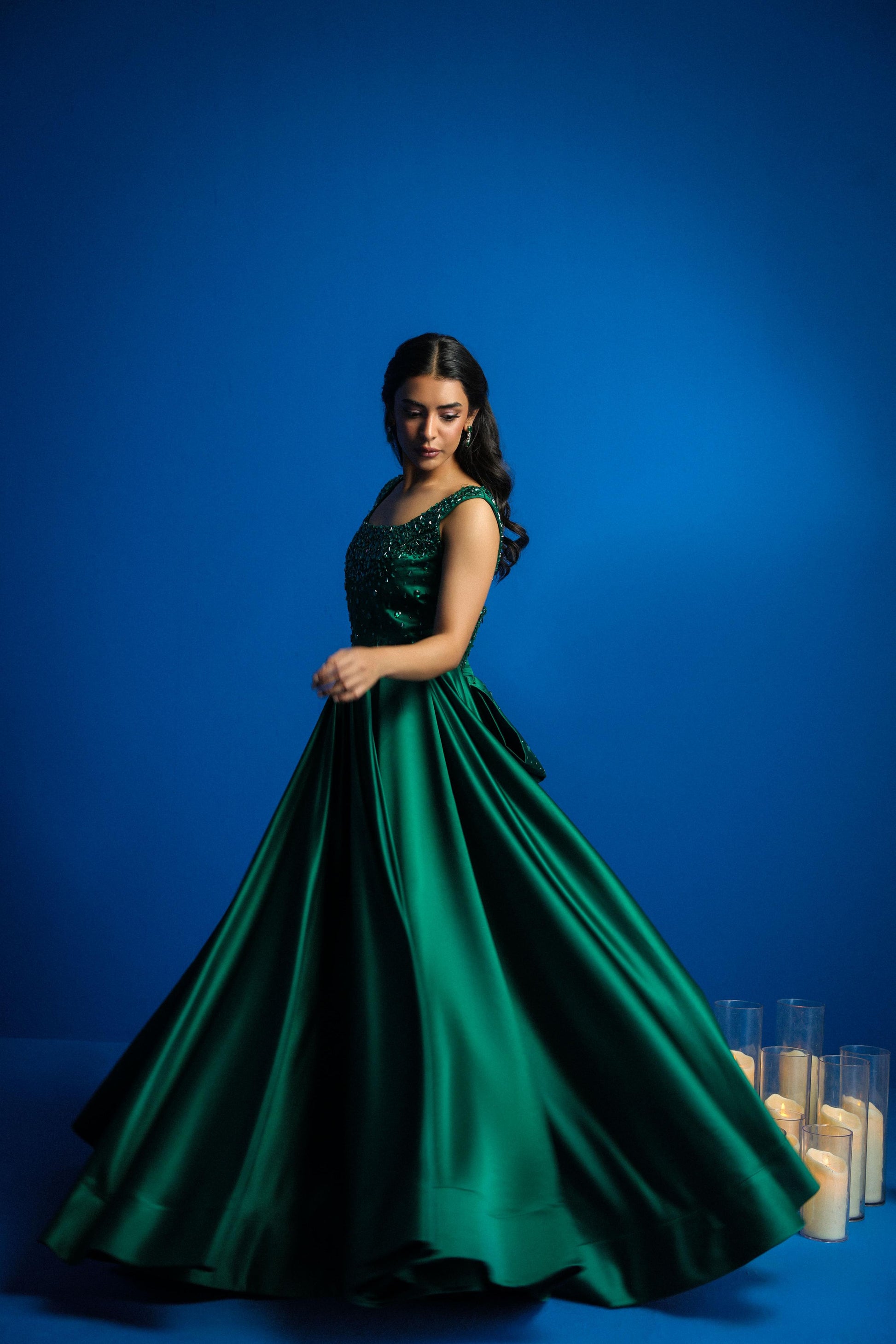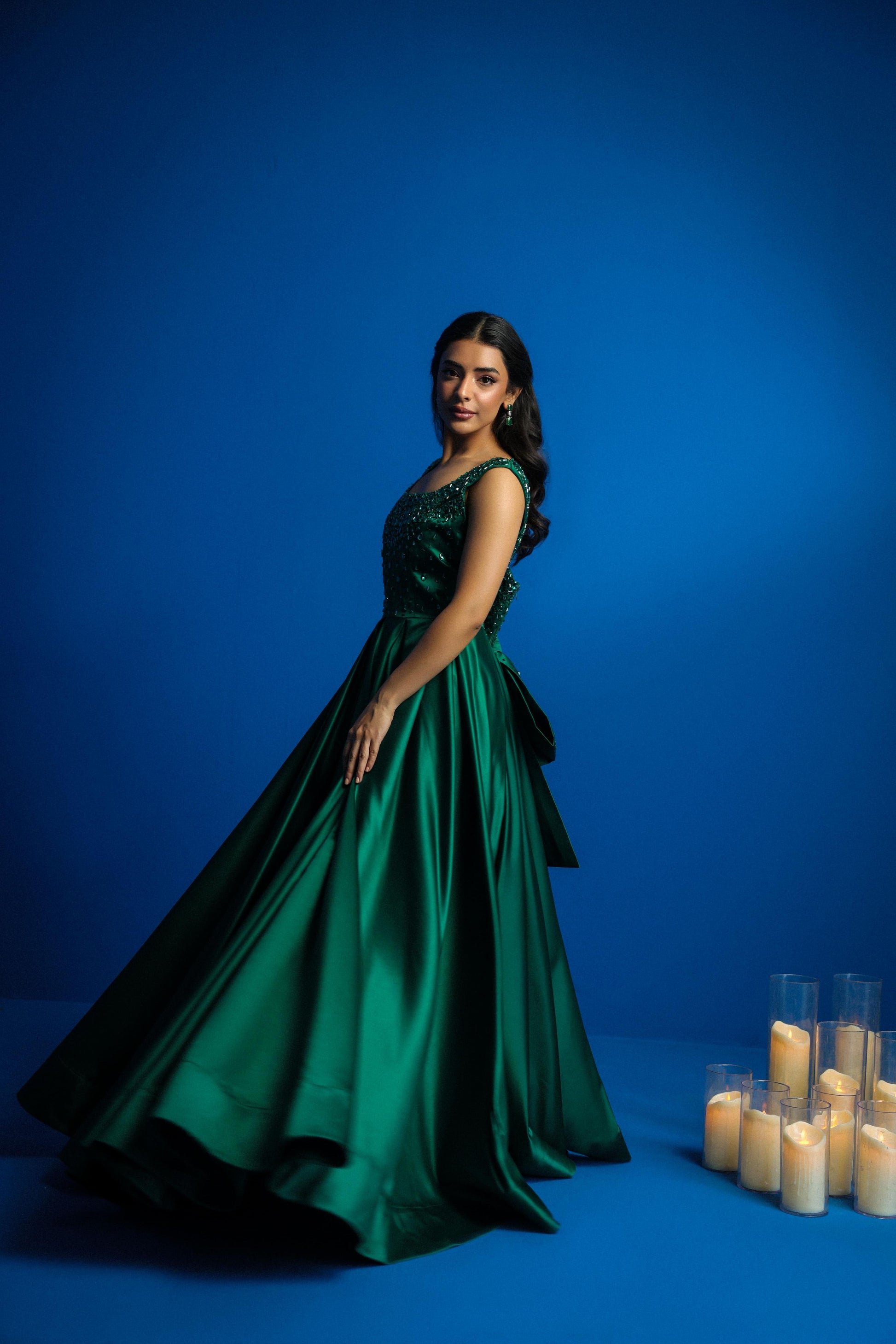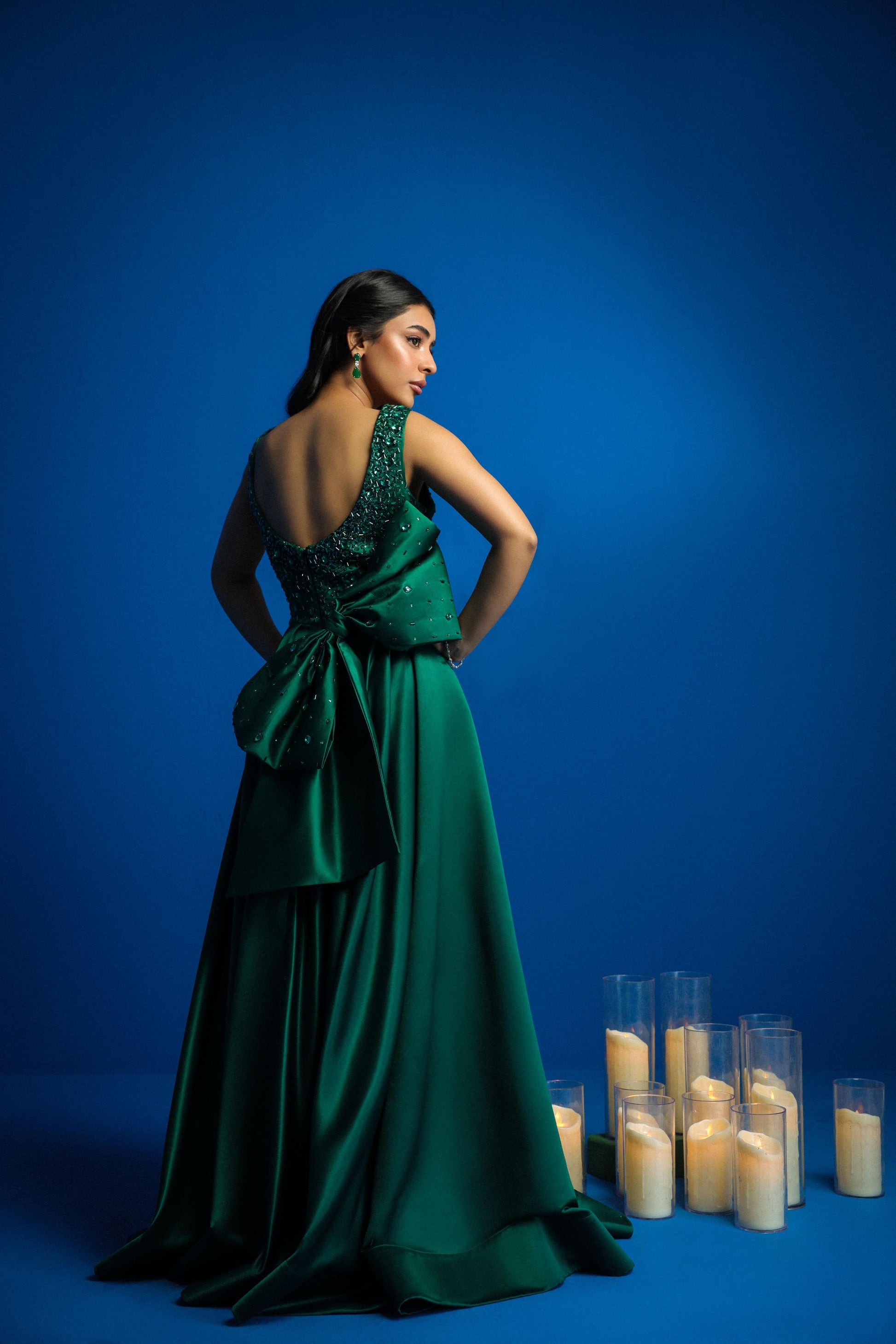 The rich emerald hue evokes a sense of royalty and calm elegance perfect for evening wear, red carpet moments, or intimate celebrations.
