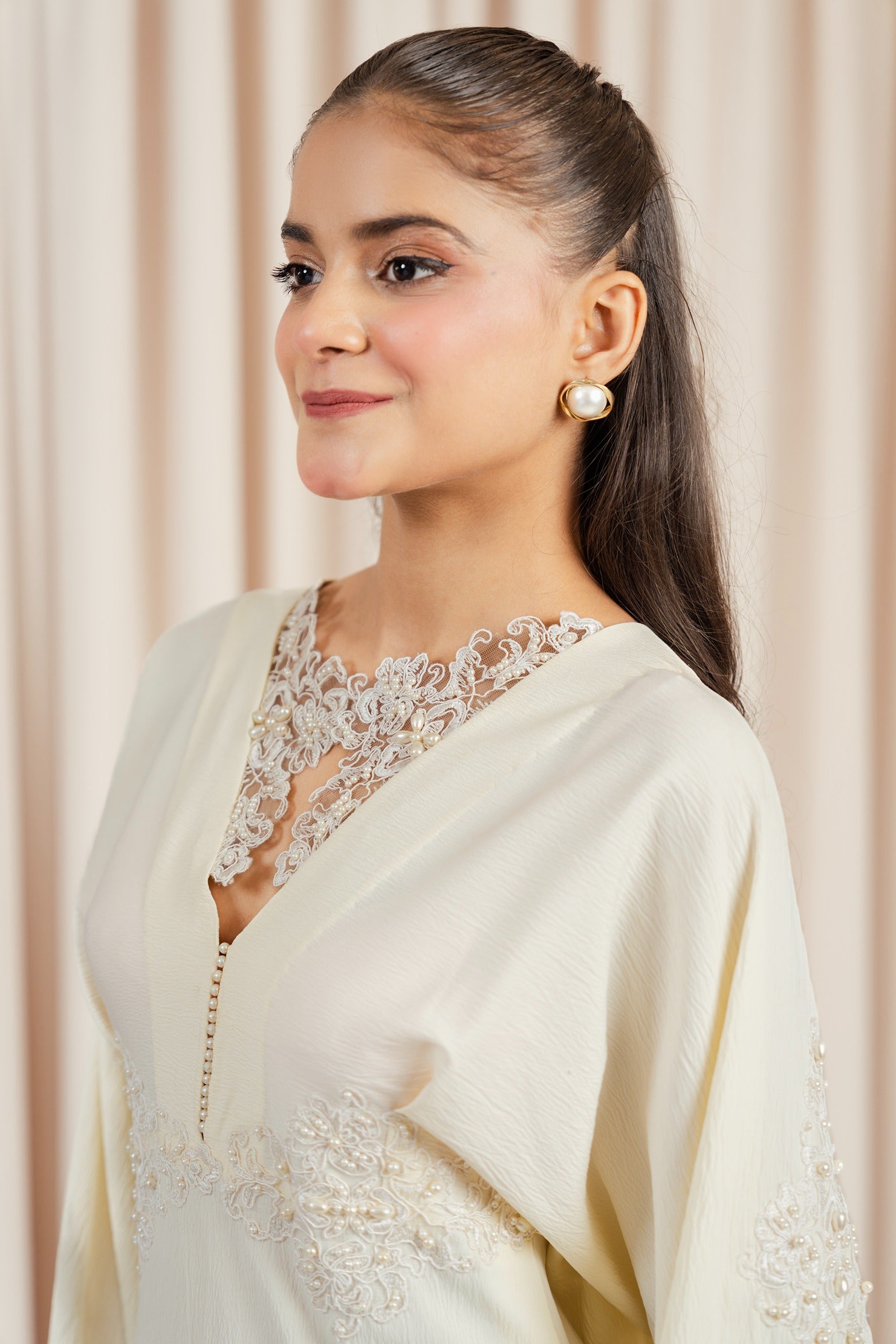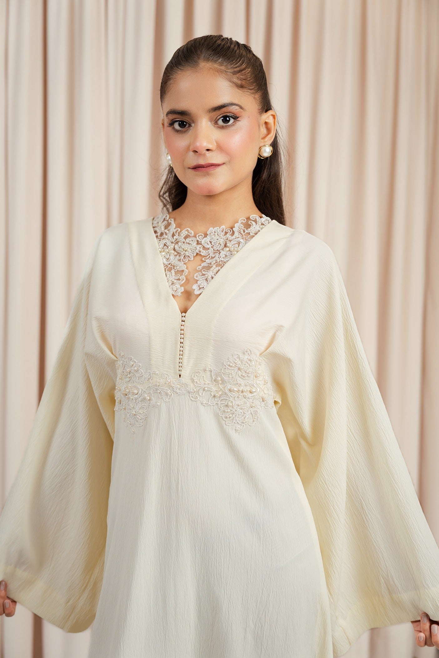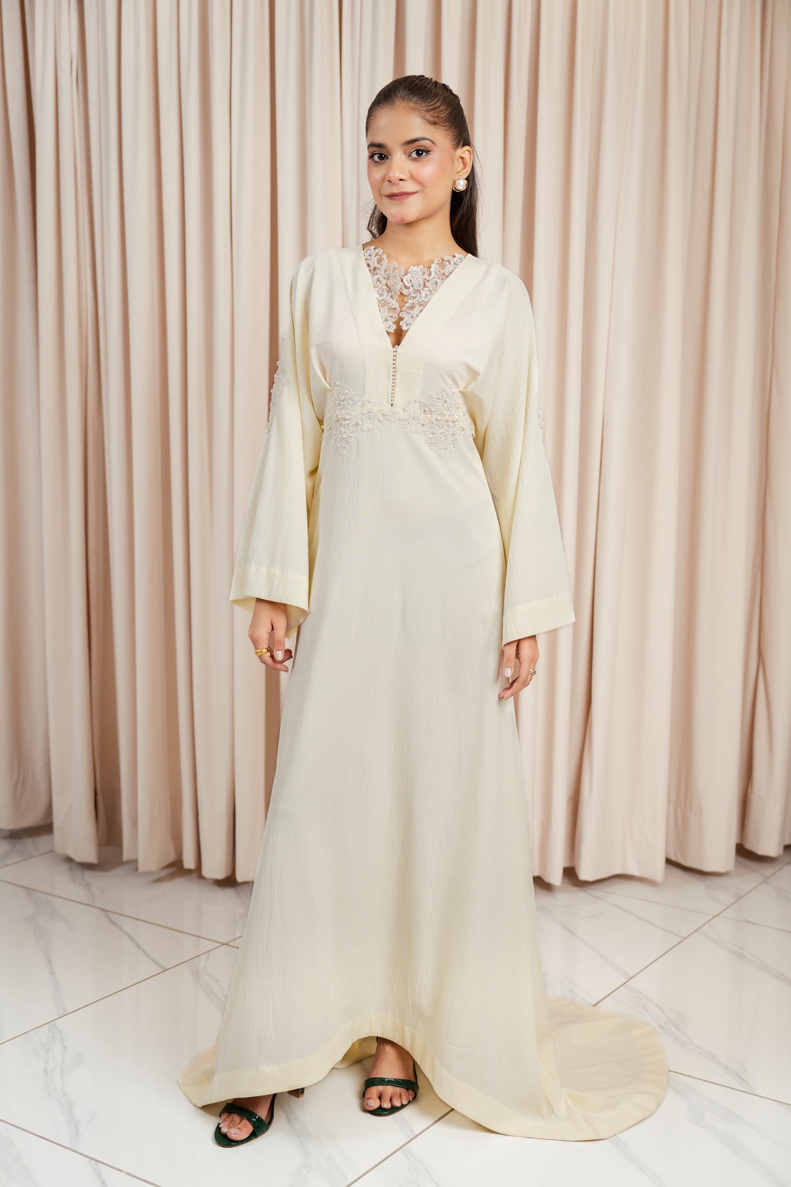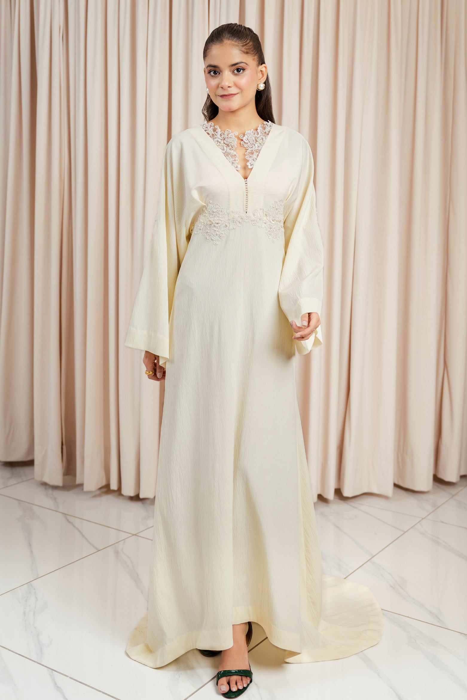 A vision of refined beauty, this ivory embroidered gown is the epitome of timeless sophistication. Designed in a flowing silhouette, this piece features a soft textured base, complemented by delicate lace detailing around the neckline and waist, enhancing its romantic charm. The deep neckline with sheer lace inset adds a modern edge, while the flared long sleeves offer graceful movement.