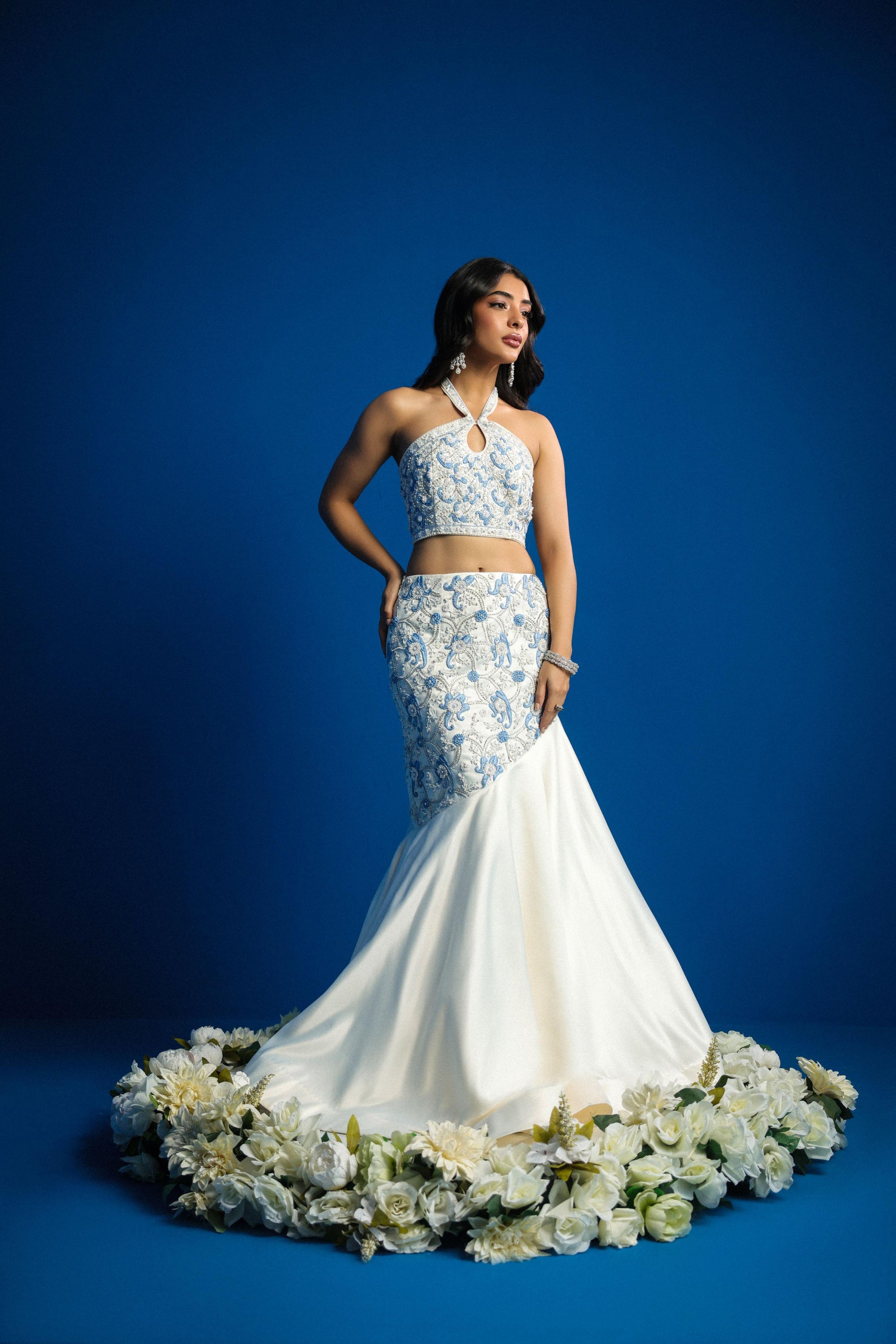 · White blouse with blue intricate embroidery adorns this halter neck top adding a touch of sophistication