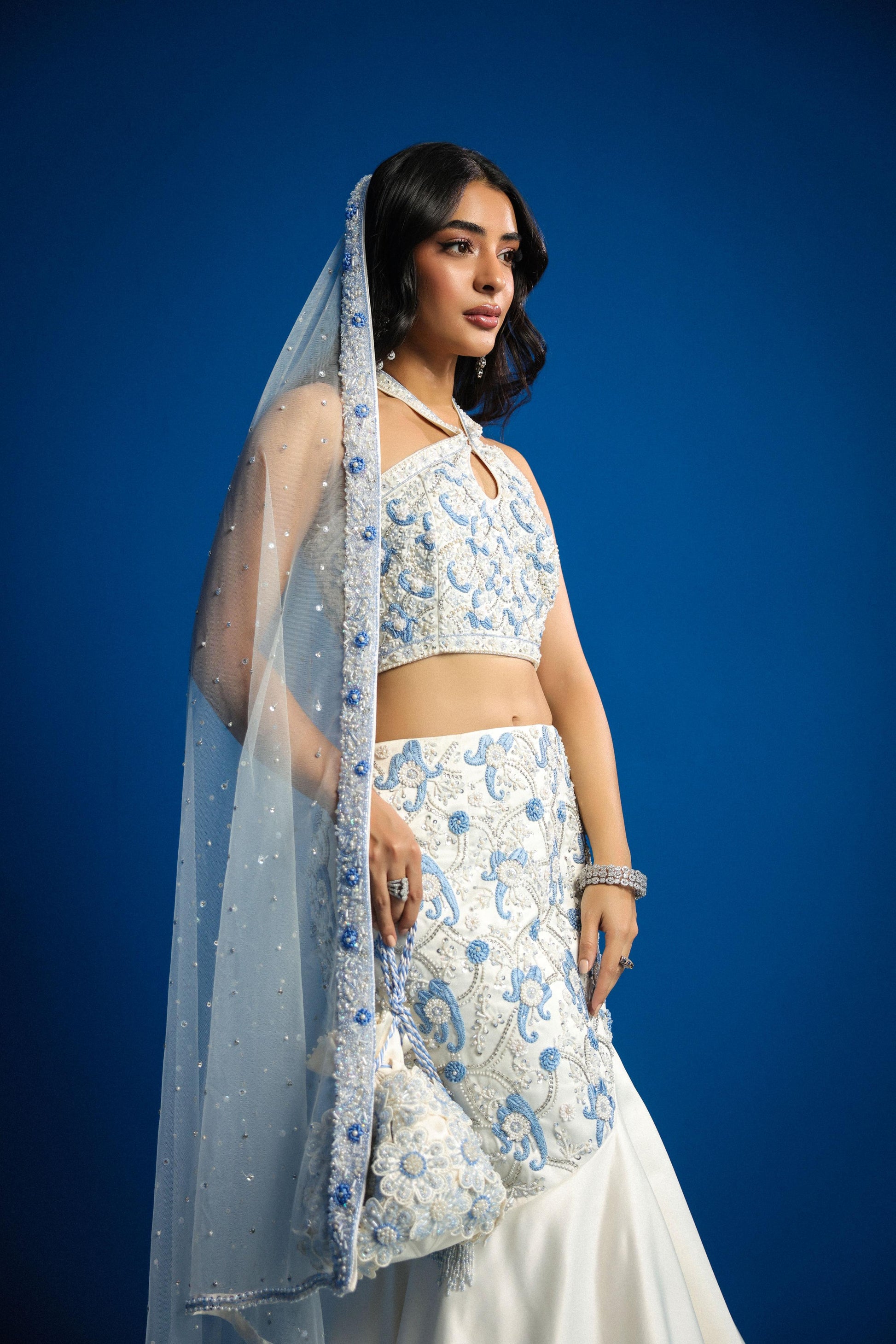 · Long straight dupatta with embroidered border in shades of blue and white enhances the traditional elegance of the ensemble
