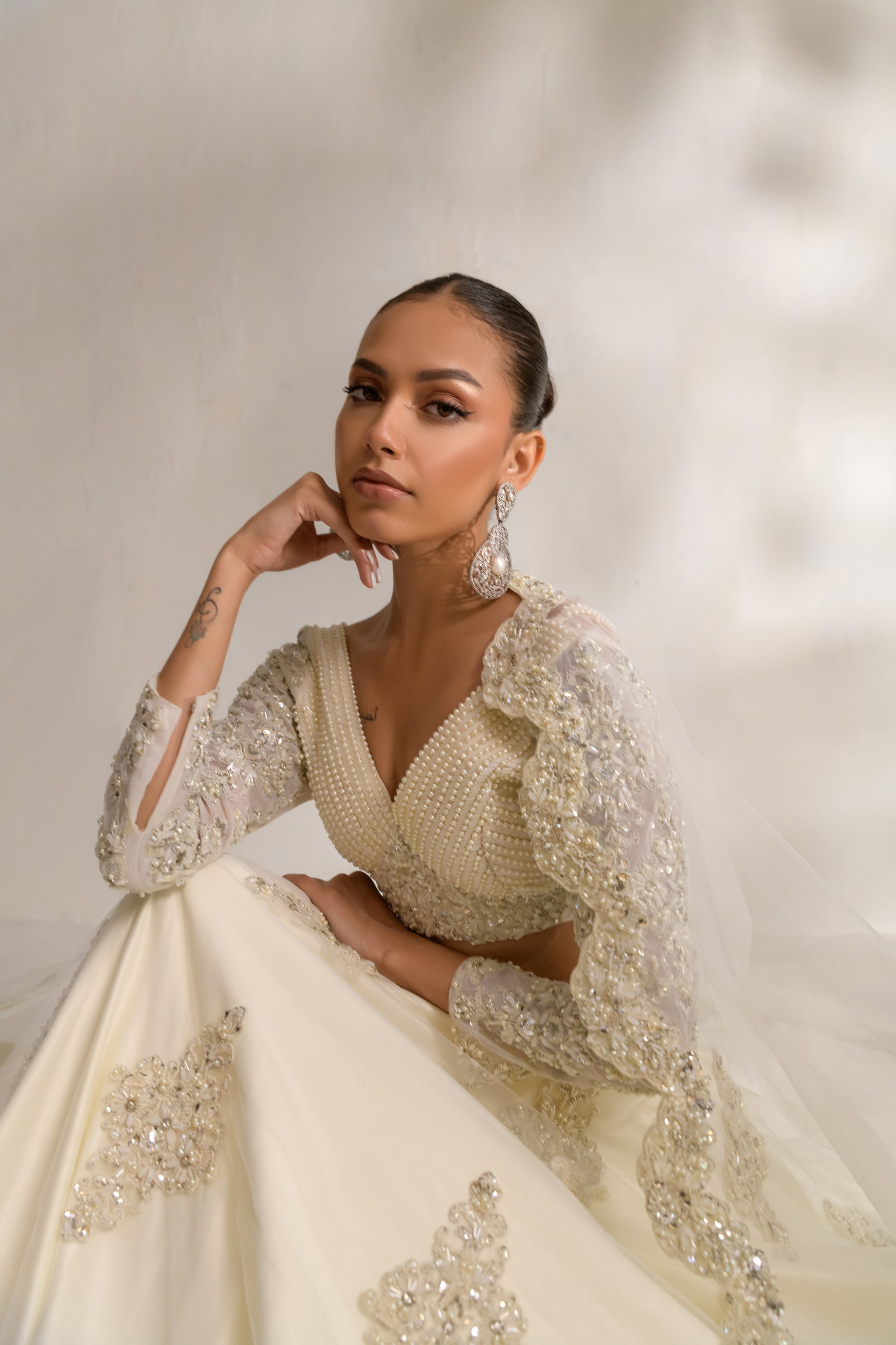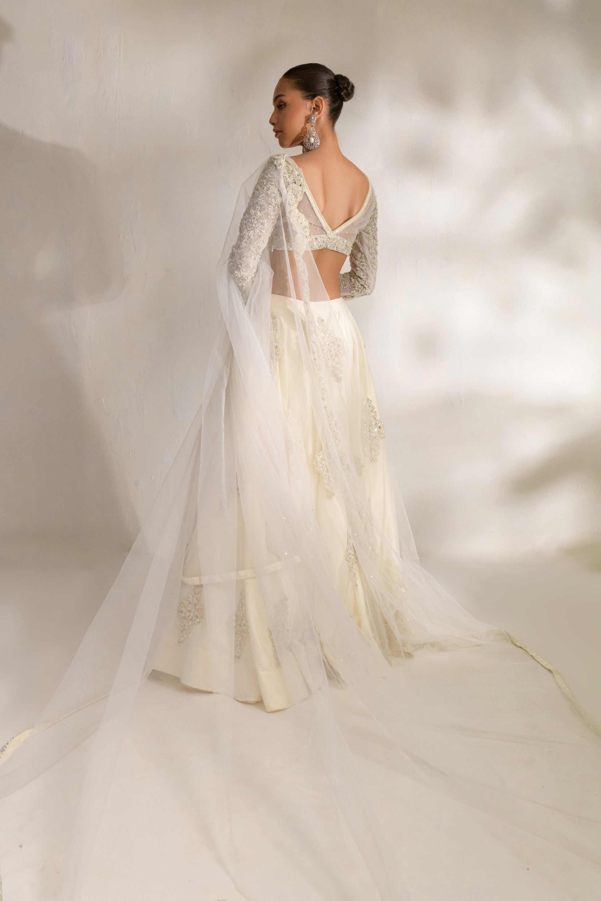 This exquisite designer dress features a luxurious white premium net fabric that drapes beautifully. The intricate marori thread work adds a touch of elegance, while the shimmering silver sequin catch the light, creating a dazzling effect. This designer dress is adorned with delicate white crystal work, enhancing its overall sophistication. A meticulously crafted cut work board showcases stunning embellishments, and the border is elegantly embroidered with pearls, making this piece a perfect choice for evening wear or special occasions.