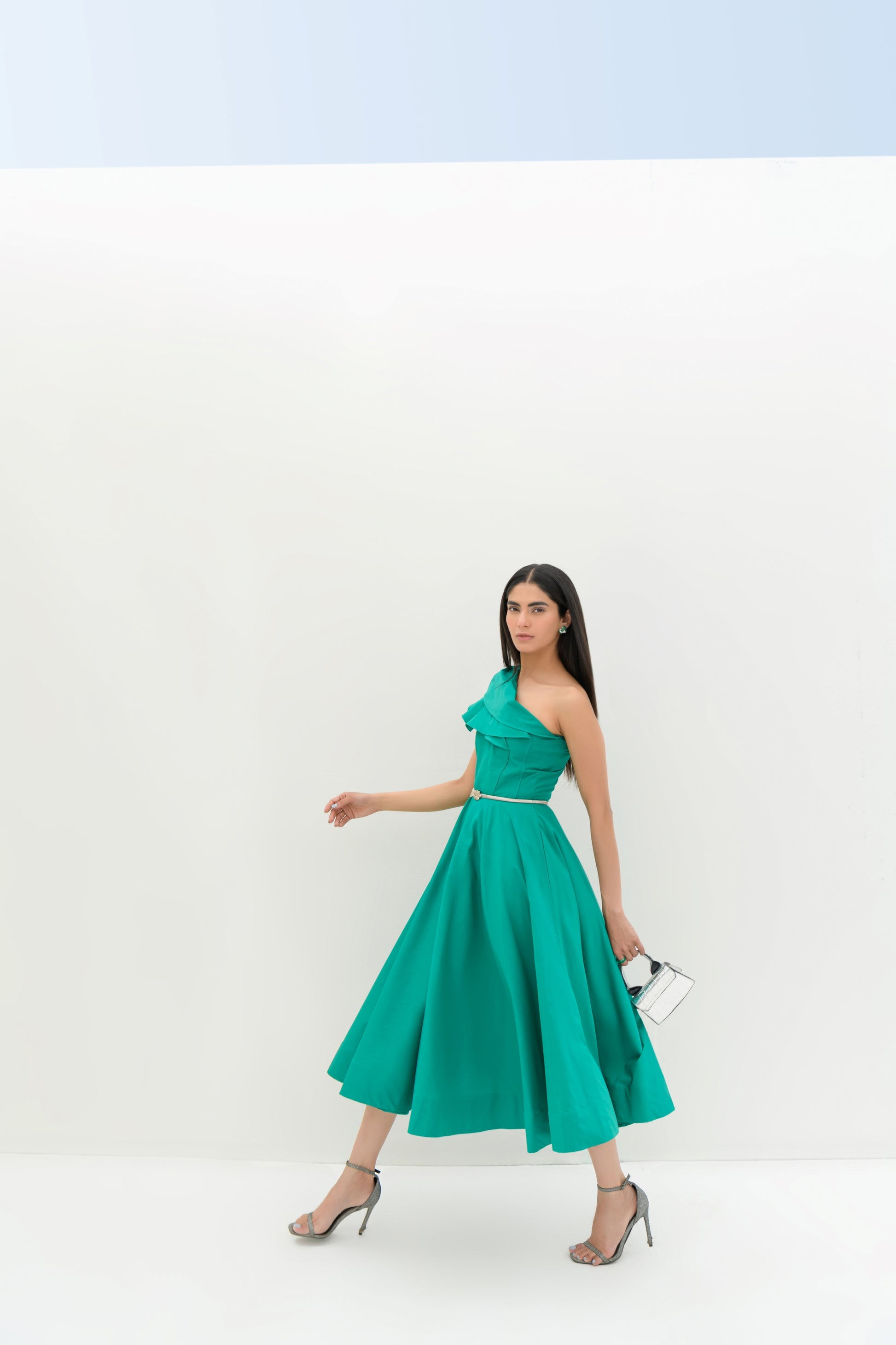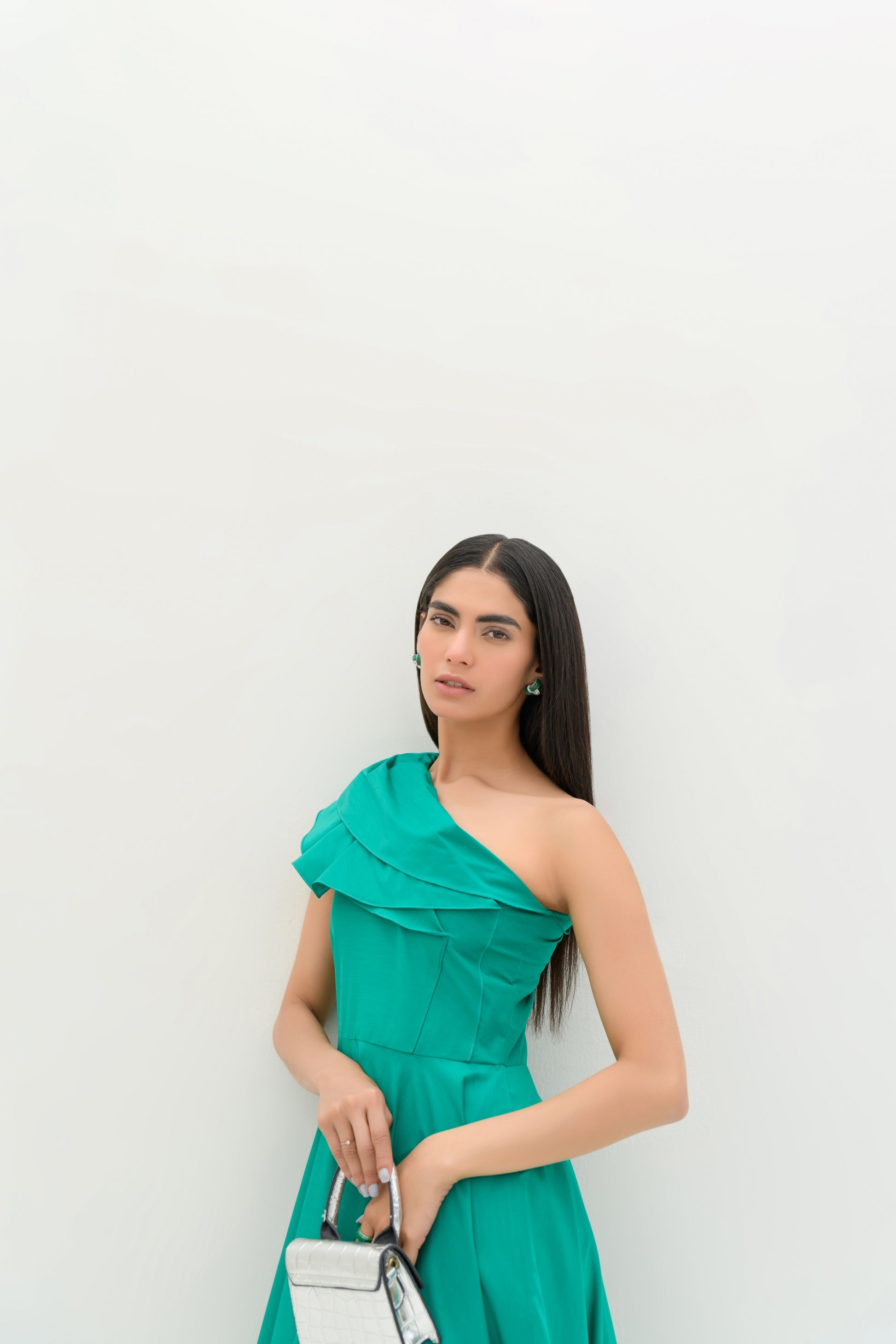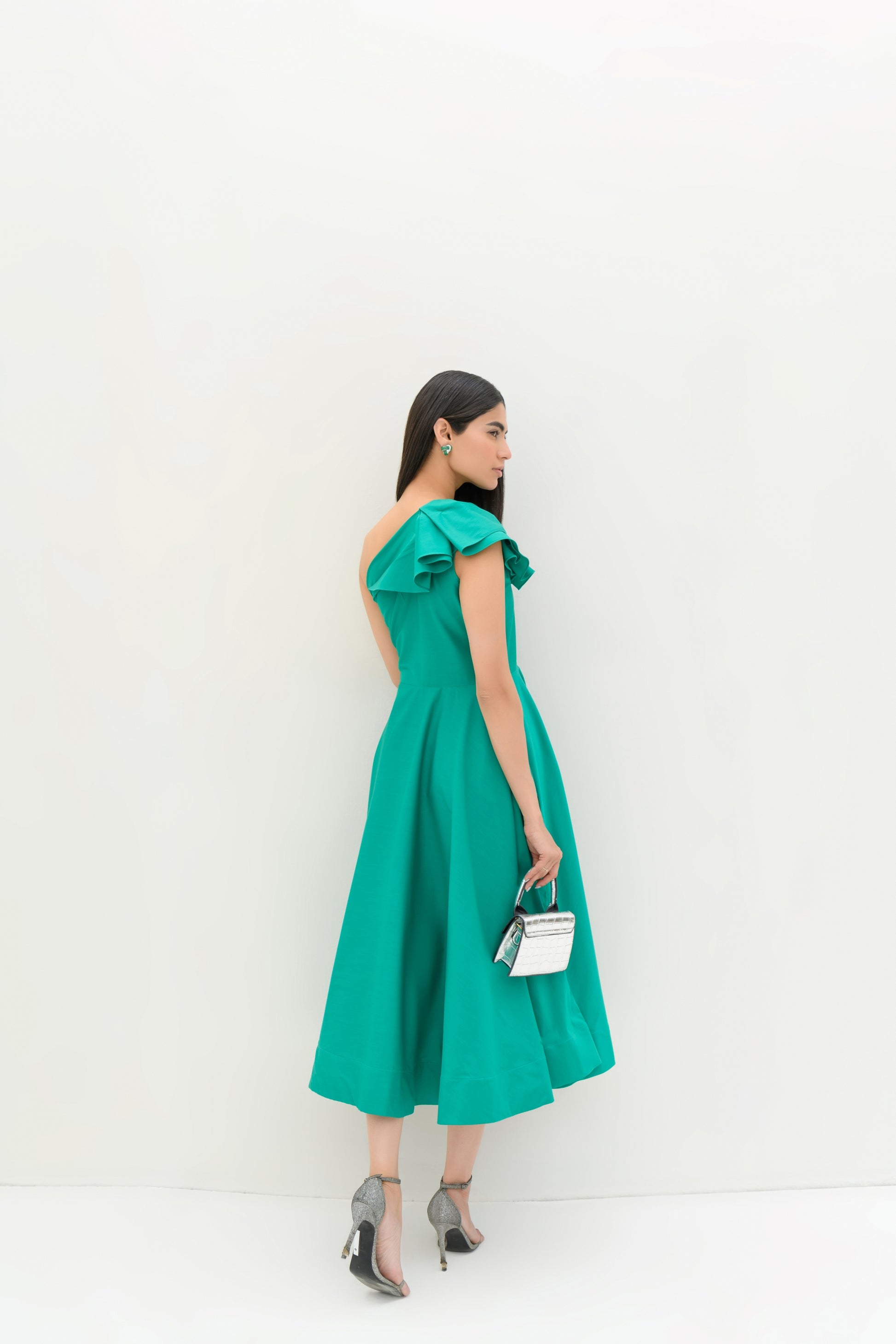 This stunning casual wear is designed to evoke a sense of effortless elegance, perfect for both casual and formal gatherings. Featuring a one-shoulder ruffled neckline, this stylish midi dress adds a playful yet refined touch to your look.