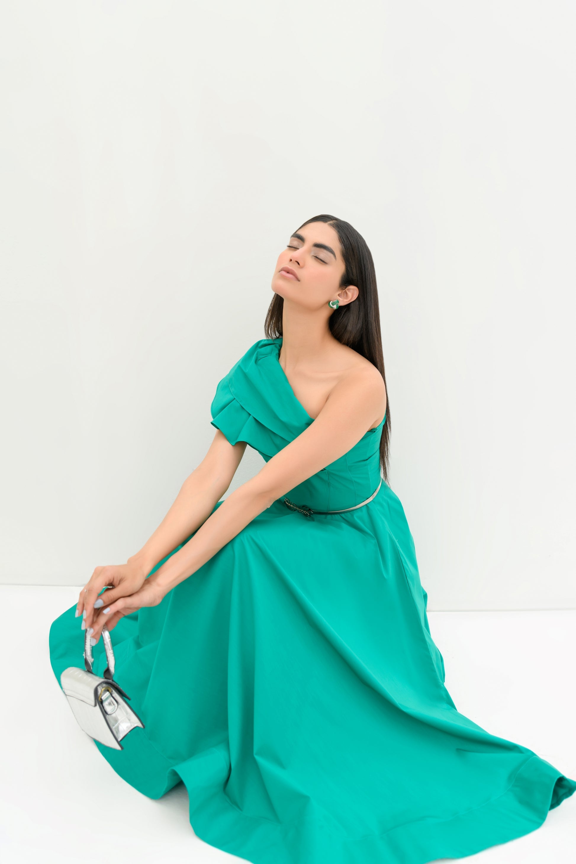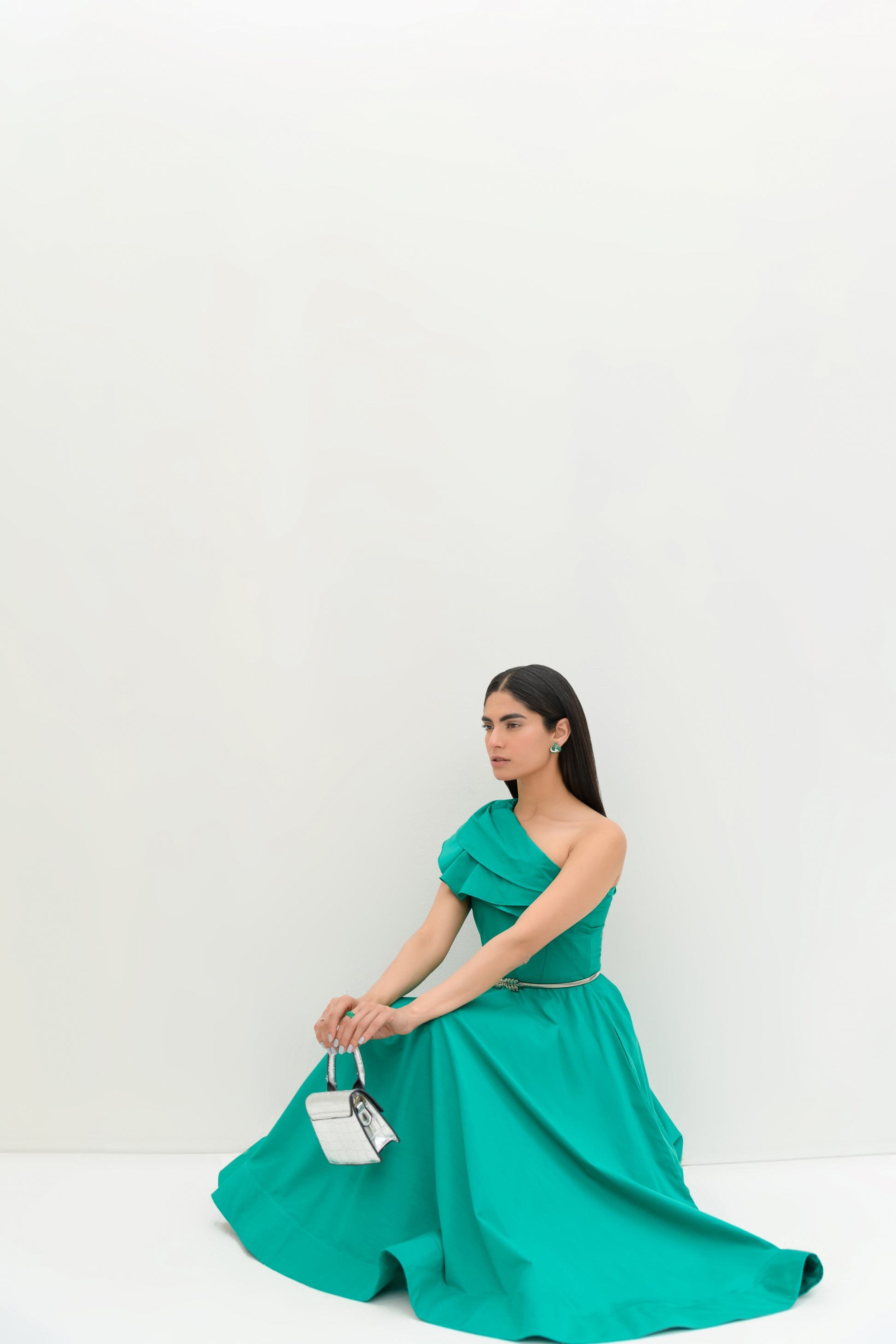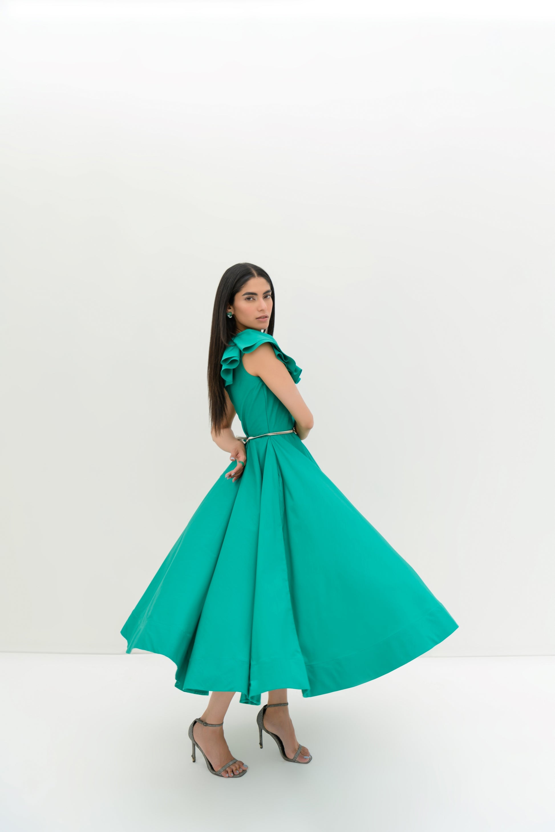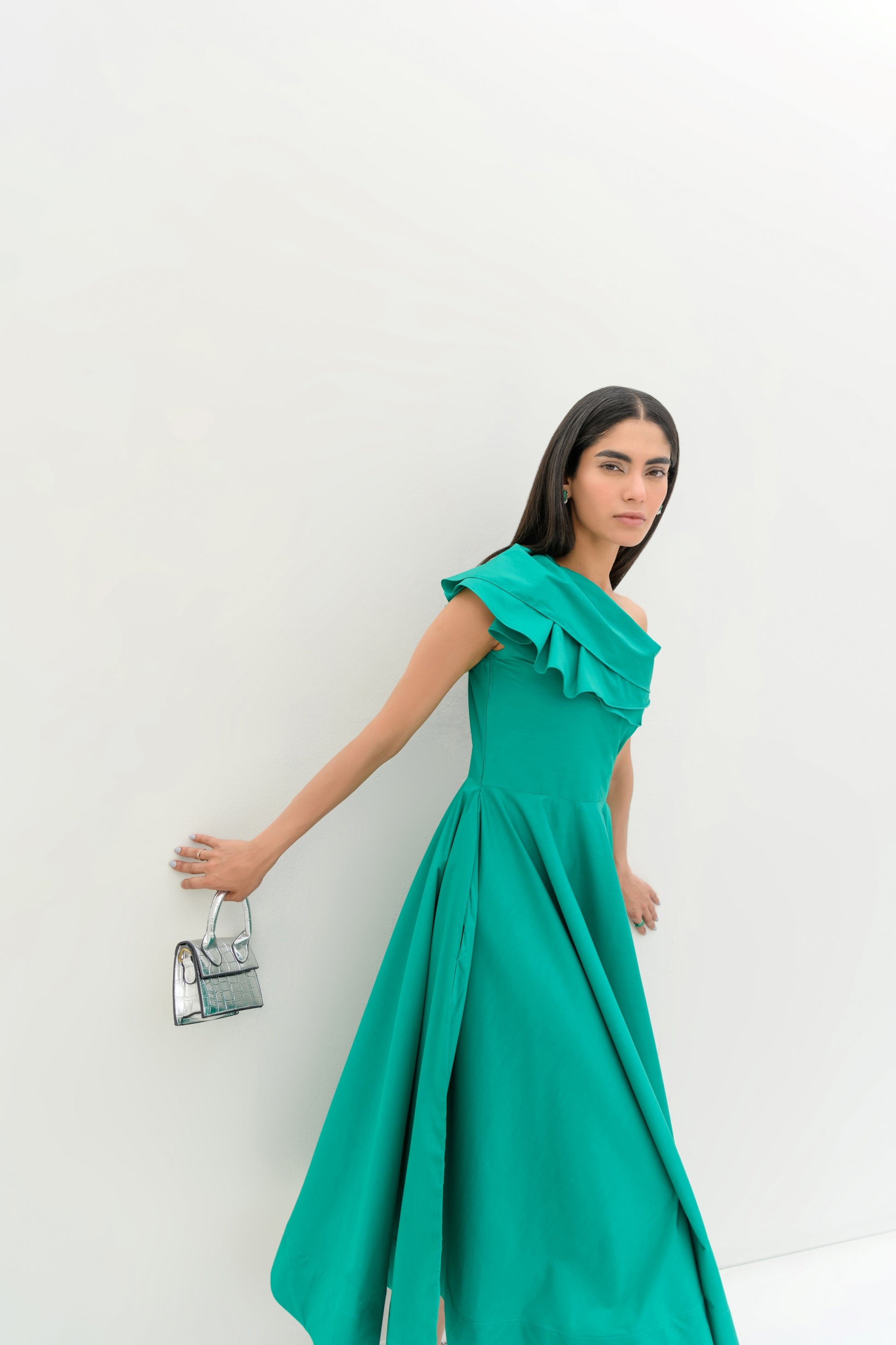 This stunning casual wear is designed to evoke a sense of effortless elegance, perfect for both casual and formal gatherings. Featuring a one-shoulder ruffled neckline, this stylish midi dress adds a playful yet refined touch to your look.