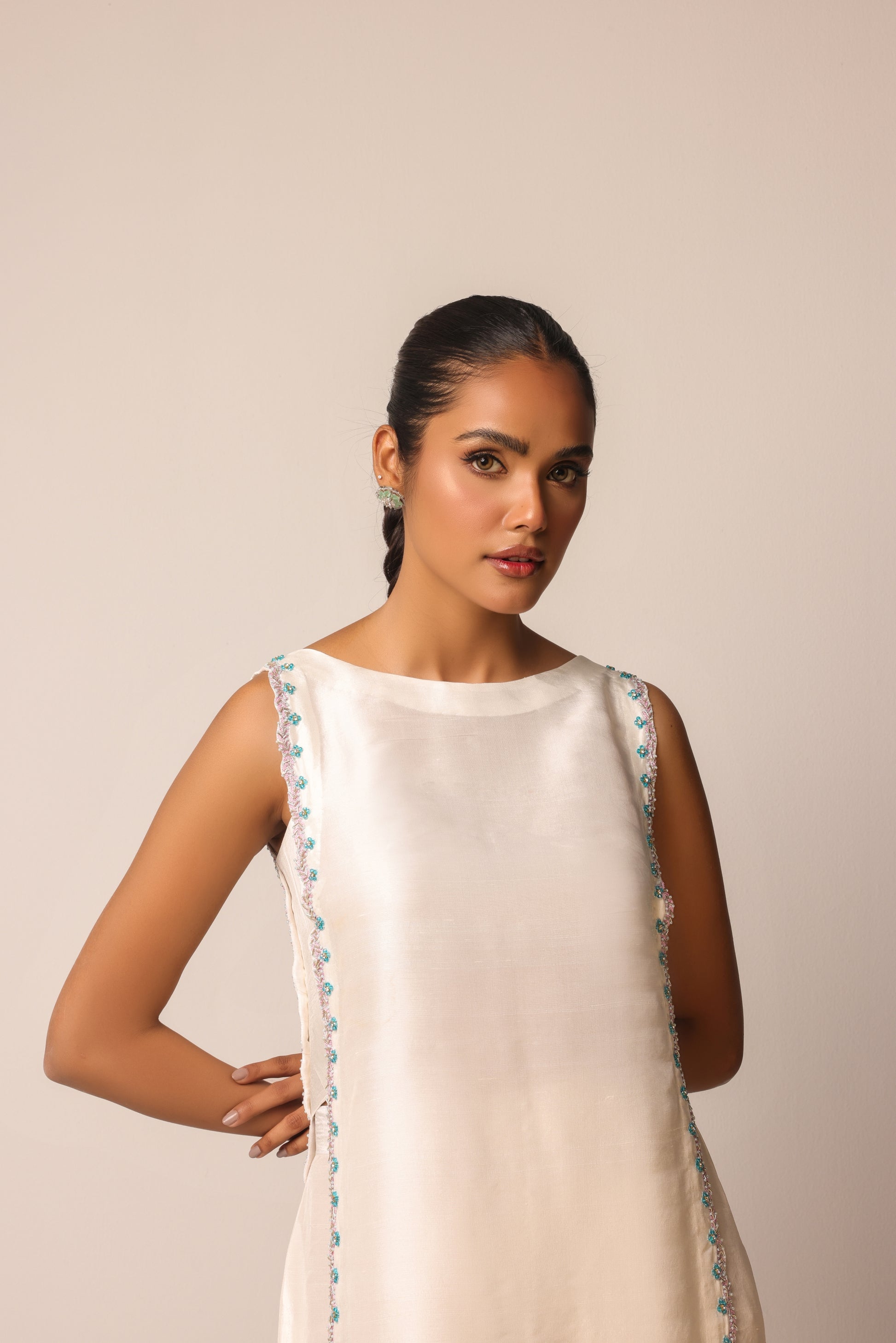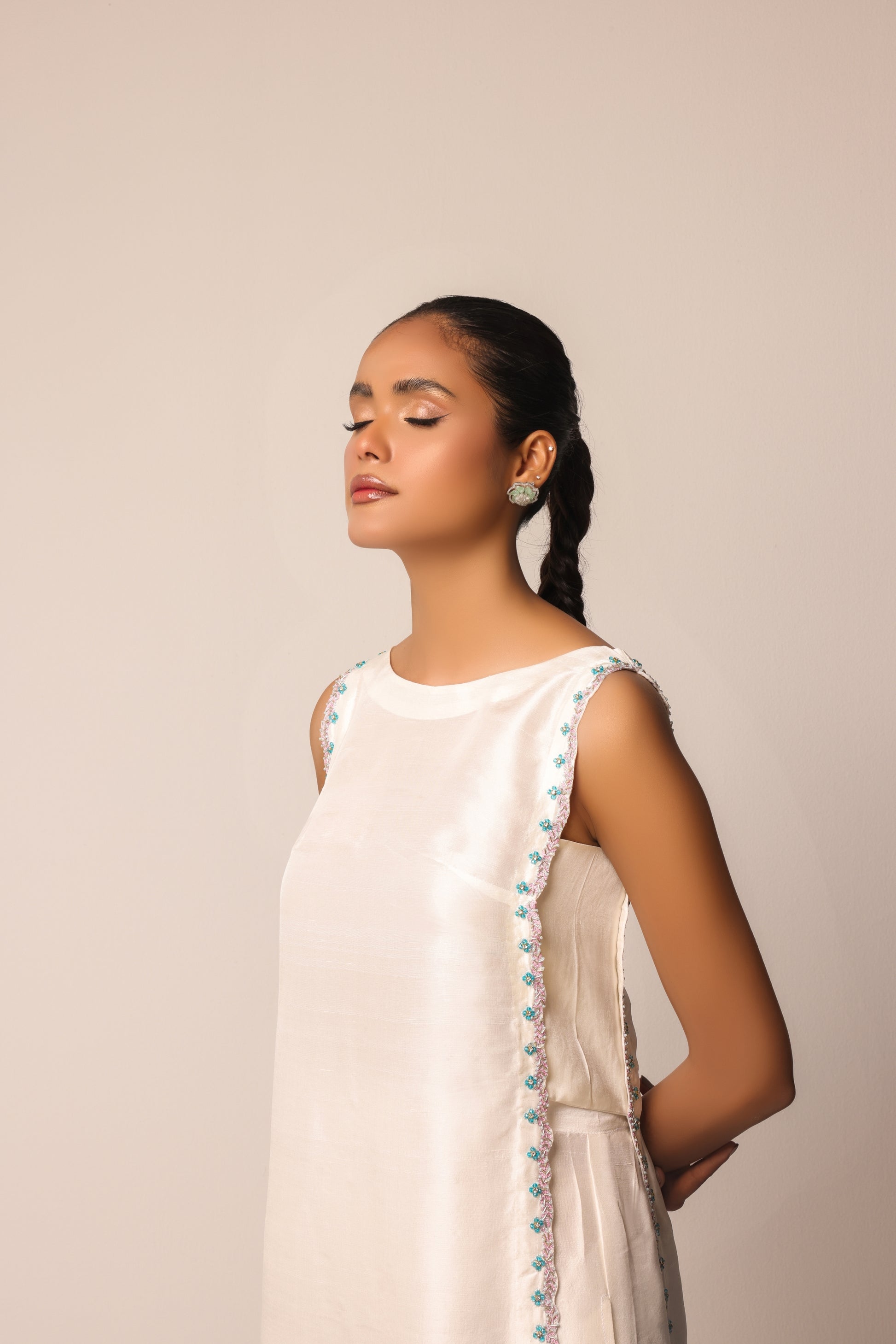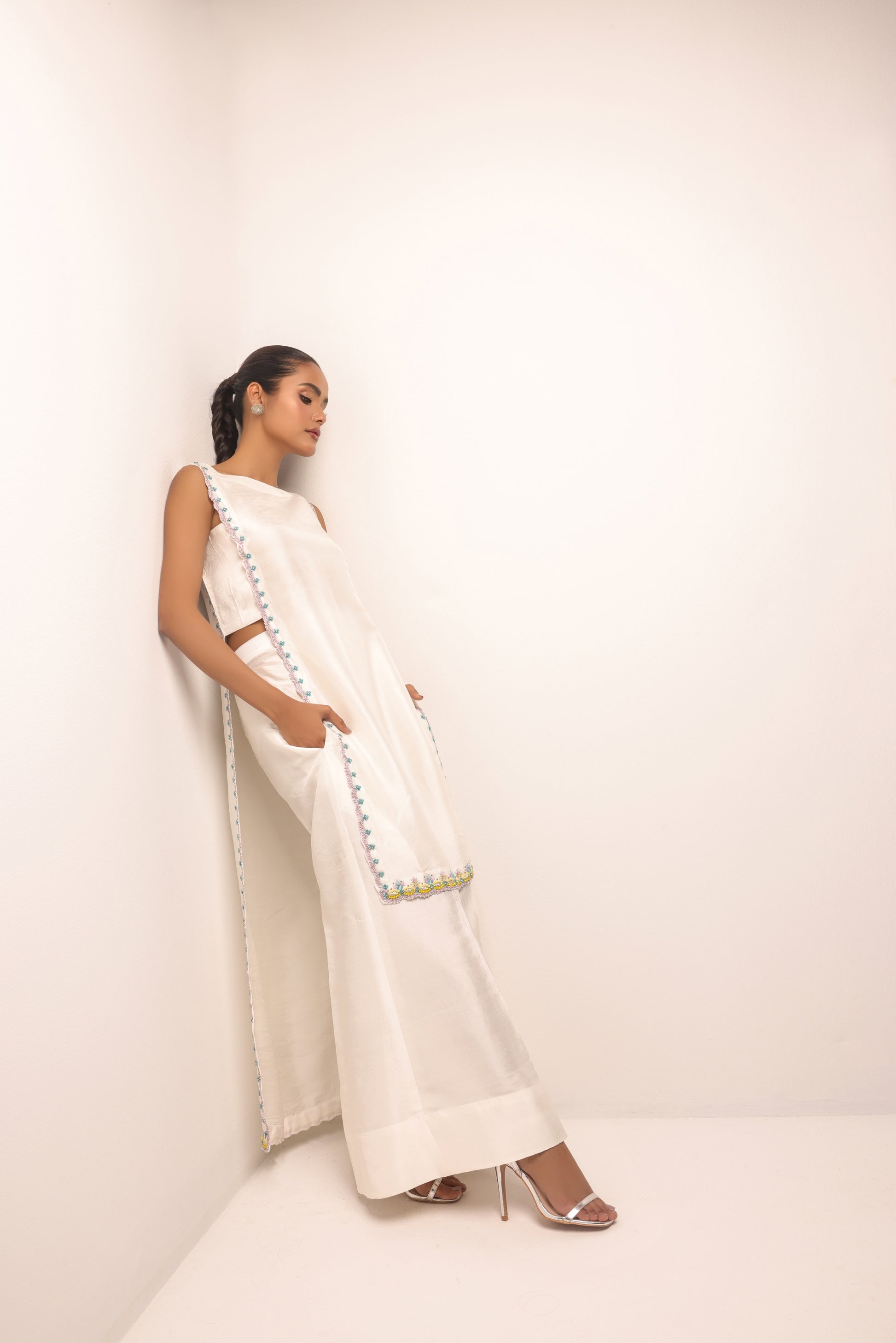 This outfit is contemporary and refined take on minimalist fashion. This designer dress with a long straight cut and an extended panel one side, giving a modern look.