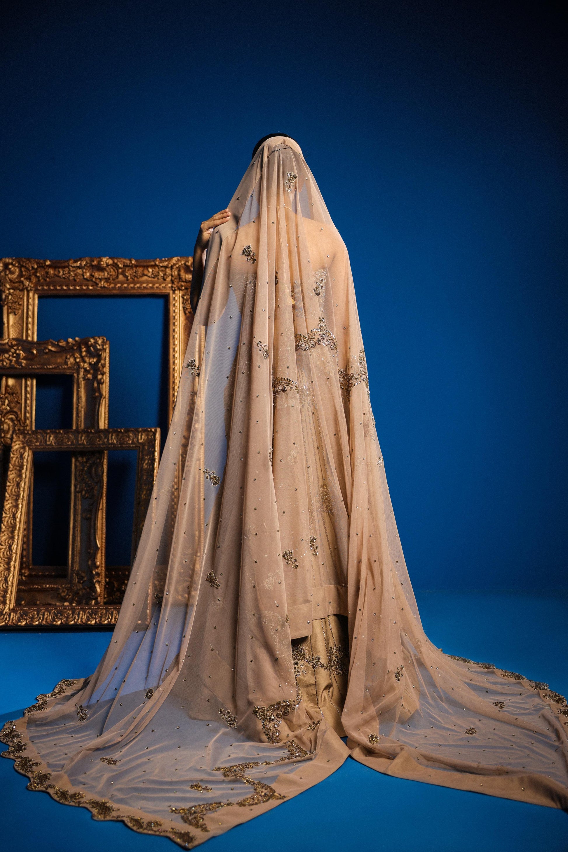 · Intricate hand embroidery with detailed embellishments in metallic tones, including Austin Swarovski, sequins, and threadwork