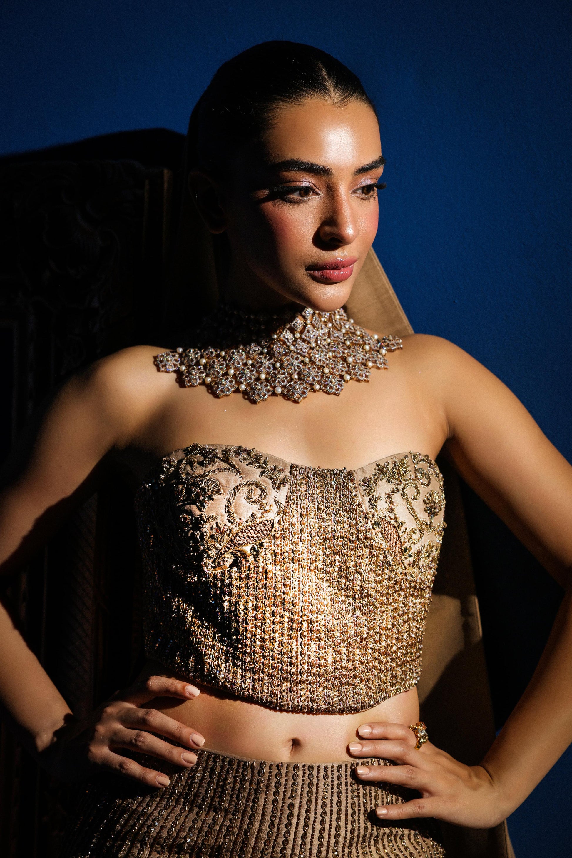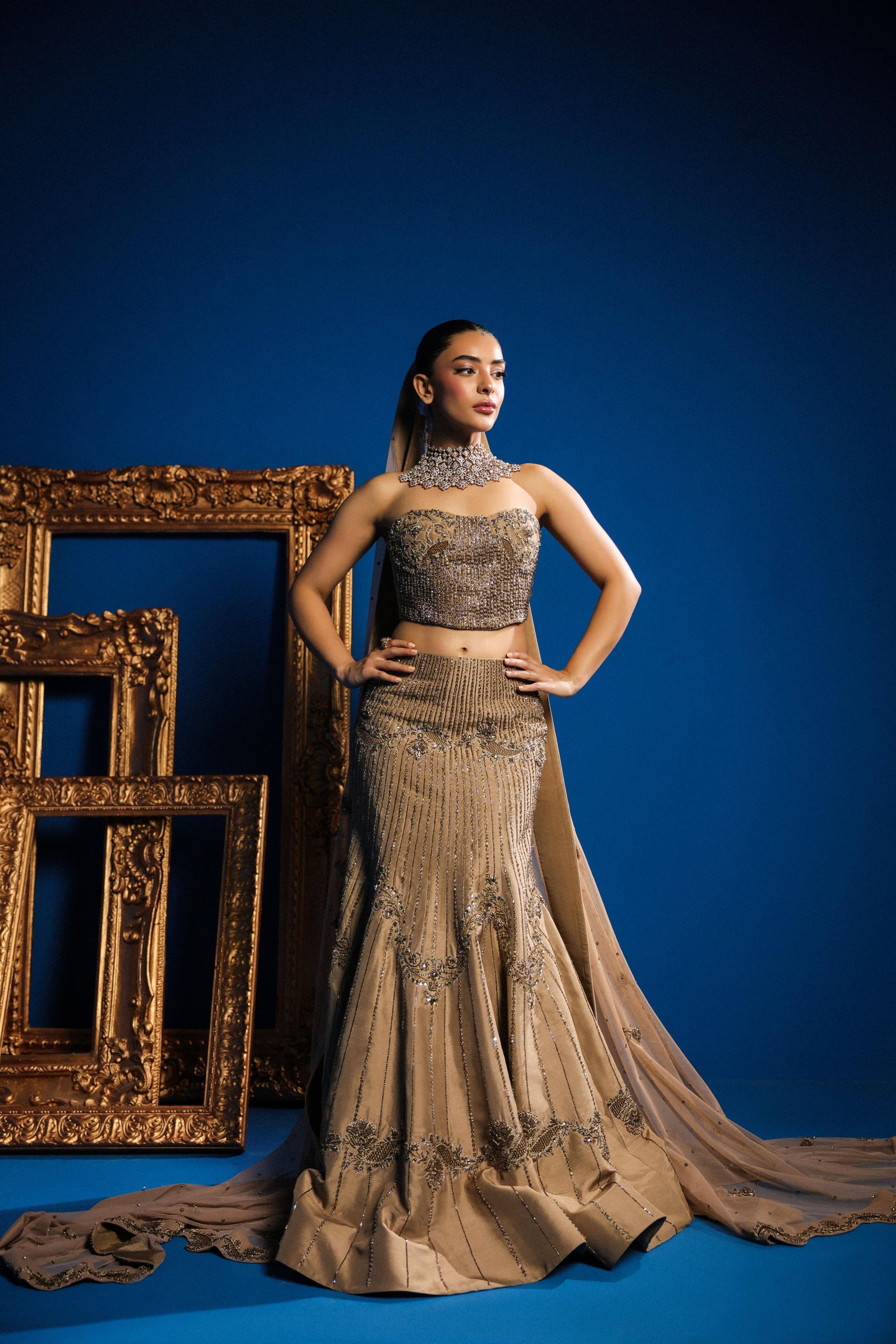 Presenting our luxurious bridal couture ensemble, a vision of opulence and refined sophistication. This breathtaking outfit features a shimmering champagne-gold hue that exudes timeless glamour. The strapless blouse is intricately adorned with Austin Swarovski, beadwork and sequin embellishments, creating a rich tapestry of sparkle and texture. Complementing the blouse, the fitted mermaid-style skirt gracefully flares out into an elegant train, showcasing exquisite hand embroidery and delicate beadwork that glimmers with every movement.
