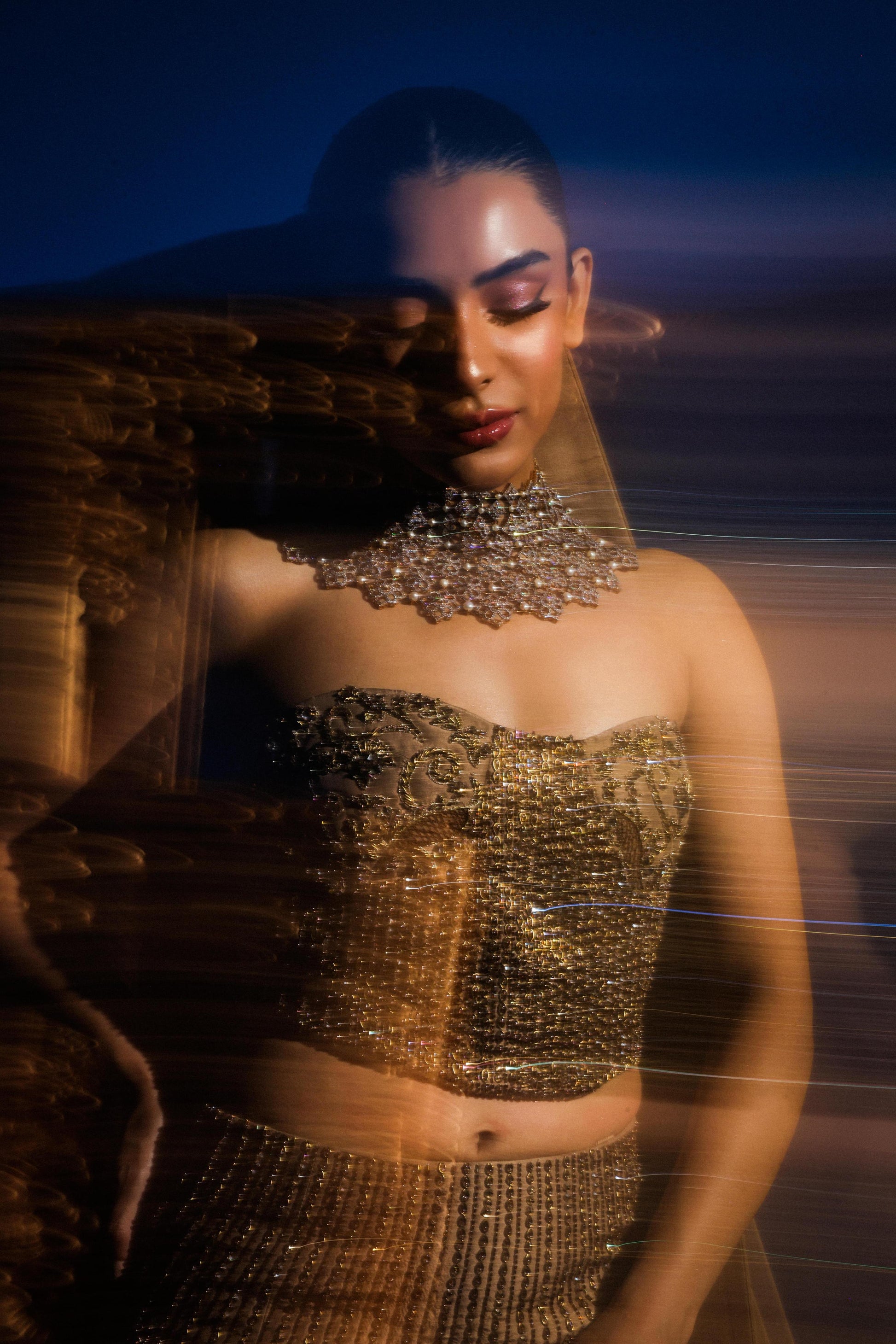 · Embellished champagne gold bridal set is crafted in a premium fabric