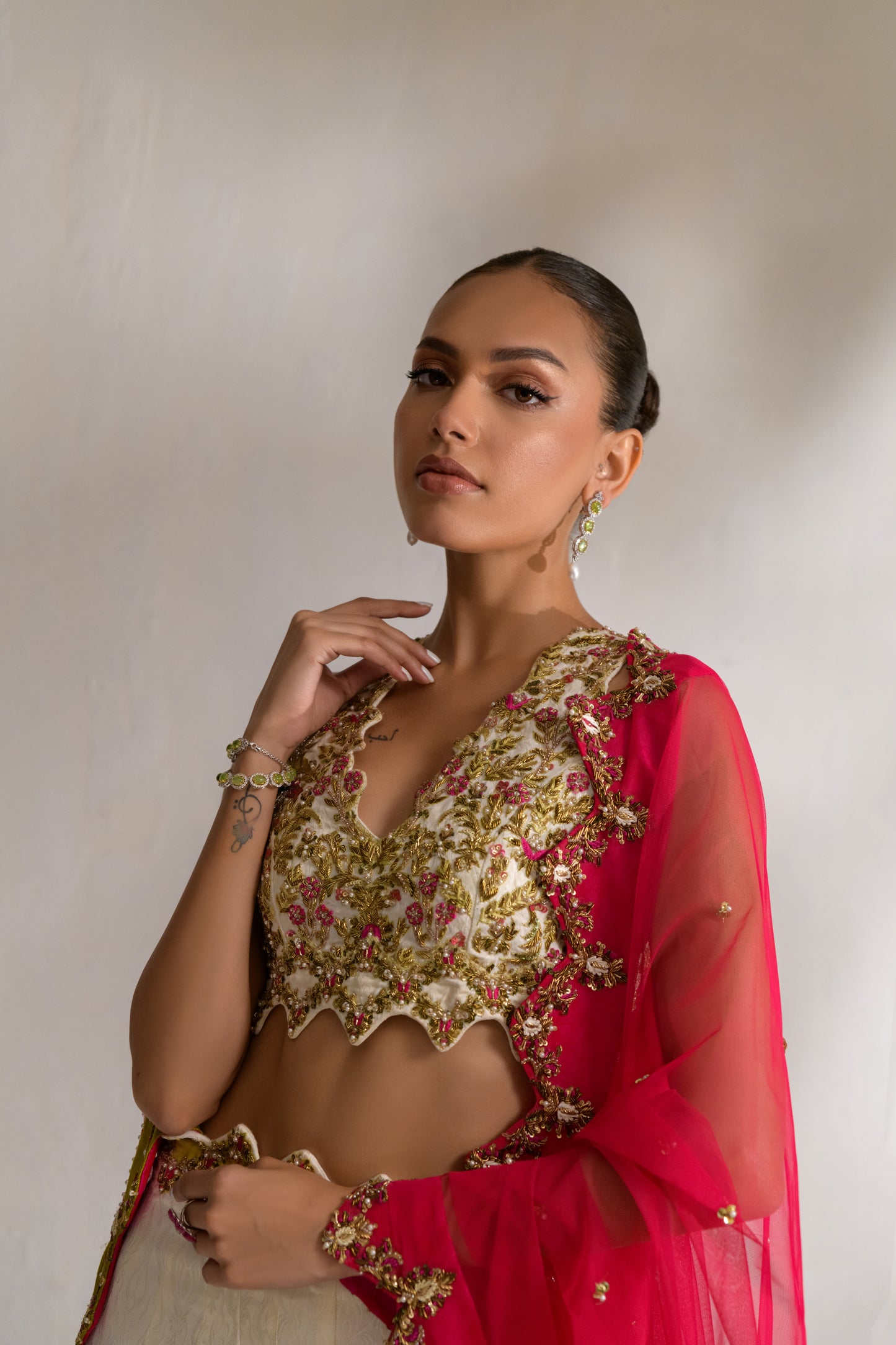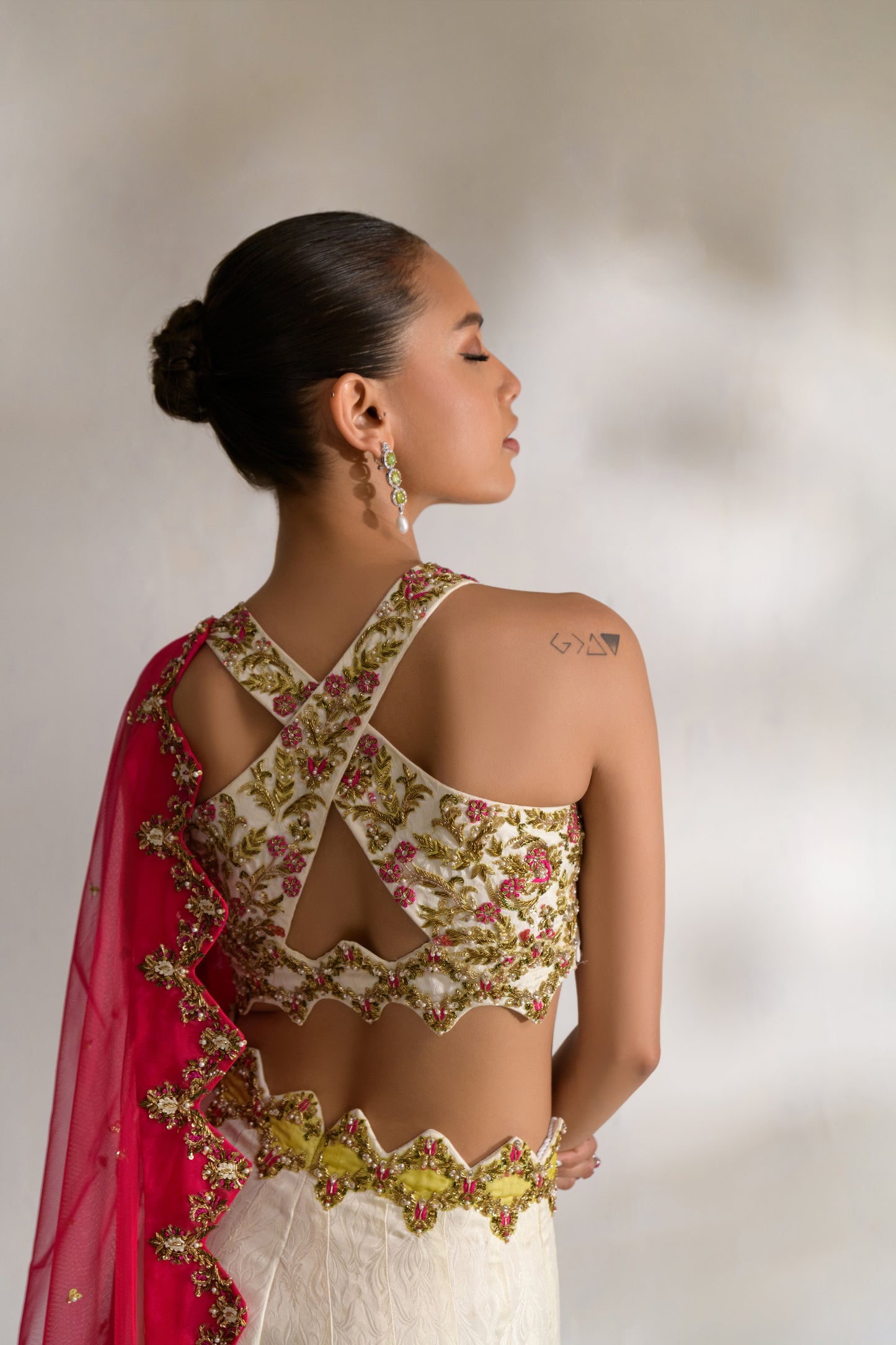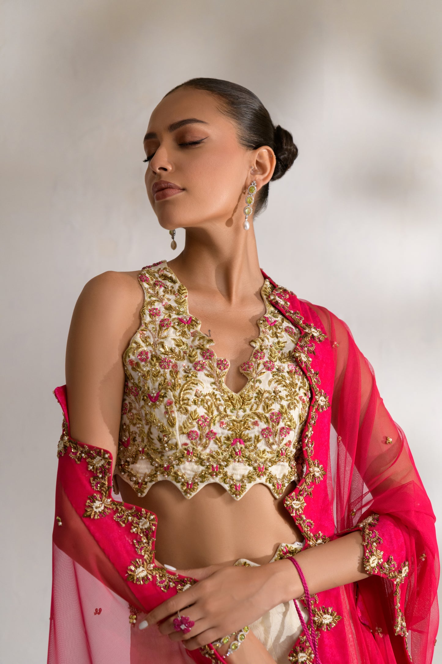 · Intricate floral and golden embroidery on the blouse and lehnga
