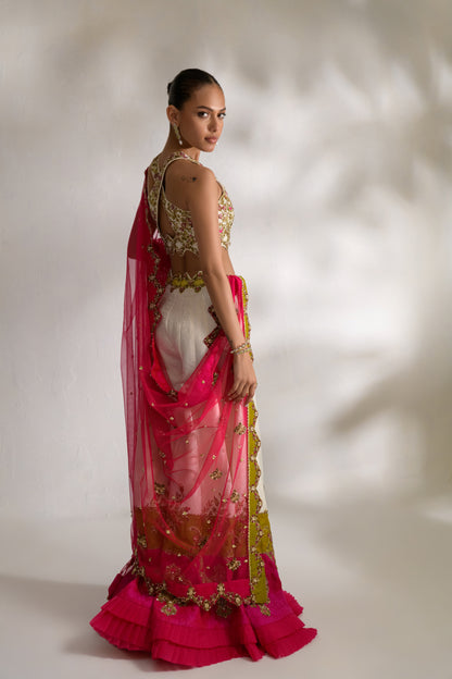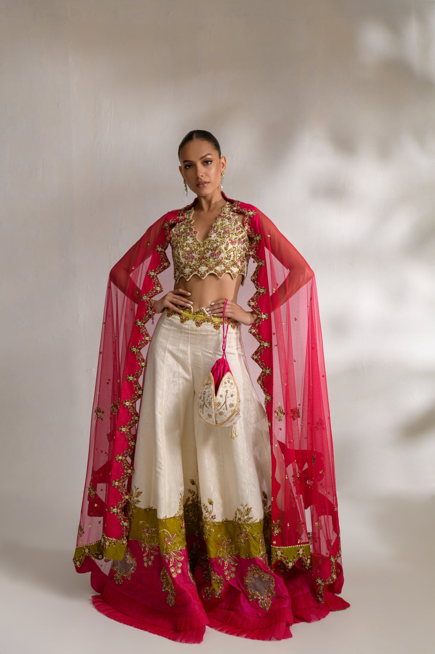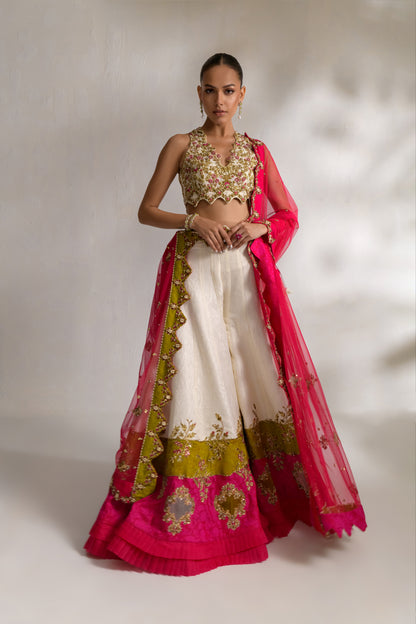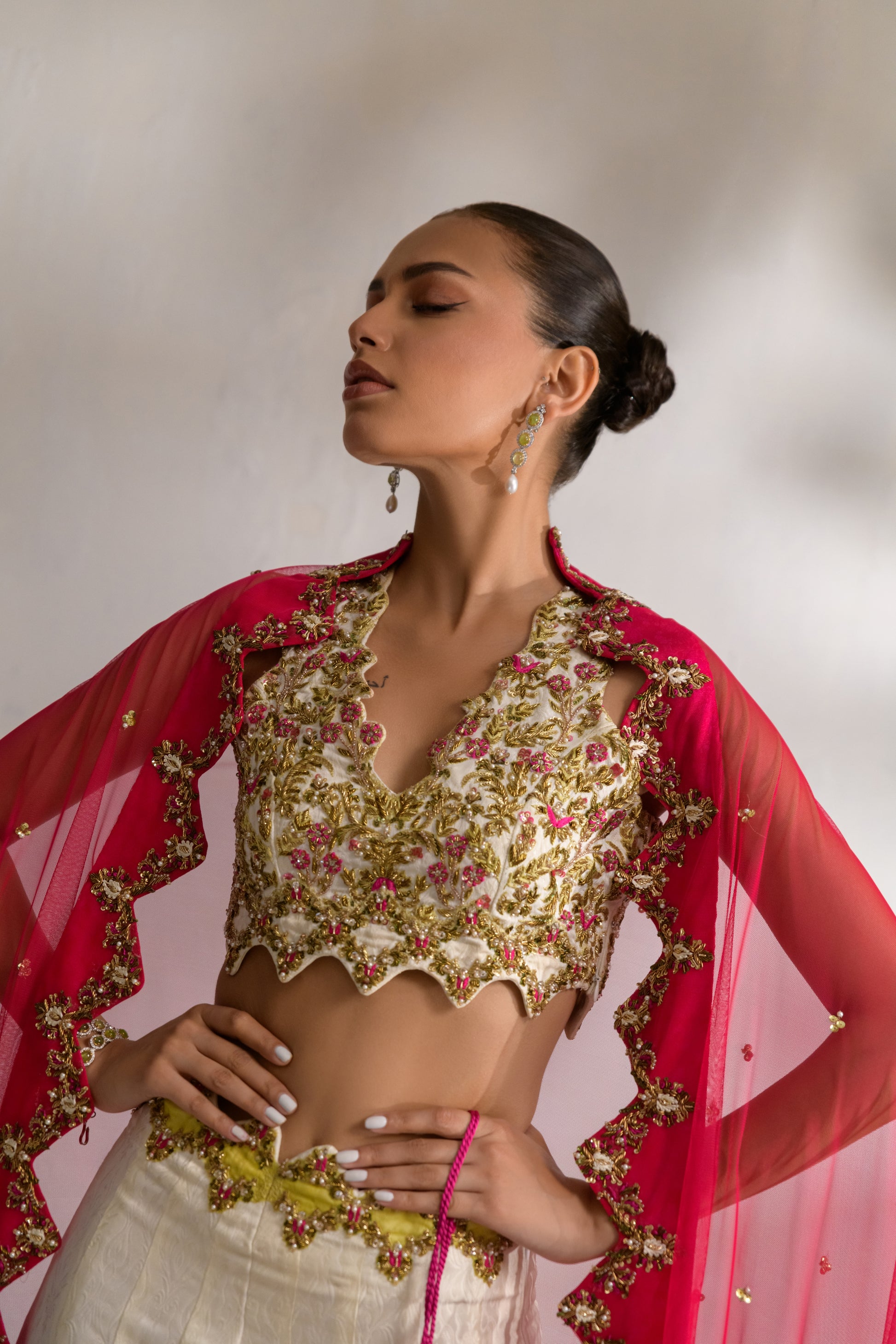 · Intricate floral and golden embroidery on the blouse and lehnga